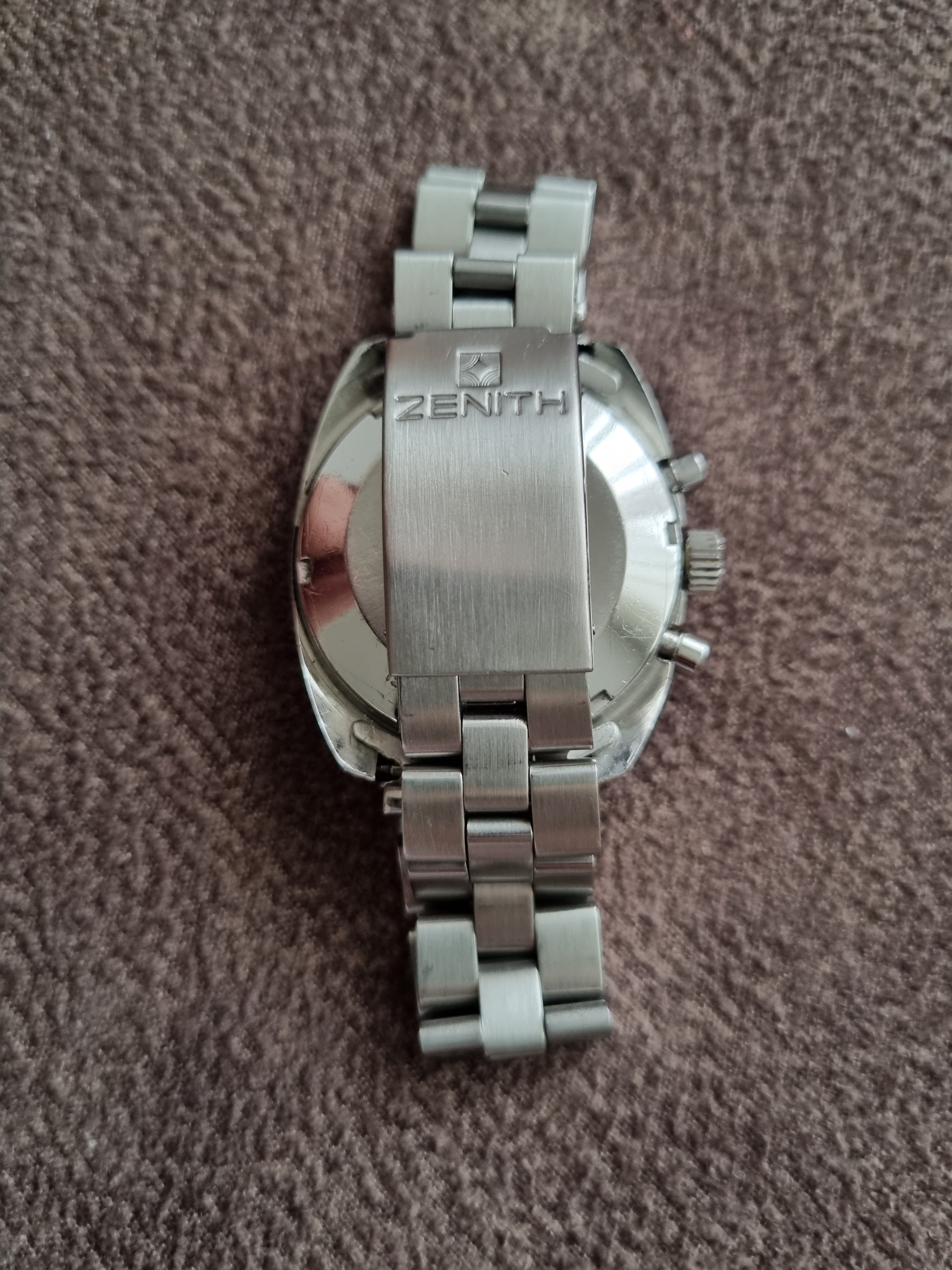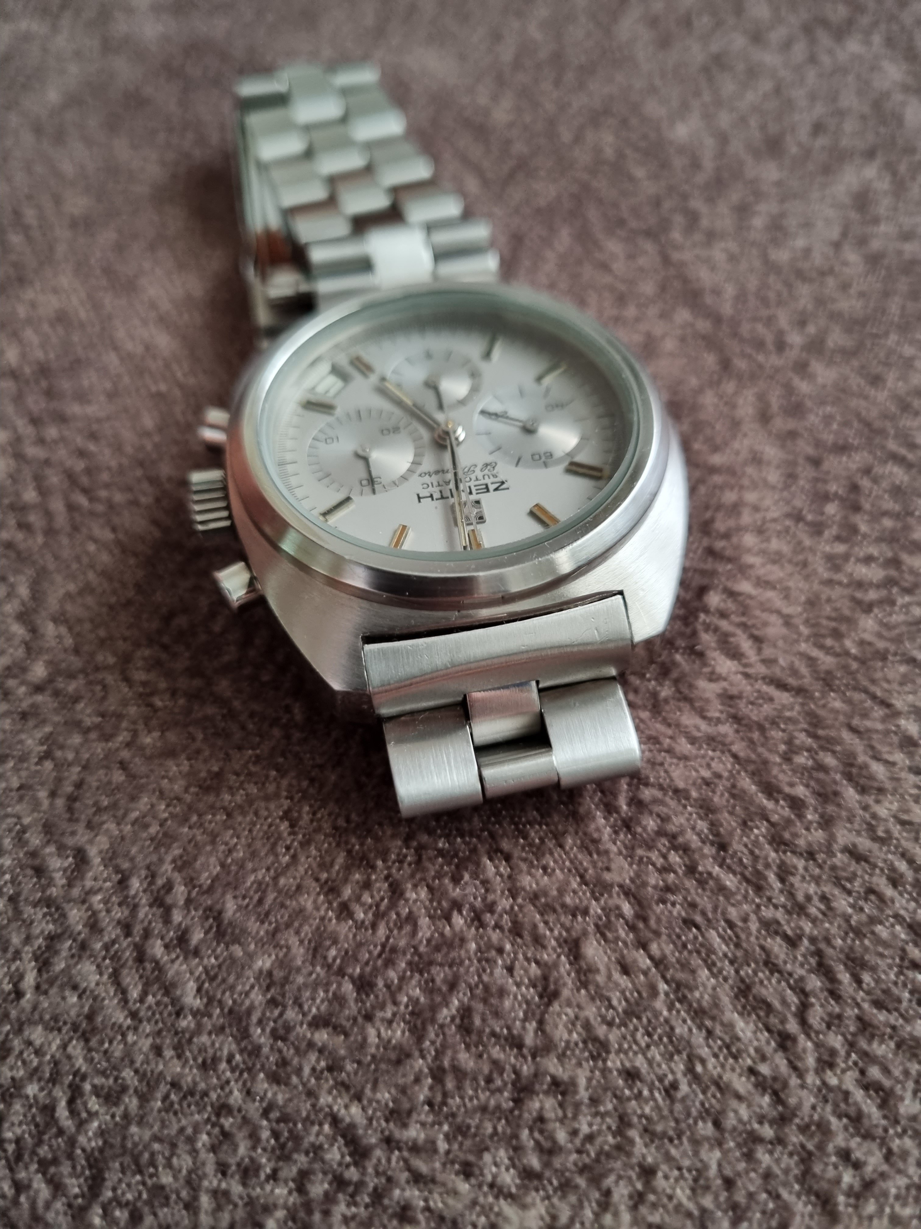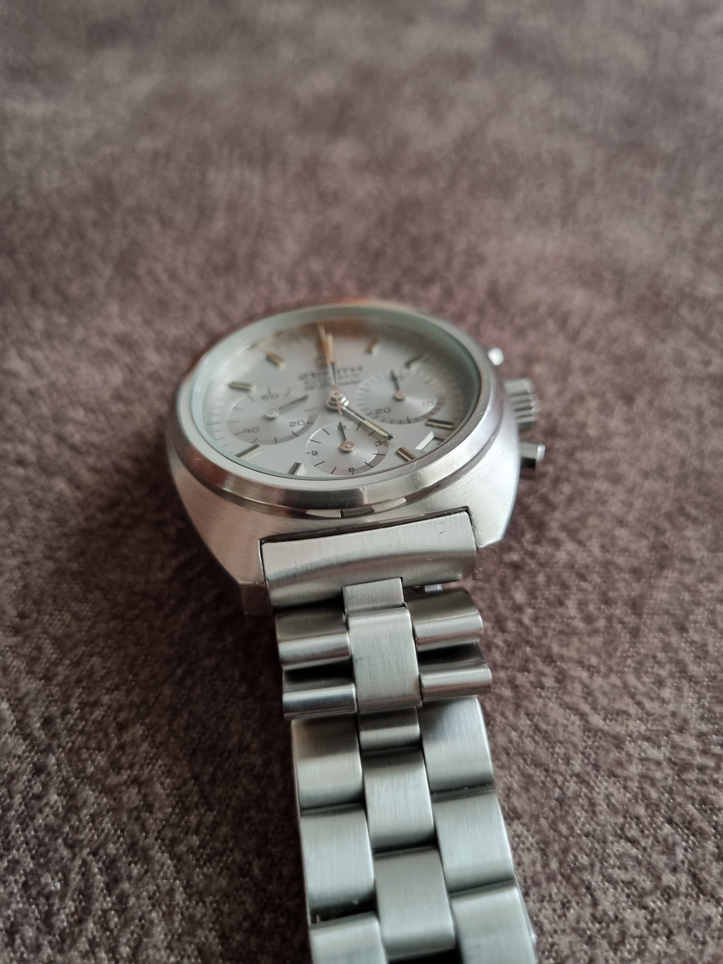 The watch was produced between 1972 and 1974 and only 4,000 pieces were produced, which gives it a great collector's value. The watch comes on its original Zenith bracelet sufficient for larger (up to 18.5mm) wrists. Serviced and slightly polished in 2018 by former owner, it keeps the time great, resets to zero and has a good power reserve.