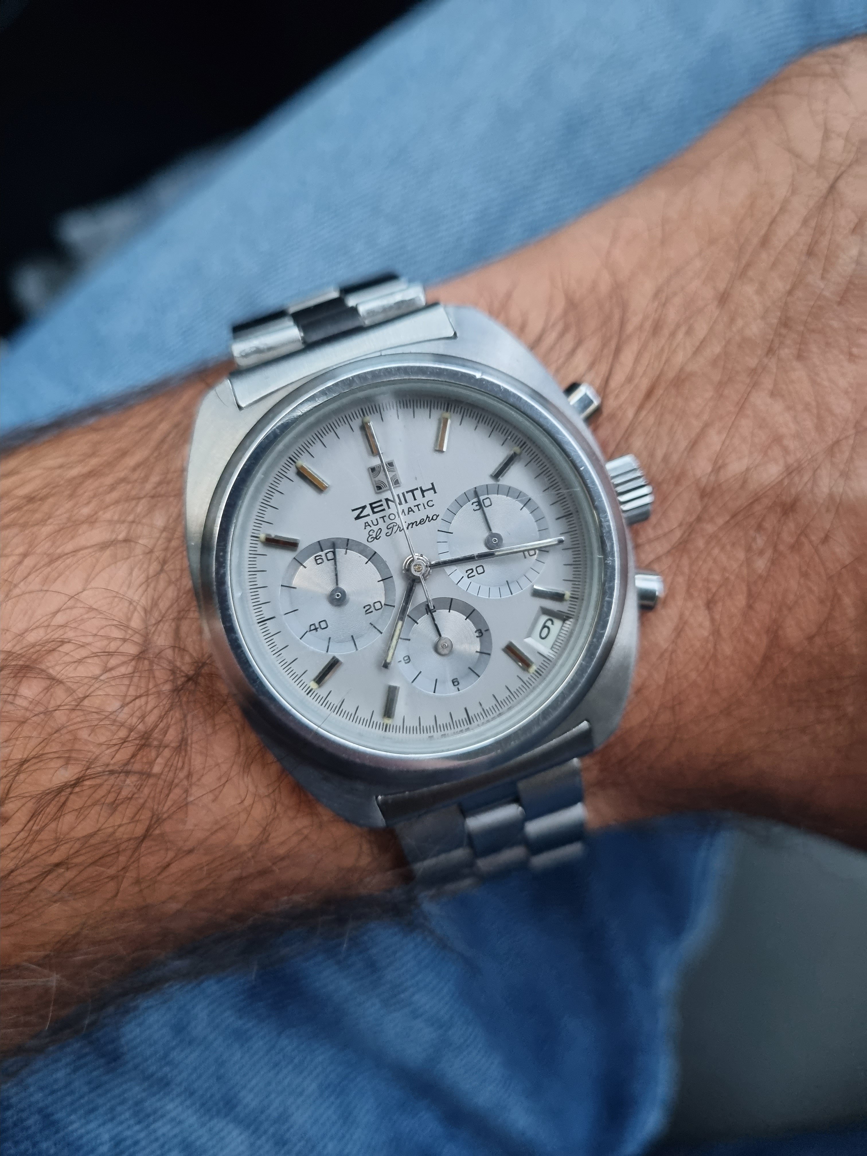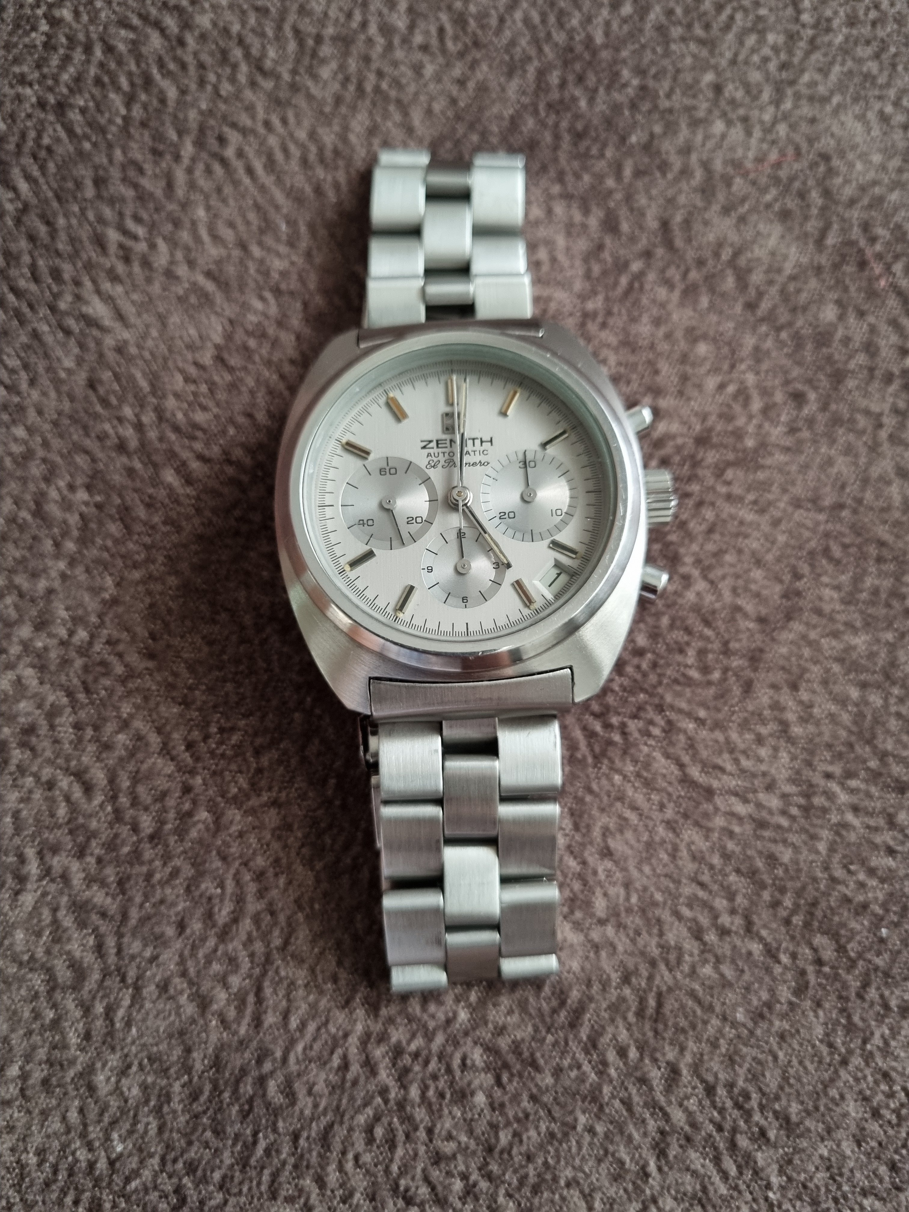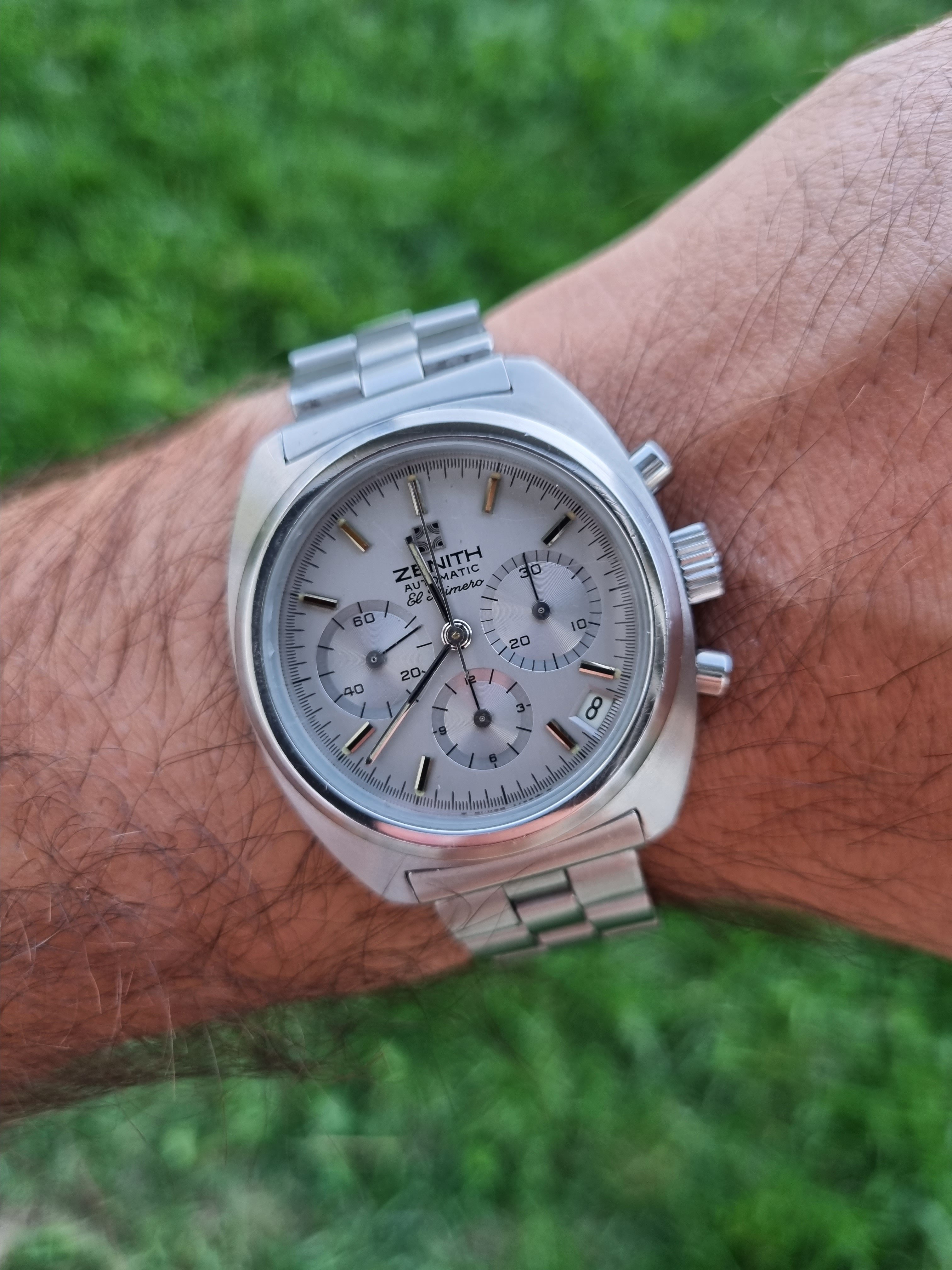 The watch was produced between 1972 and 1974 and only 4,000 pieces were produced, which gives it a great collector's value. The watch comes on its original Zenith bracelet sufficient for larger (up to 18.5mm) wrists. Serviced and slightly polished in 2018 by former owner, it keeps the time great, resets to zero and has a good power reserve.