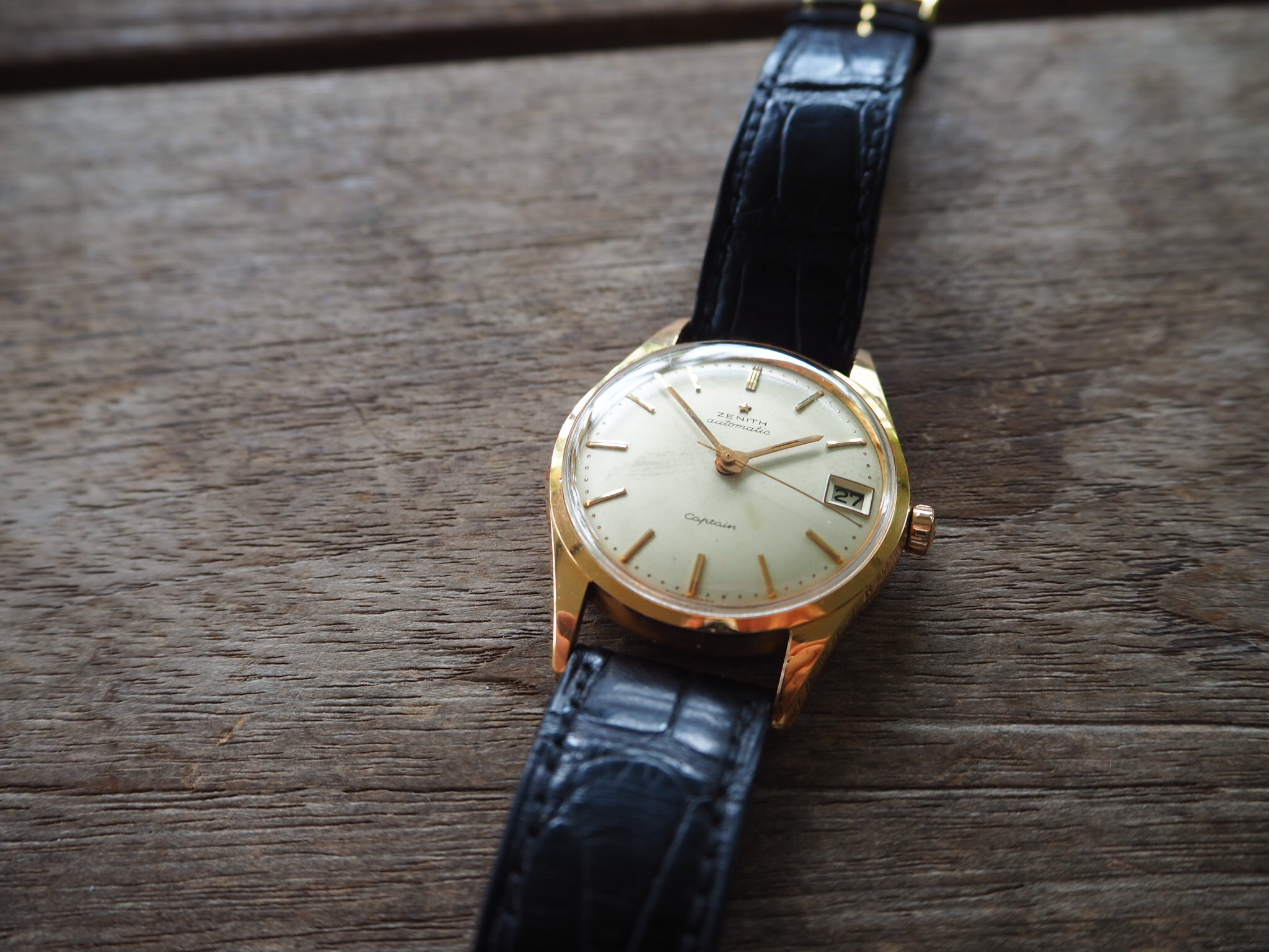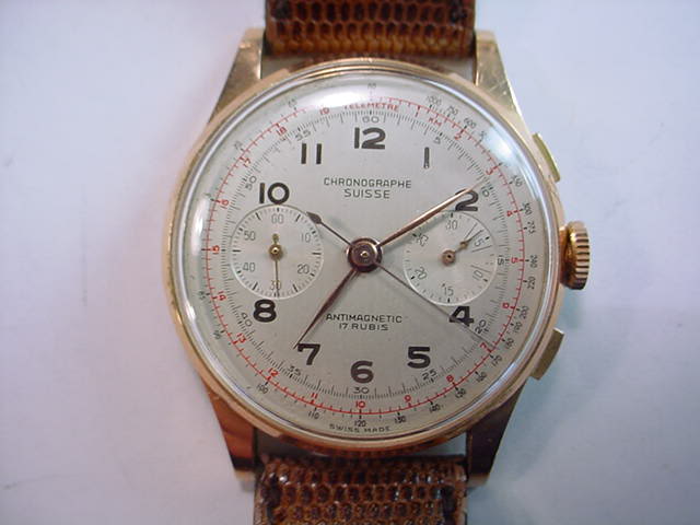 The gold used in the Landeron powered, Chronographe Suisse watches has this very intense color. Much deeper red than a pink or rose gold. This picture does not do it justice.