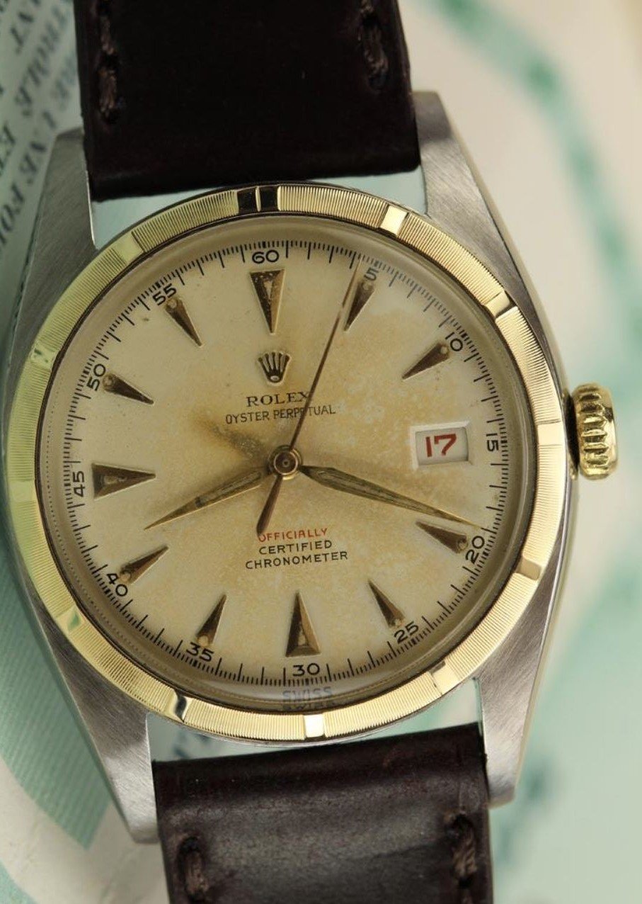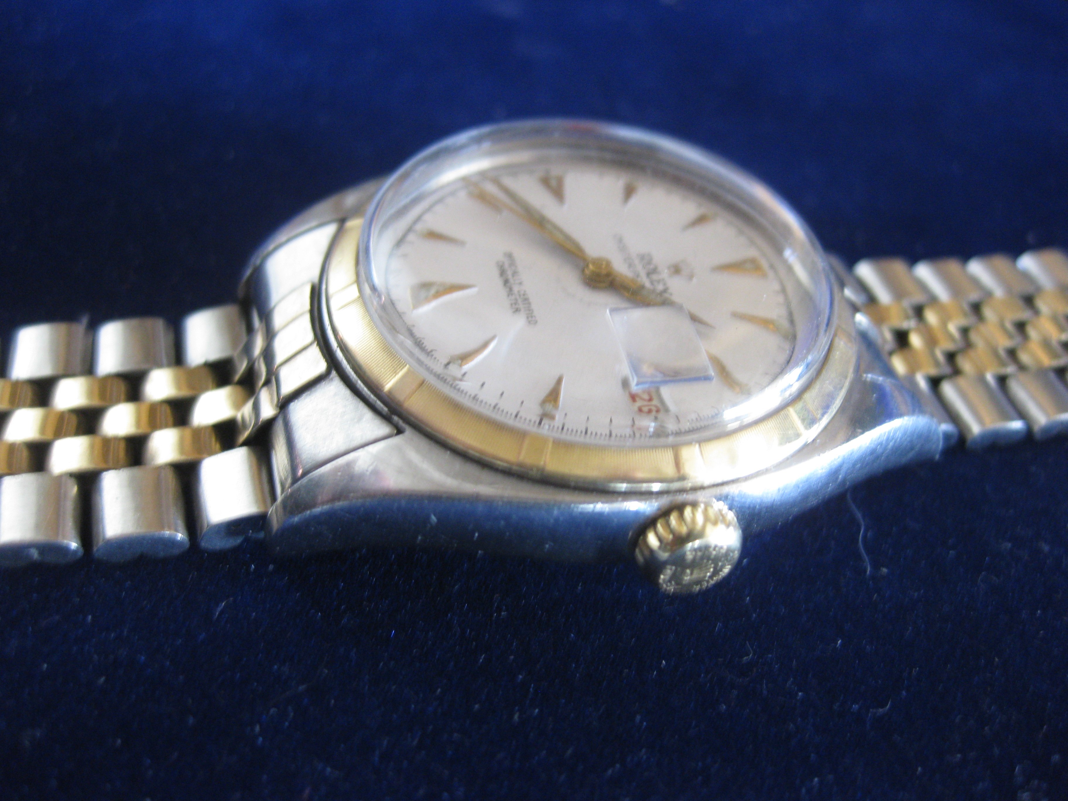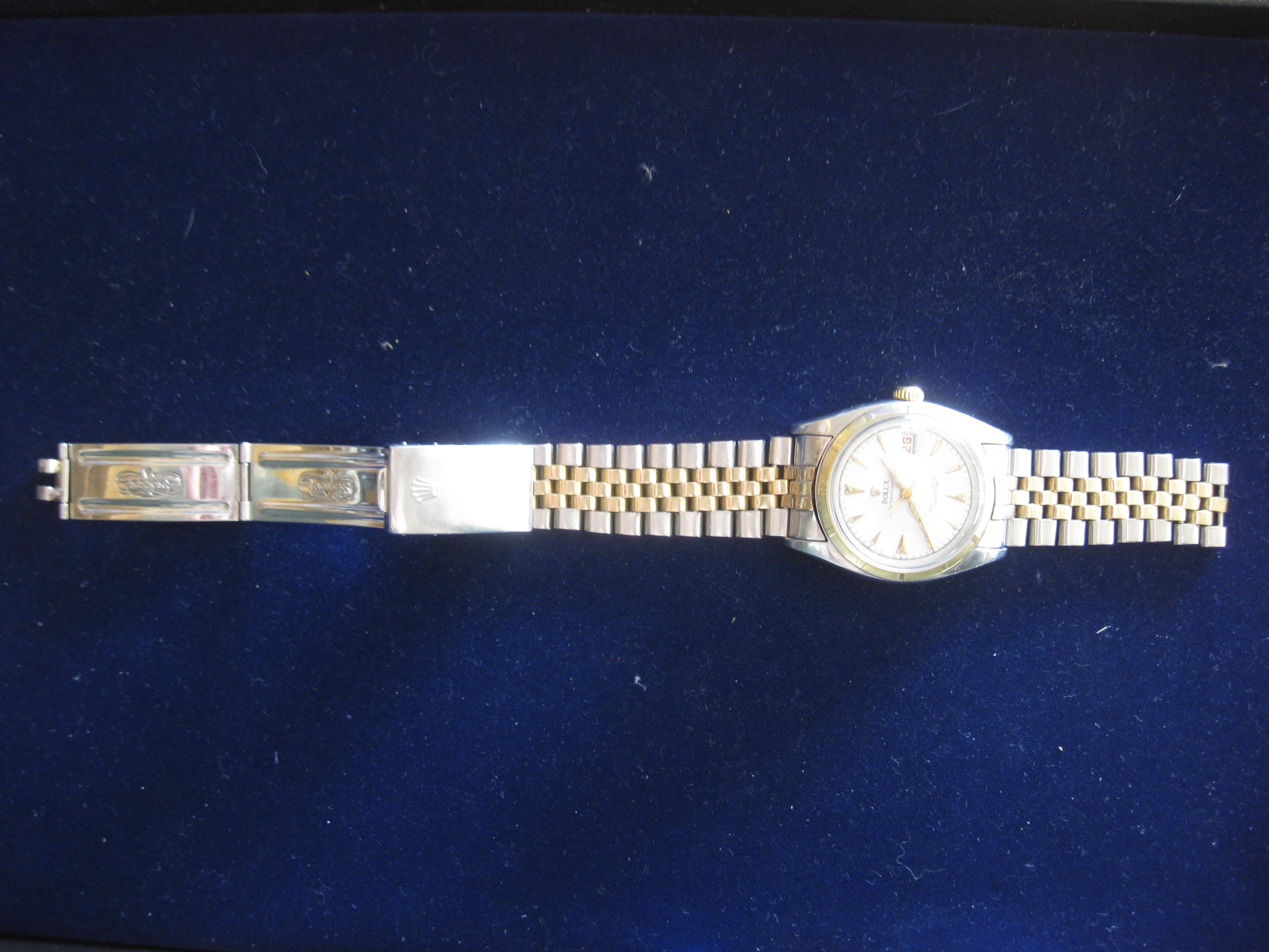 ·I wrote a few posts several months ago regarding dozens of pocket & wrist watches including 3 Rolexes that my father-in-law found in a box that had been in his father’s house when he passed. It turned out that one of the Rolexes is a Korean “Kolex”, but according to Ben Bridge the other 2 are legit. I helped him sell most of the stuff (almost $10K worth of watches, coins, and jewelry) except a few sentimental items and the 2 real Rolexes. He surprised me yesterday with a Christmas gift of one of the Rolexes. He has the paperwork for both of them, but we can’t determine which documents go with which Rolex, so this one was either made in October 1951 or July 1953.