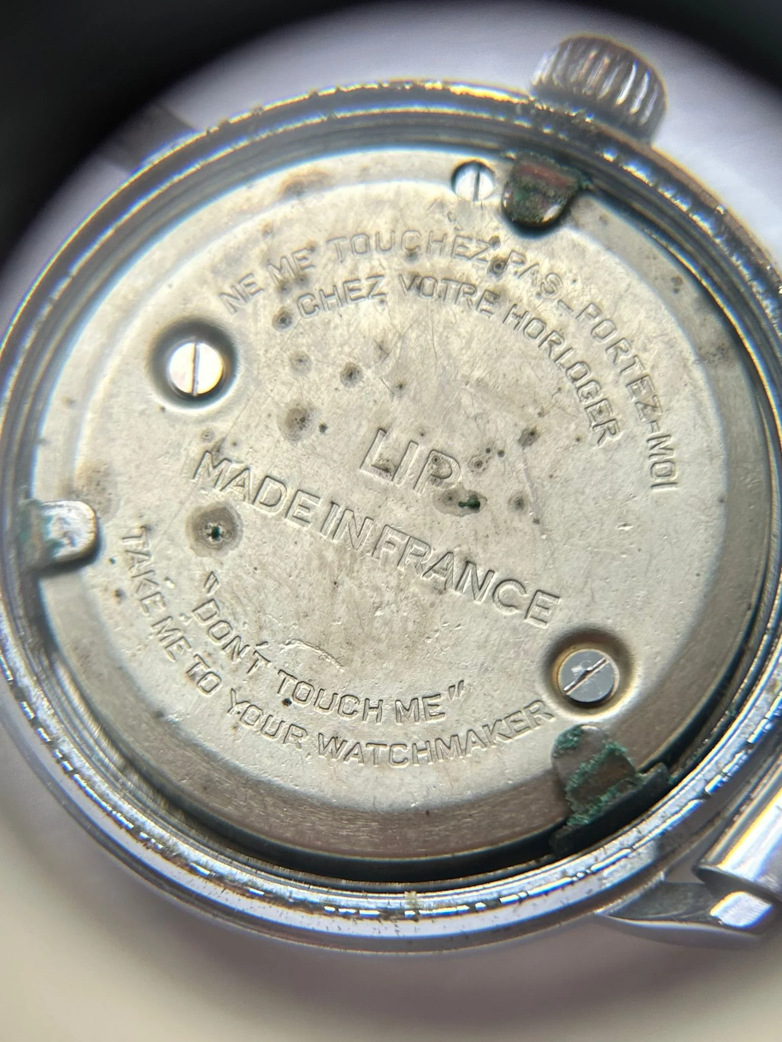 The crown is unsigned, as expected, and inside the caseback is etched the LIP logo: