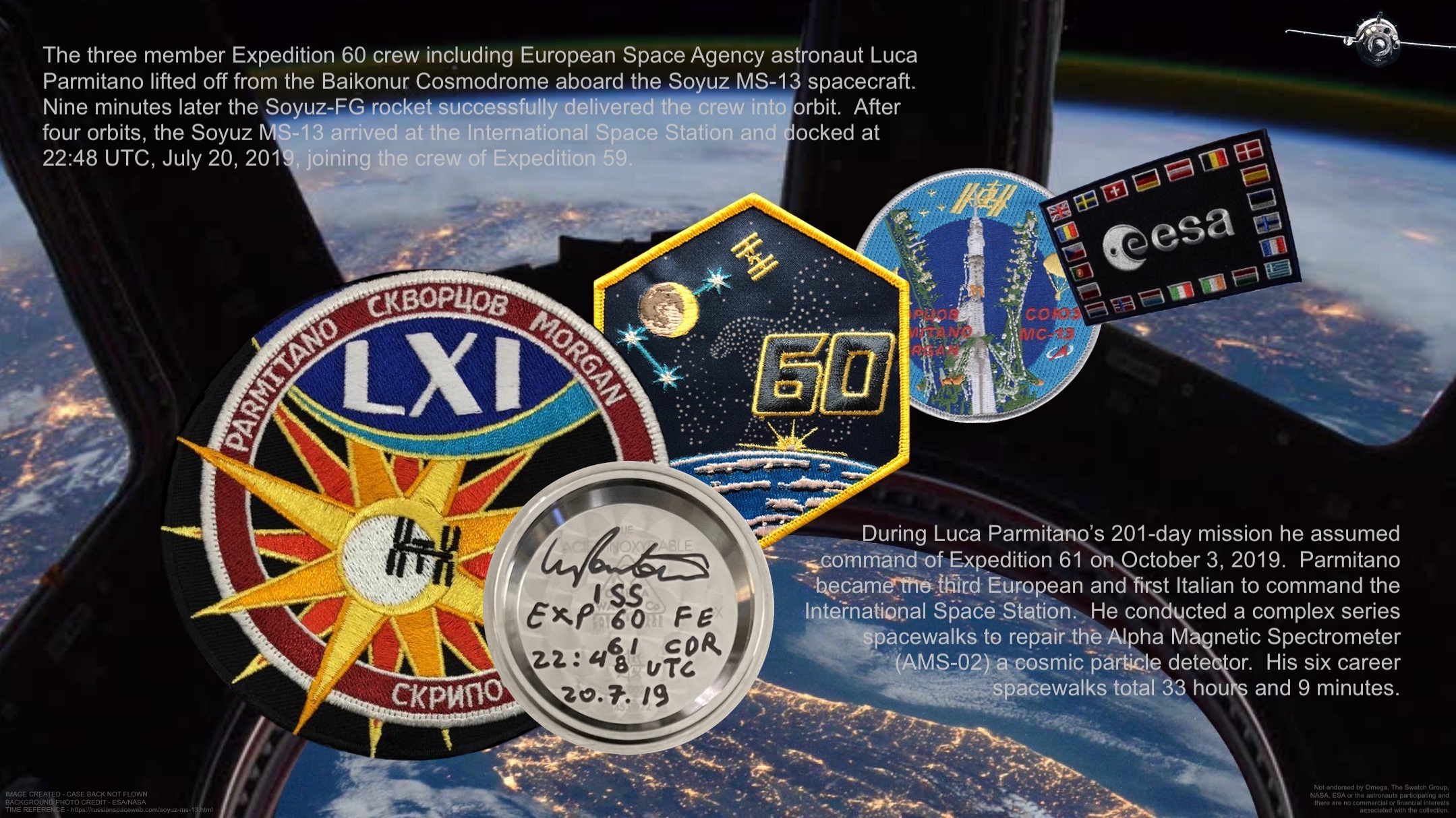 This collection has been assembled for my own personal use and its sole purpose is to honor the men and women that participated in the spaceflight program and their achievements. The collection is not endorsed by Omega, The Swatch Group, European Space Agency, NASA, or the astronauts participating and there are no commercial or financial interests associated with the collection. In no way do I benefit either financially or otherwise from this collection.