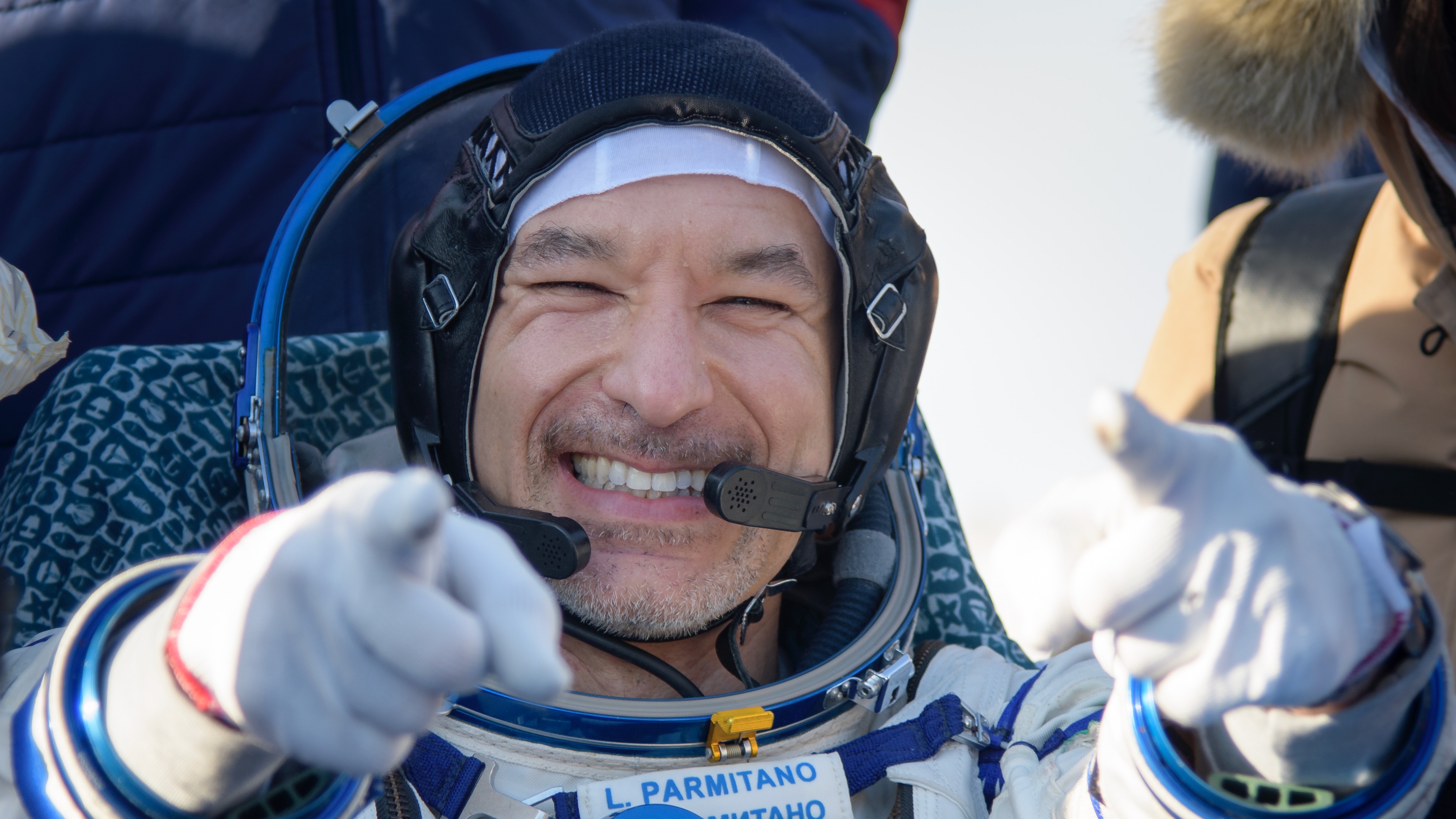 Luca all smiles after his successful 201-day mission sitting outside the Soyuz MS-13 spacecraft.