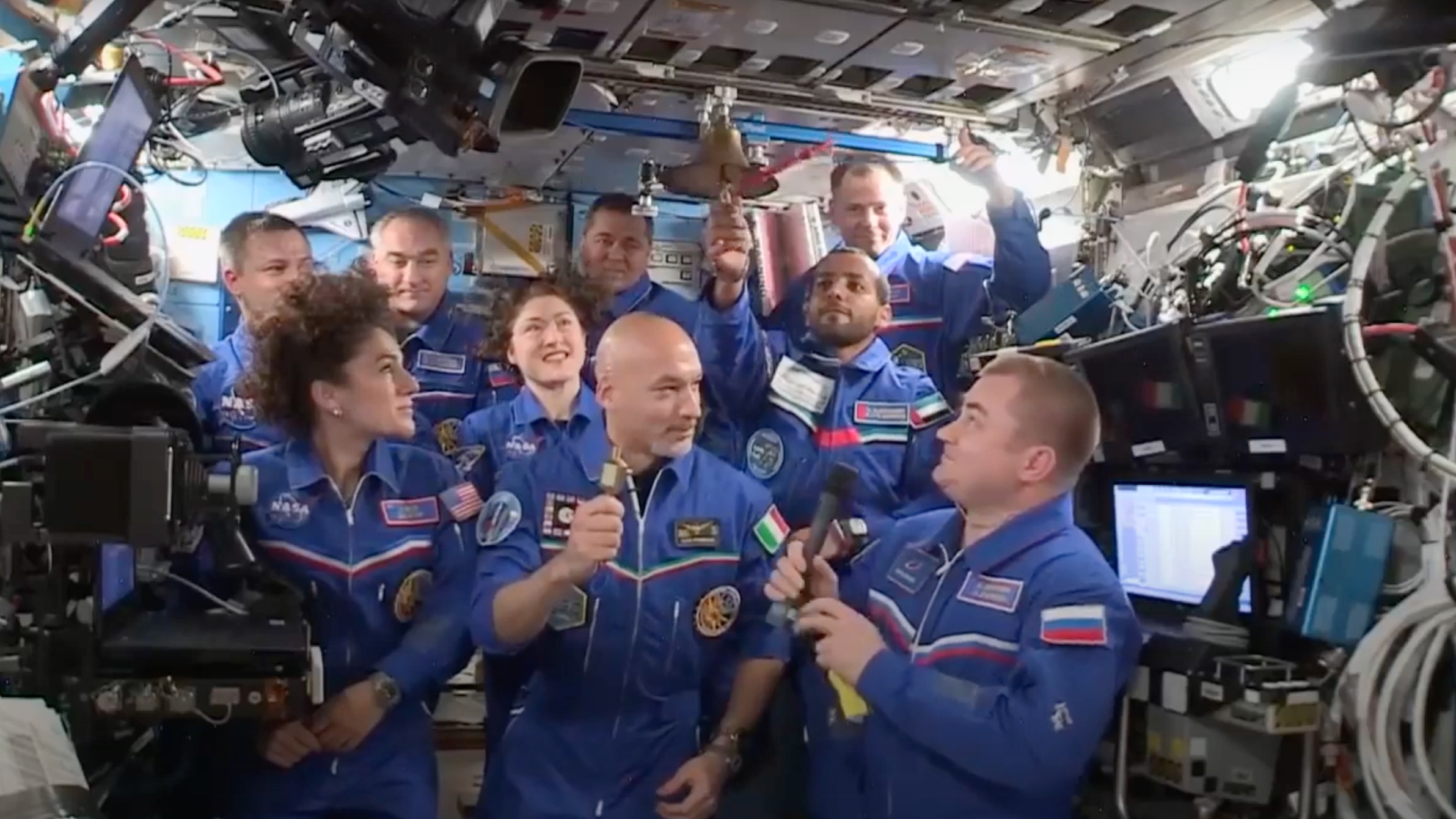 Luca Parmitano assumes command of the International Space Station from Expedition 60 Commander Alexey Ovchinin. As Ovchinin hands over command of the International Space Station, astronaut Hazzaa Ali Almansoori of the United Arab Emirates marks the transition with the traditional ringing of the ships bell which is a long-standing Naval tradition of signaling the arrival or departure of the ships Captain, Flag-Officer, or other important person.