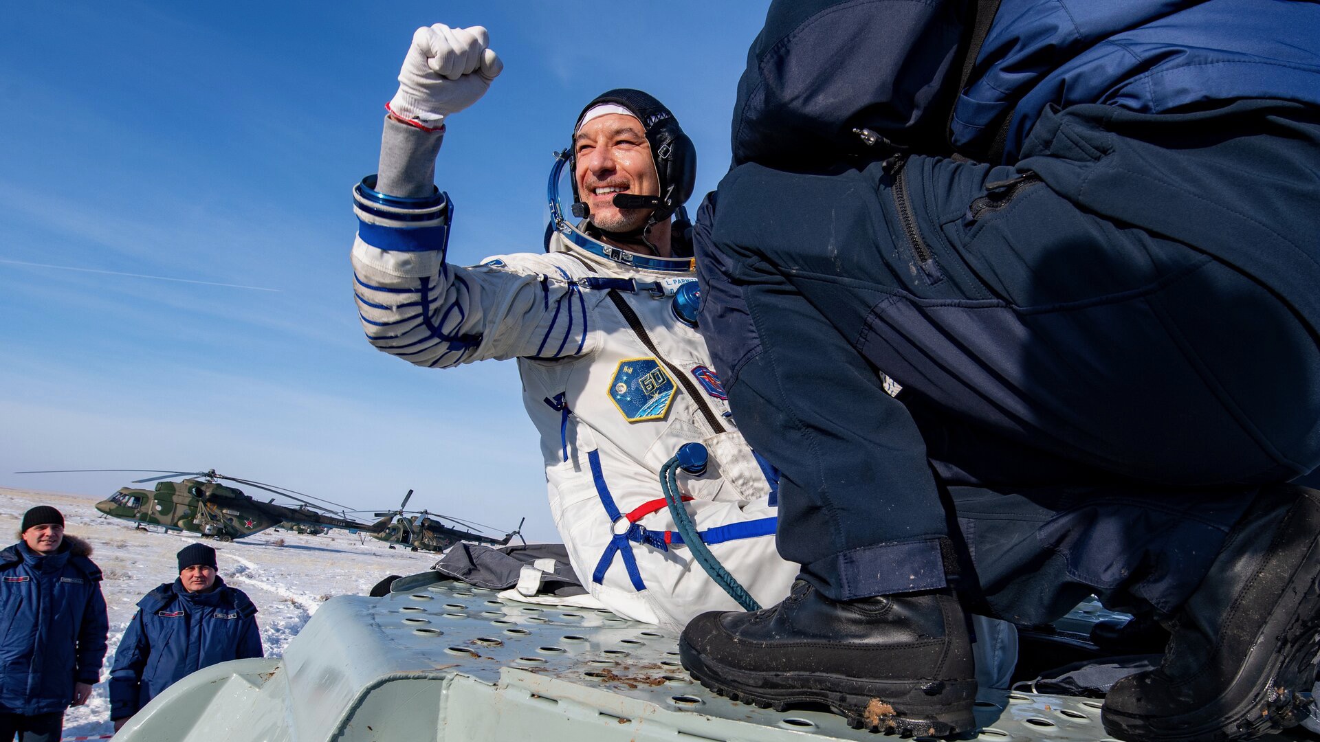 Luca Parmitano is helped out of the Soyuz MS-13 spacecraft just minutes after landing.
