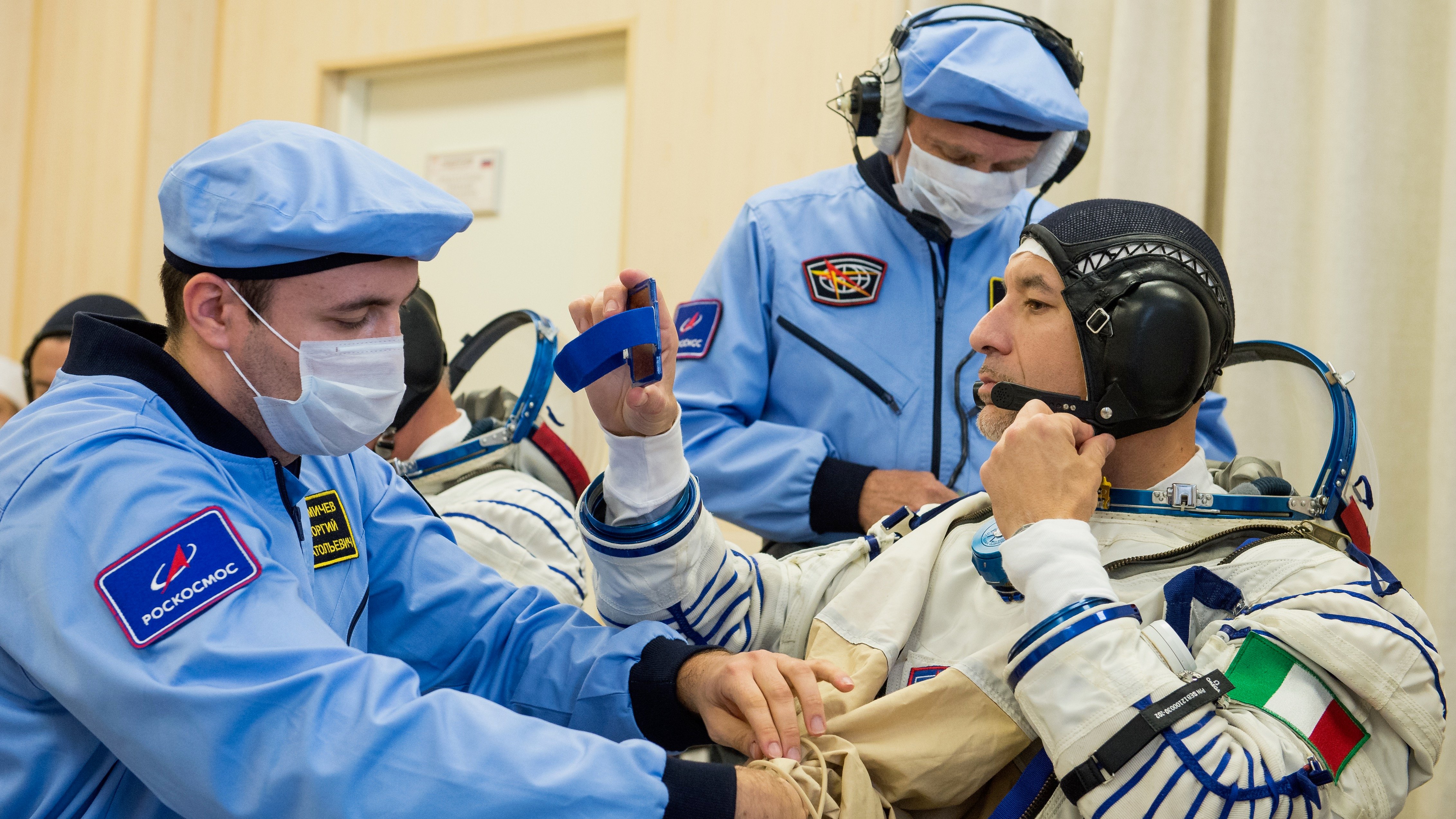 European Space Agency astronaut Luca Parmitano adjusts his communications headset while being assisted into his Sokol spacesuit.