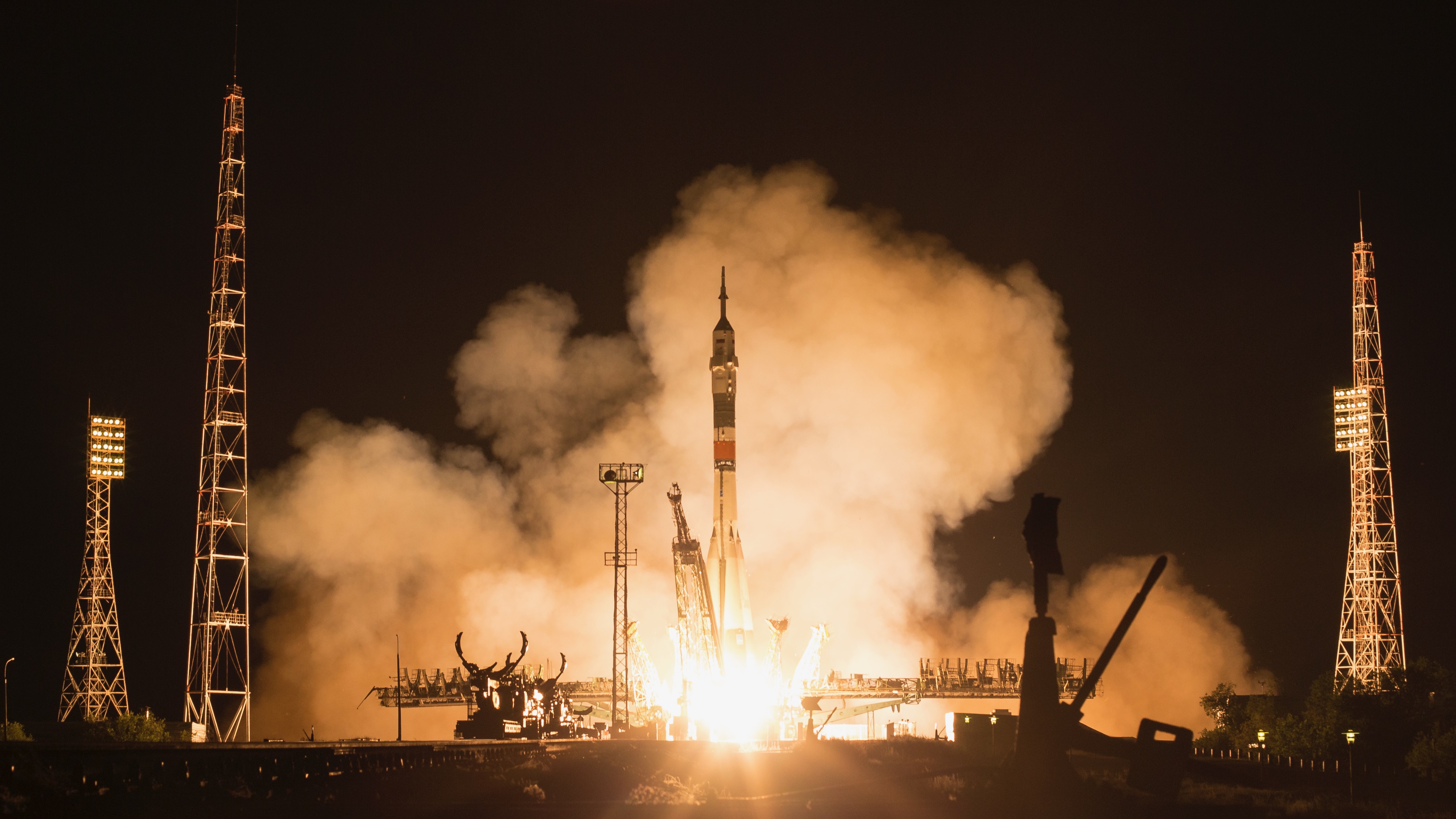 The Soyuz MS-13 rocket is launched with Expedition 60 Soyuz Flight Engineer Luca Parmitano of the European Space Agency, Flight Engineer Andrew Morgan of NASA, and Soyuz Commander Alexander Skvortsov of Roscosmos on July 20, 2019, from the Baikonur Cosmodrome in Kazakhstan. Skvortsov, Morgan, and Parmitano launched at 9:28 p.m. Baikonur time to begin their mission to the International Space Station.