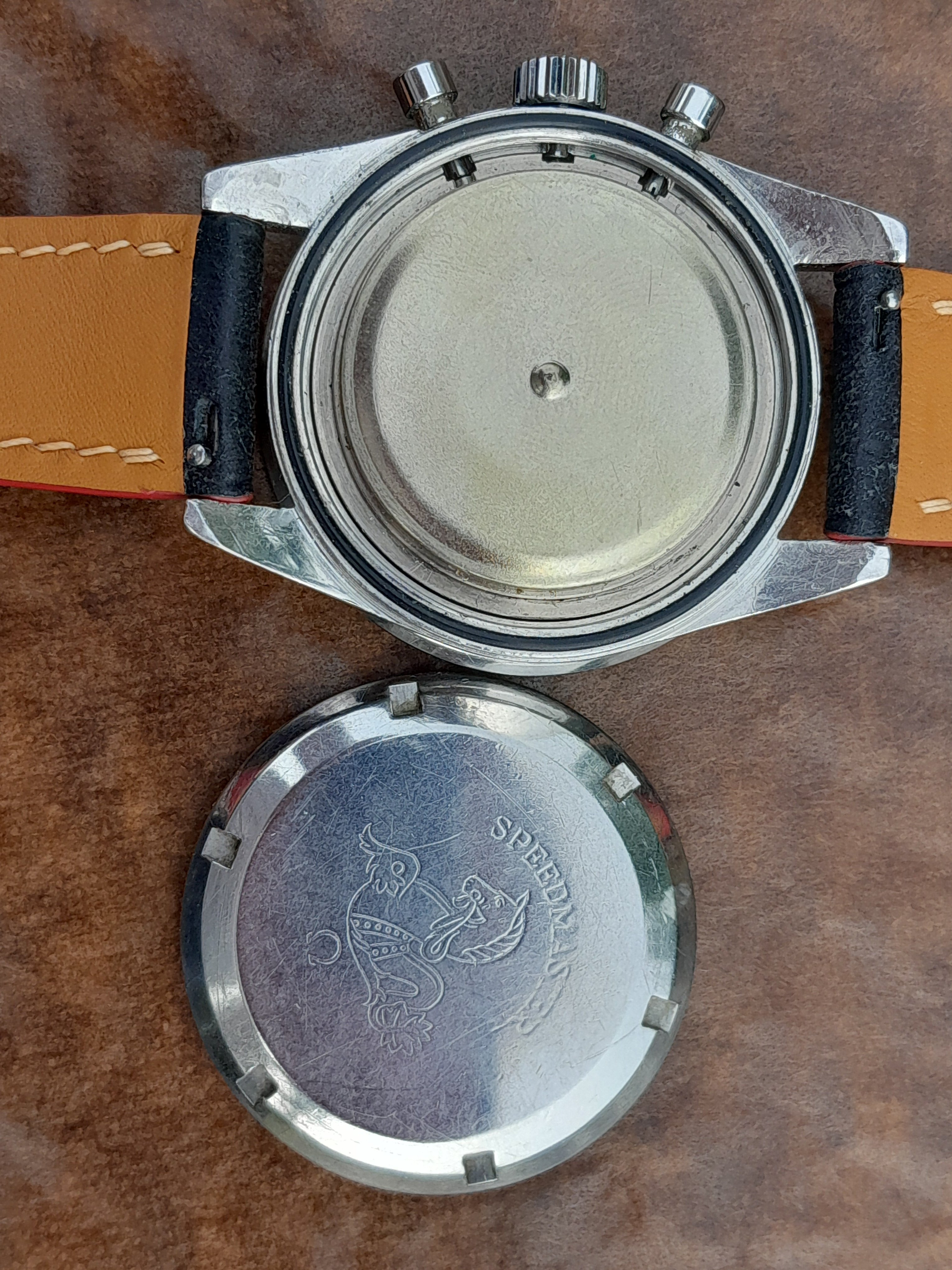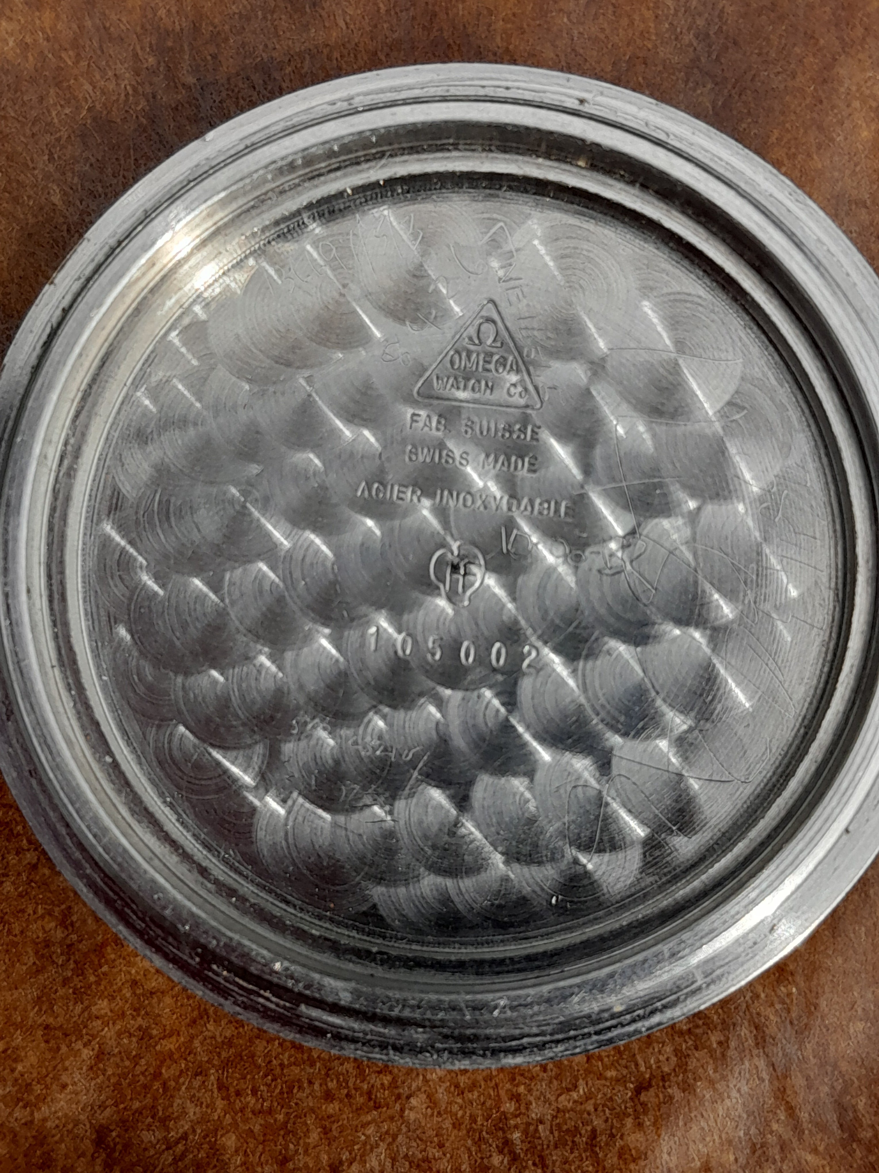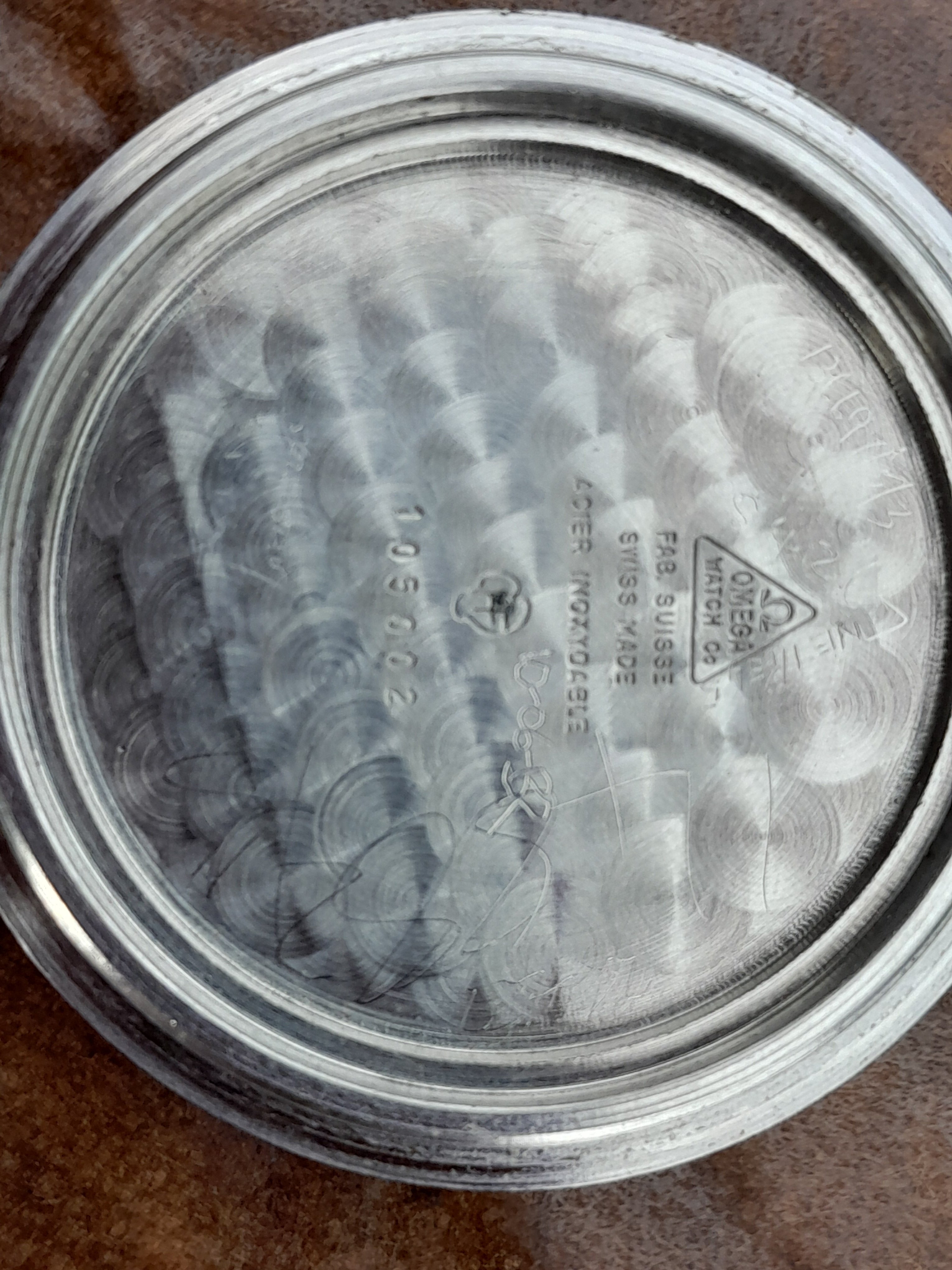 Case and caseback: HF 105.002 caseback , not 105.002-62 SC . The master part of the speedmaster logo is partially worn. On the inside, the double bezel caseback has 6 or 7 sets of watchmakers servicing marks. The caseband looks like original A1 symmetrical with straight lugs and is only lightly polished. Width between lugs is 19mm.
