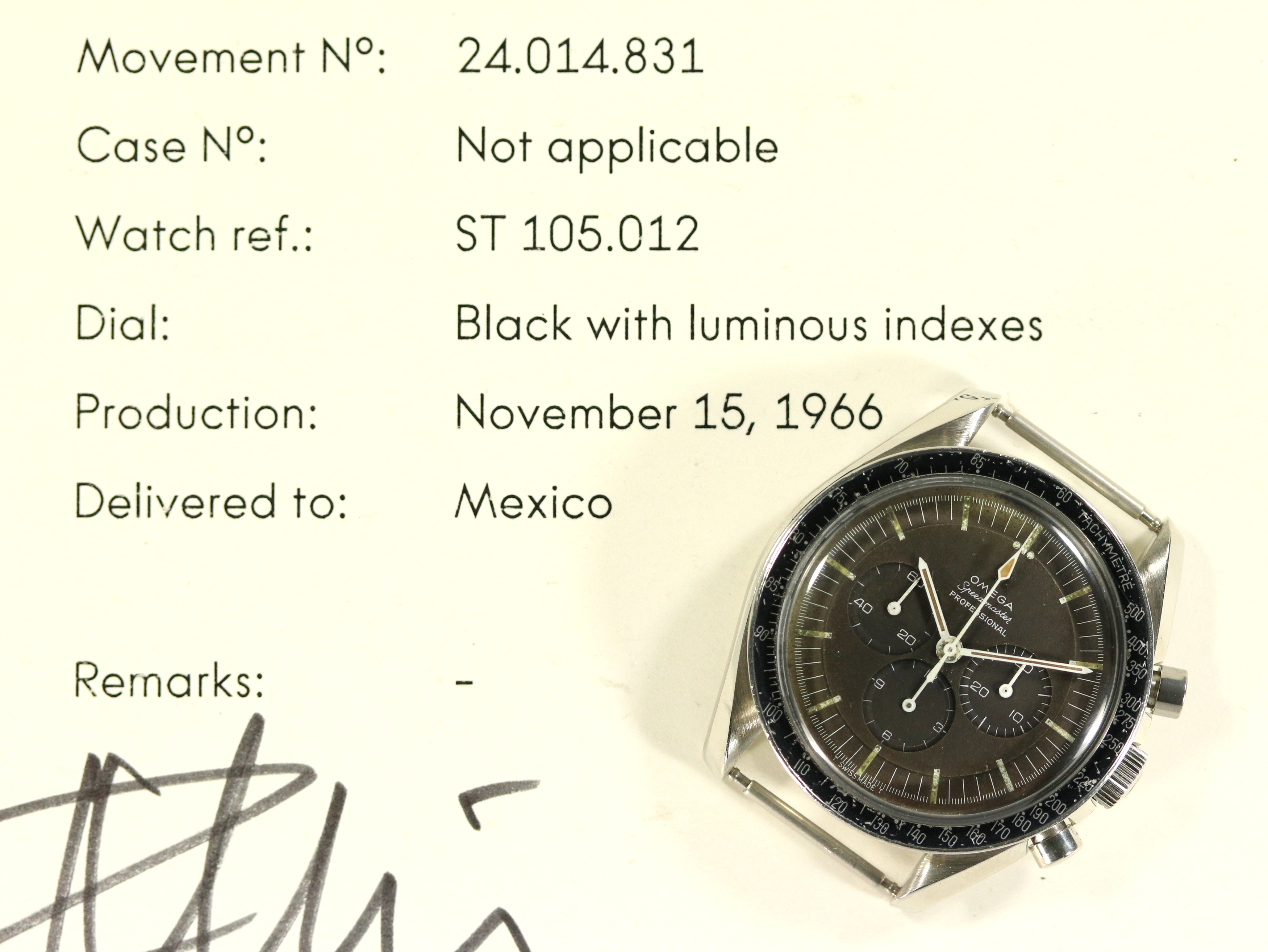 ··Prolific Speedmaster HoarderSpeedmaster 105.012-65 with Extract of the Archives showing delivered to Mexico 15th November 1966.