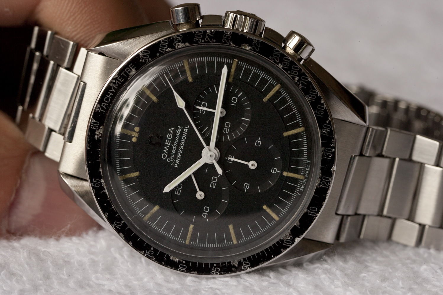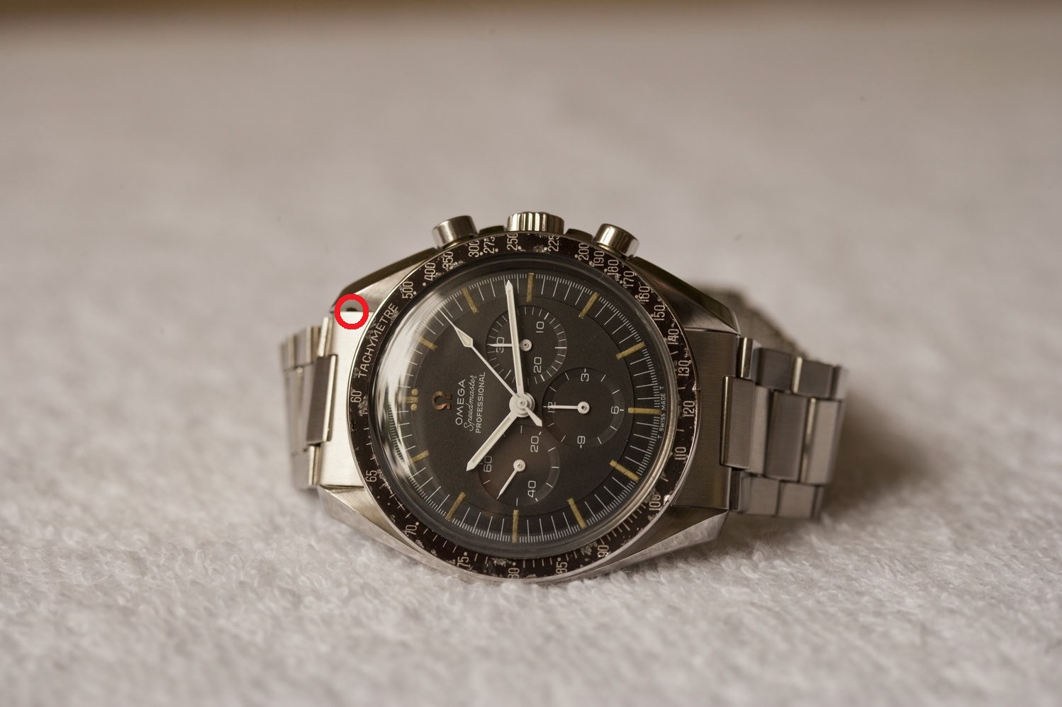1) Seems to me a strange dial (no concentric rings at the 60 minute hand and on the 30 minute and hour hands I count 34 concentric rings. On all other dials there are less rings. Also the SWISS MADE text is loose from the minute markers.