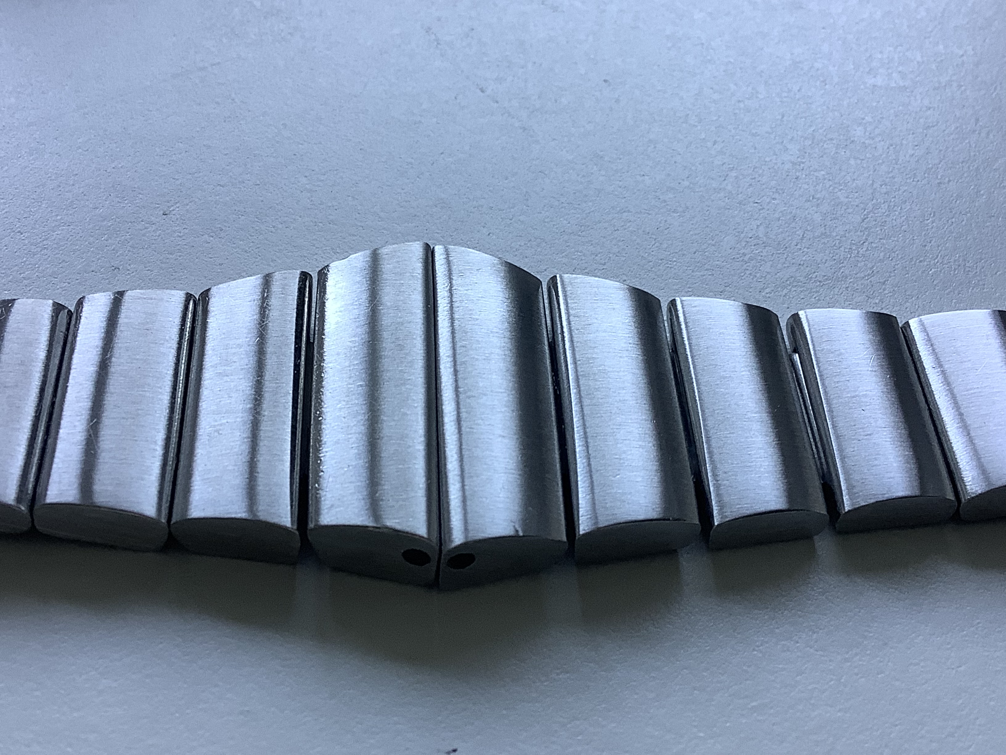 So I took one half of the bracelet to experiment on. I started at 320 grit to remove the larger scratches, and then incrementally progressed to 400, 600, 800, and then 1000, which ultimately seemed pretty close to matching the finish on the case. You can see the new case and refinished bracelet half on the left, and the old case and other side of the bracelet, untouched, on the right: