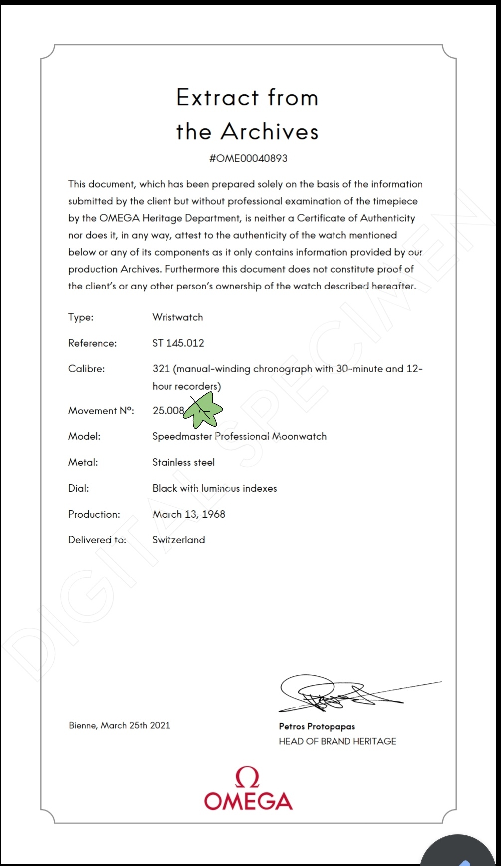 In addition, I required the Omega extract of the archive which confirm that it is a 145.012