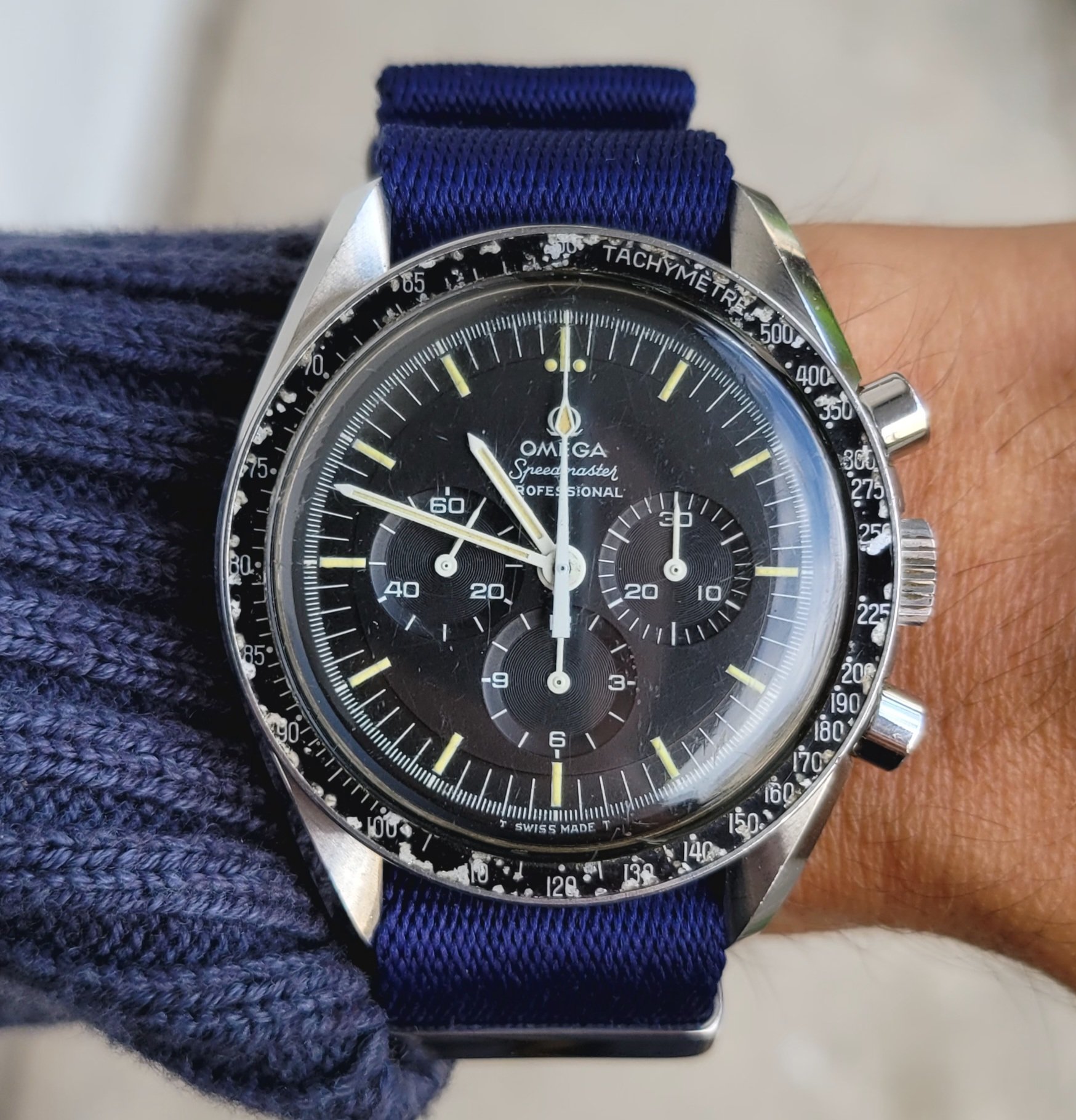 The biggest issue is the condition of the lume itself. They are puffy and globs are in some places. This is often the case with relume. I looked at the edges and the lume is within the index and many have shrunk, shrinkage is a good sign of age. What's more, i didn't see any overlap of what would be paint on top of old lume. The puffiness and globs do show up on vintage pieces, like 145.012s that came before this. I have seen some rounding of lume in 145.022-68s but nothing as globby as this one. I decided that this is original lume, based mostly on the shrinkage and variety in texture and color. This is probably where there may be the most disagreement. It's also the main benefit of this thread as an exercise, to look at this same information and determine for yourself whether or not you would have bought it.