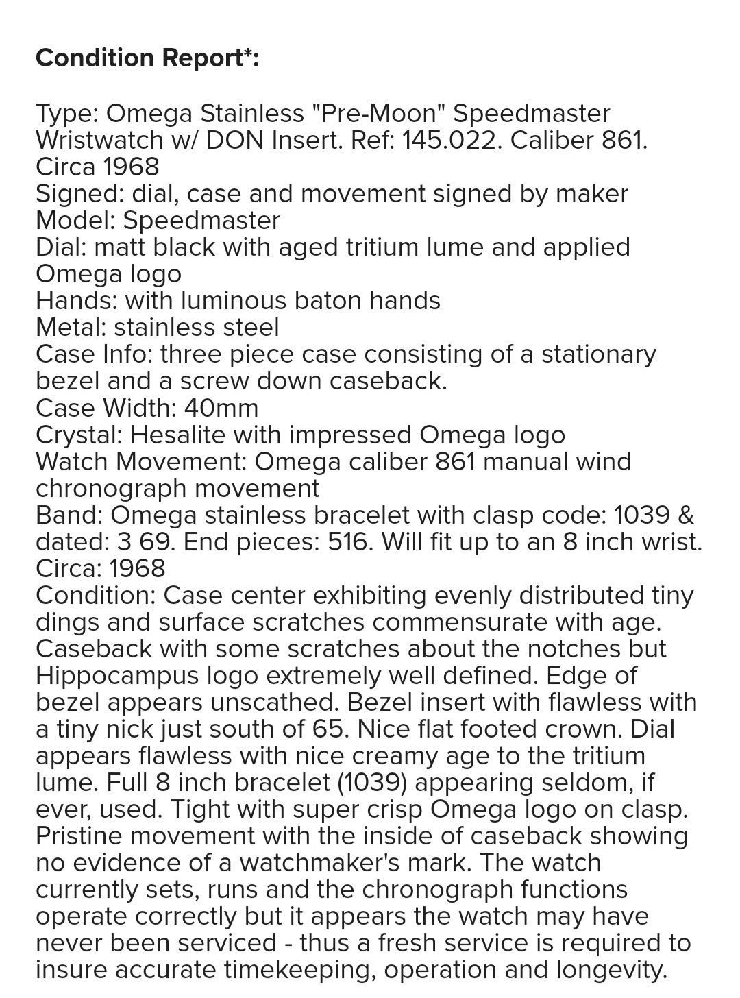 Reference, condition, originality, price. I recognized this as a 145.022-68 transitional that was relatively inexpensive. (I sold one, and have been looking to replace it. It is one of the most intriguing Speedmasters to me so always capturesmy attention.) It had what appeared to be all the correct parts, the DON bezel, the 1039 bracelet, AML, long indexes/indicies, flat chrono hand. What I couldn't see was the caseback, the all important Reference number inside the caseback or the movement with serial number. For those, i had to trust the condition report. (First thing I'm doing when it shows up is taking off the caseback.)