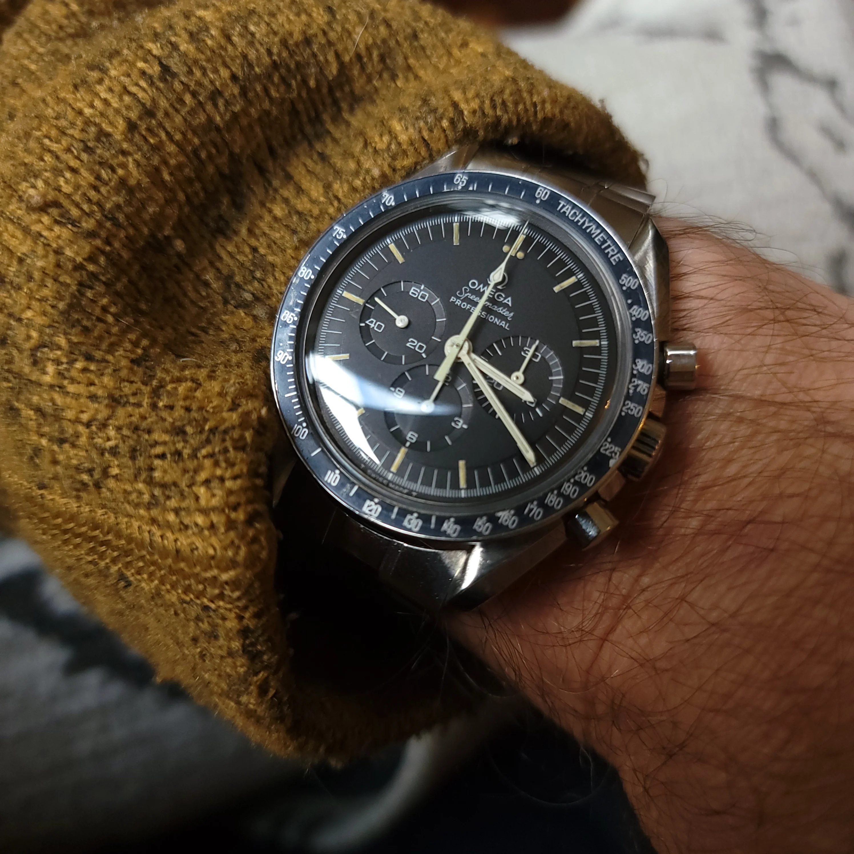 This reference wasn't worn on the moon like the 105.012, but it was released at the same time that the moon landings were happening, and it is the result of Omega's becoming conscious of what that really meant for the Speedmaster. Wearing this watch makes me conscious of that same moment when the excitement of the moon landings was at its peak.