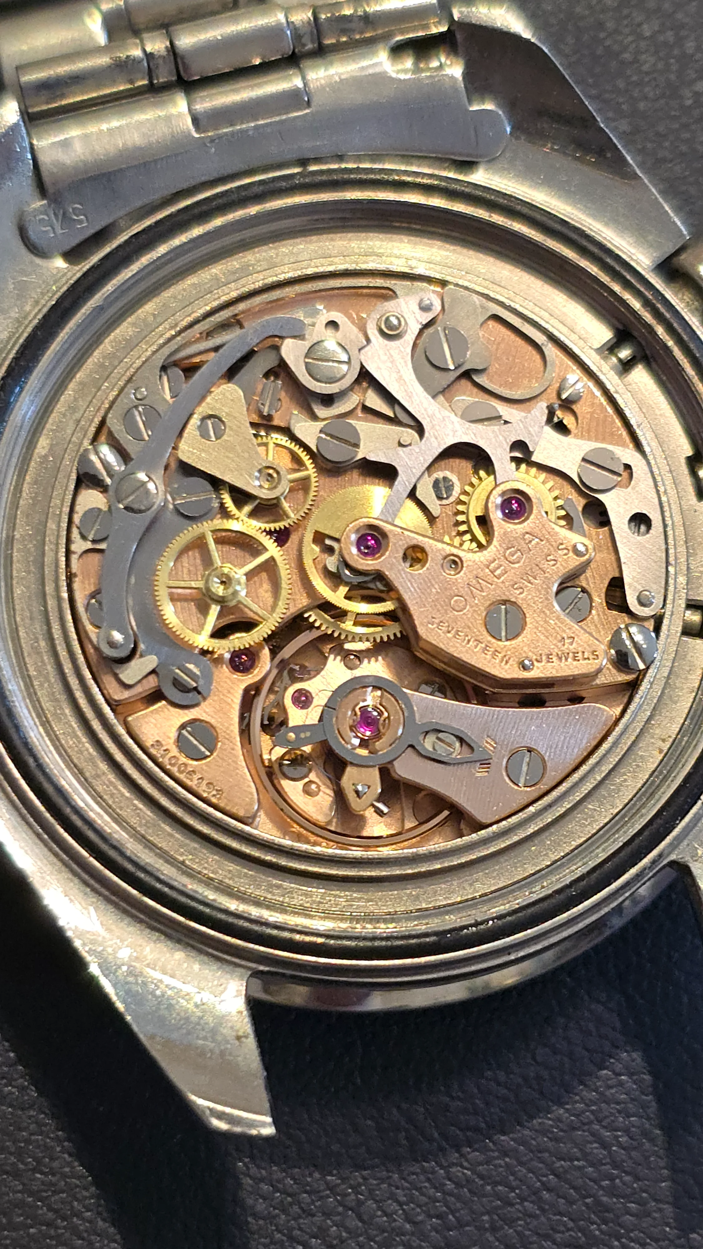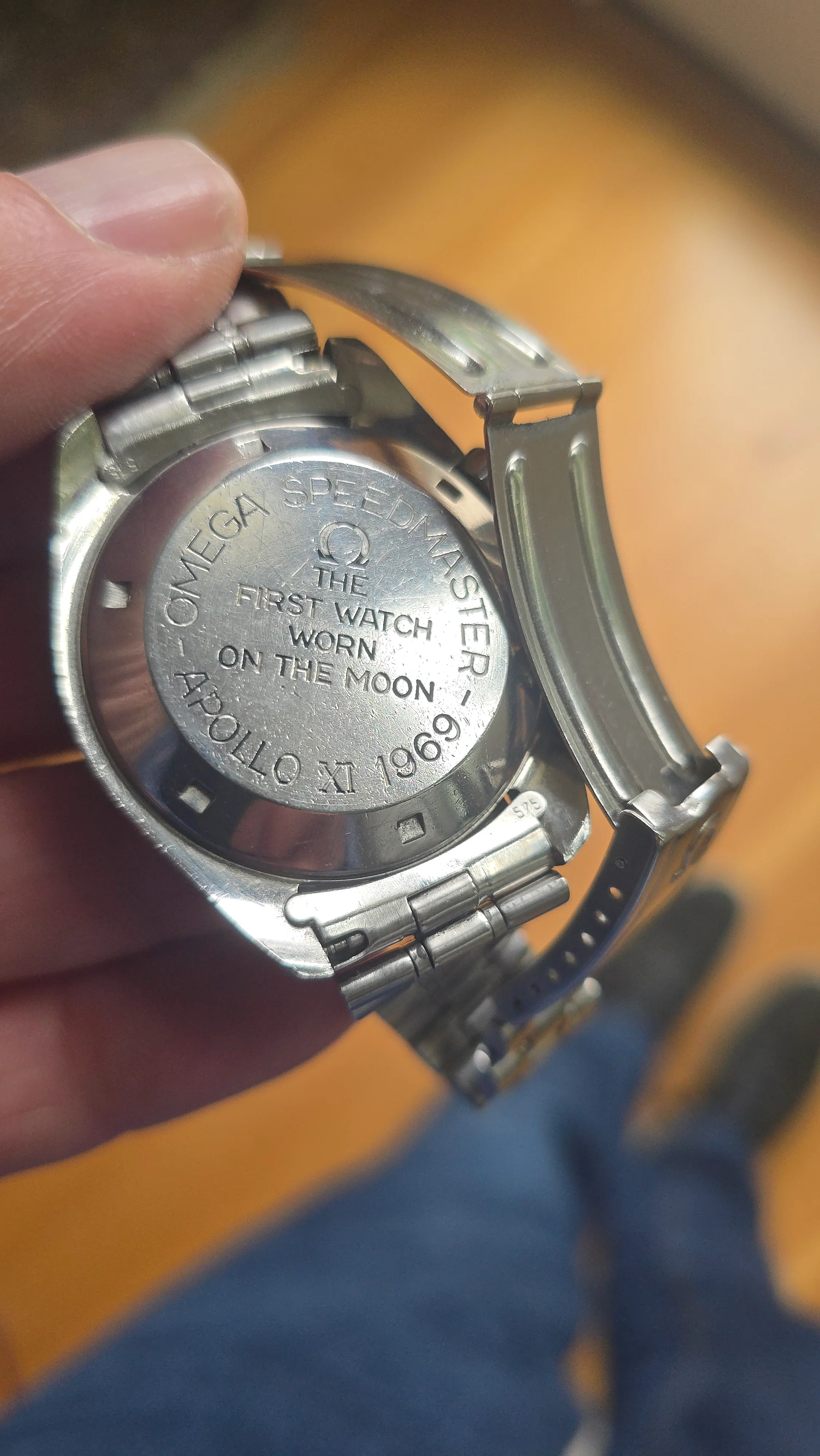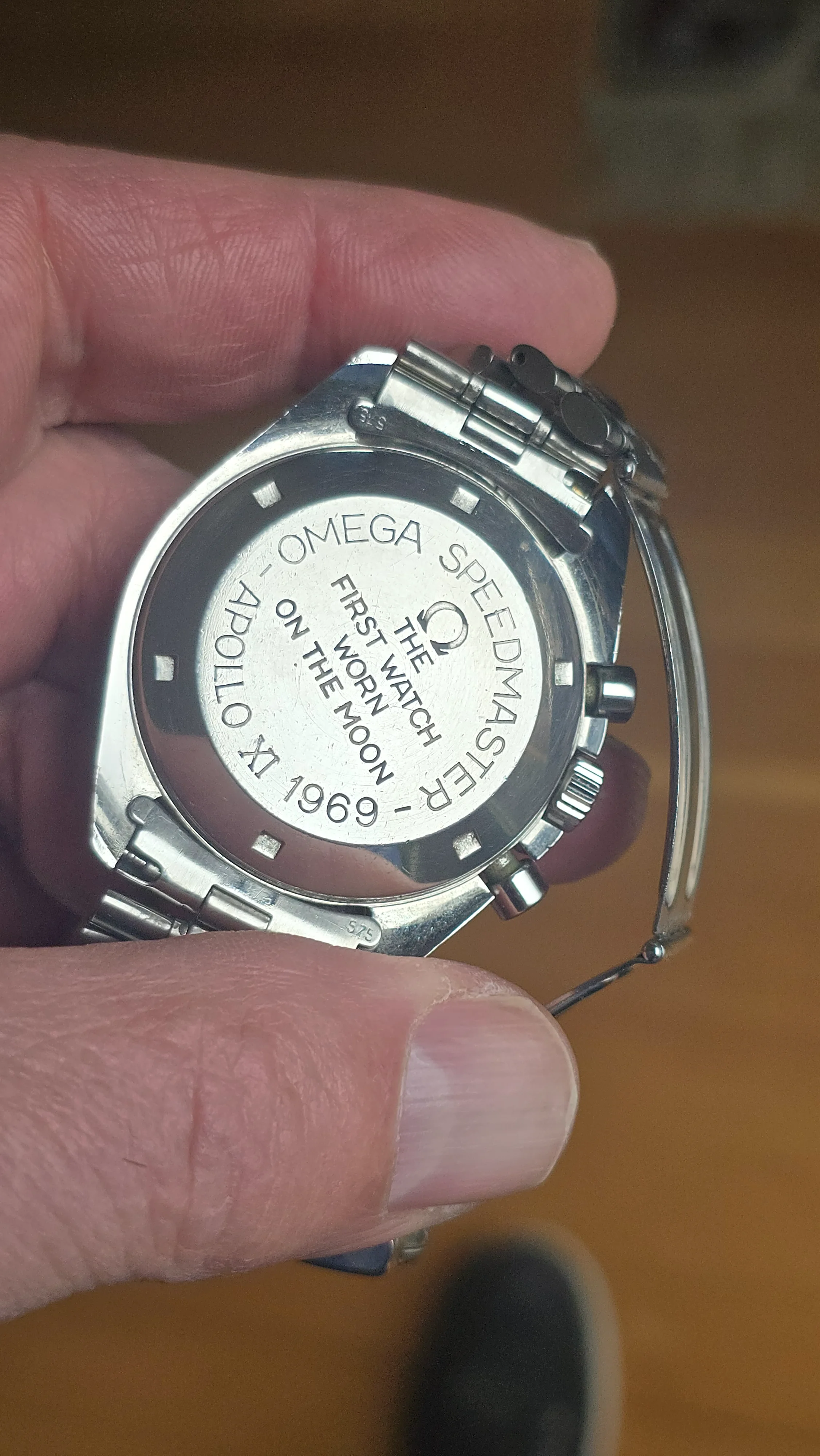 Apollo XI and Apollo XII had recently landed on the moon and the crew of Apollo 12 had visited Japan where they were enthusiastically received. It's thought that this Straight writing Apollo XI (SW-AXI) was a Japan only market release, with maybe as low as 300 watches. If this is true, it would likely have happened that the Omega distributor in Japan asked Omega to create a steel version of the gold watch that was presented to the astronauts. This SW-AXI has the same caseback and same bracelet as the gold version.
