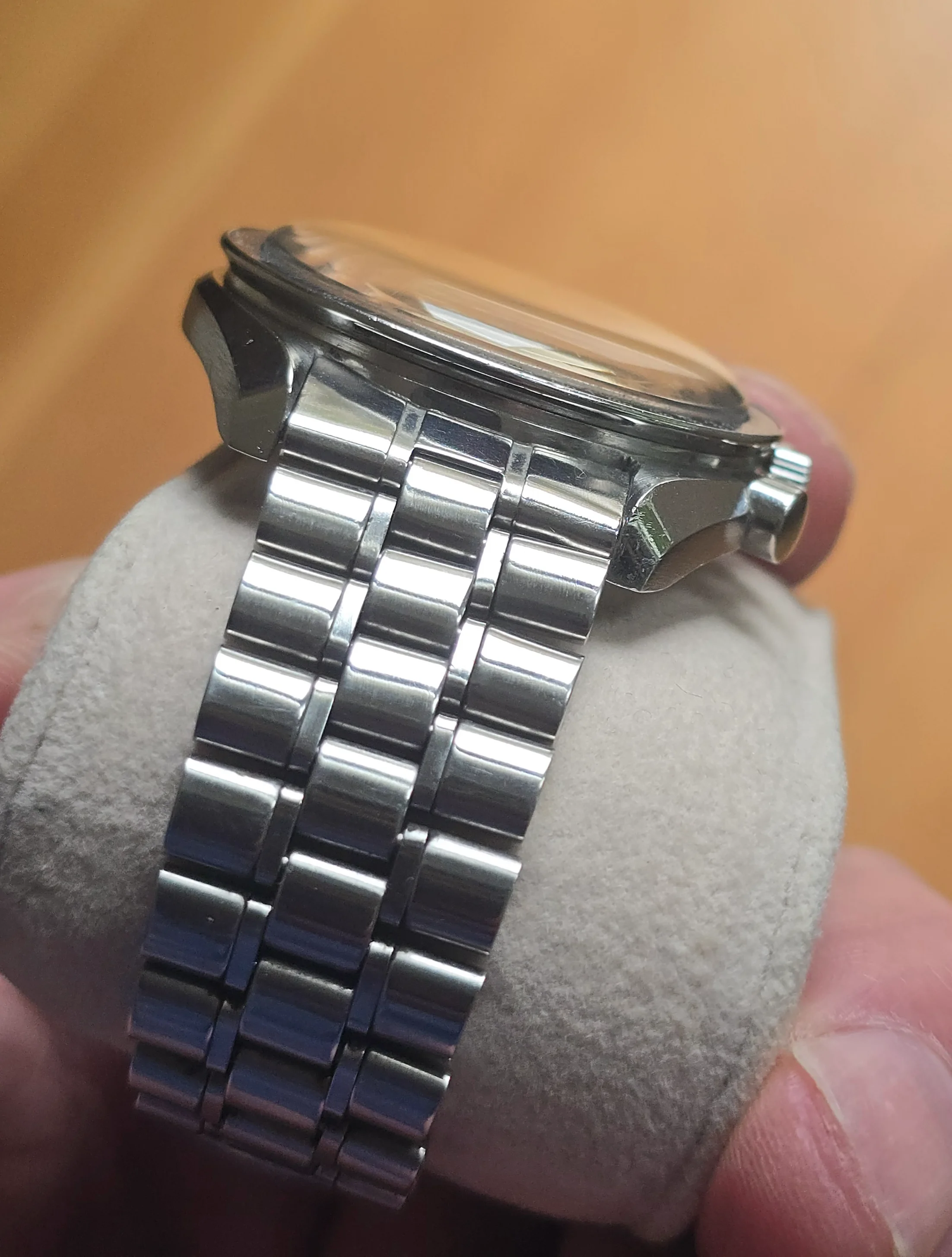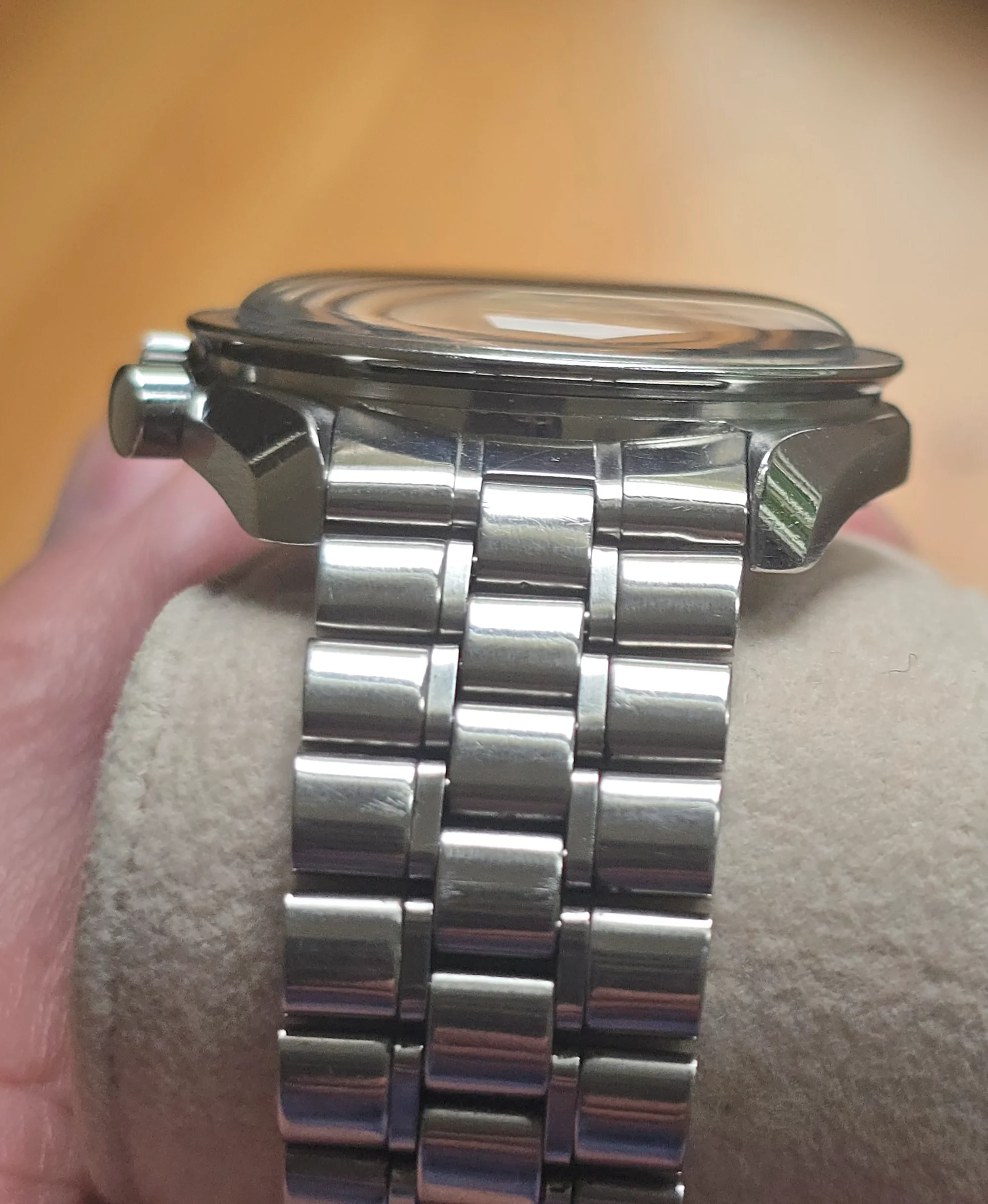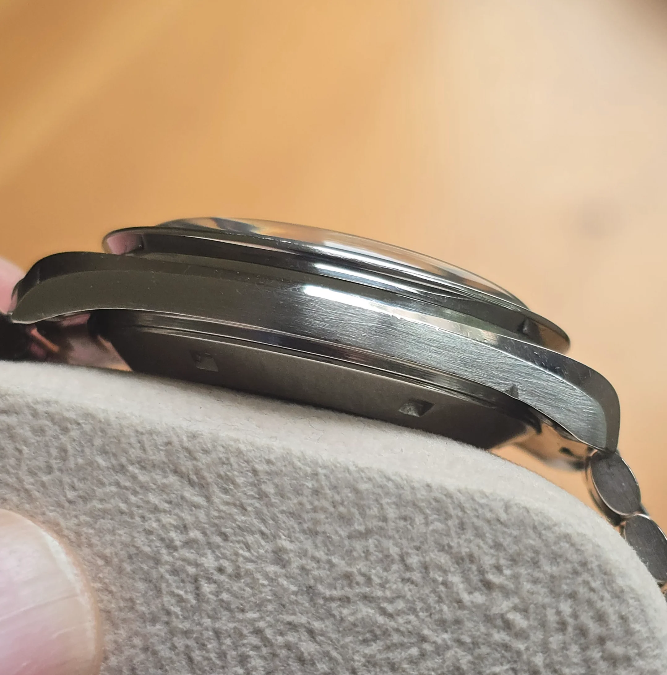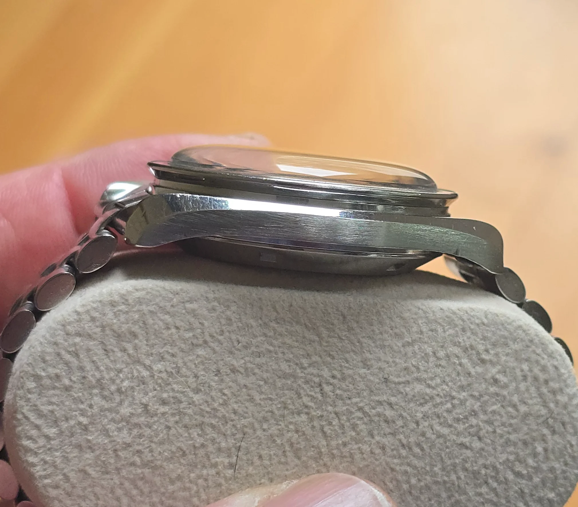 The case doesn’t look unpolished but has strong edges. There is a nick on the bottom edge of the side opposite the crown, as seen in the photos. The crown may have been replaced in a prior service.