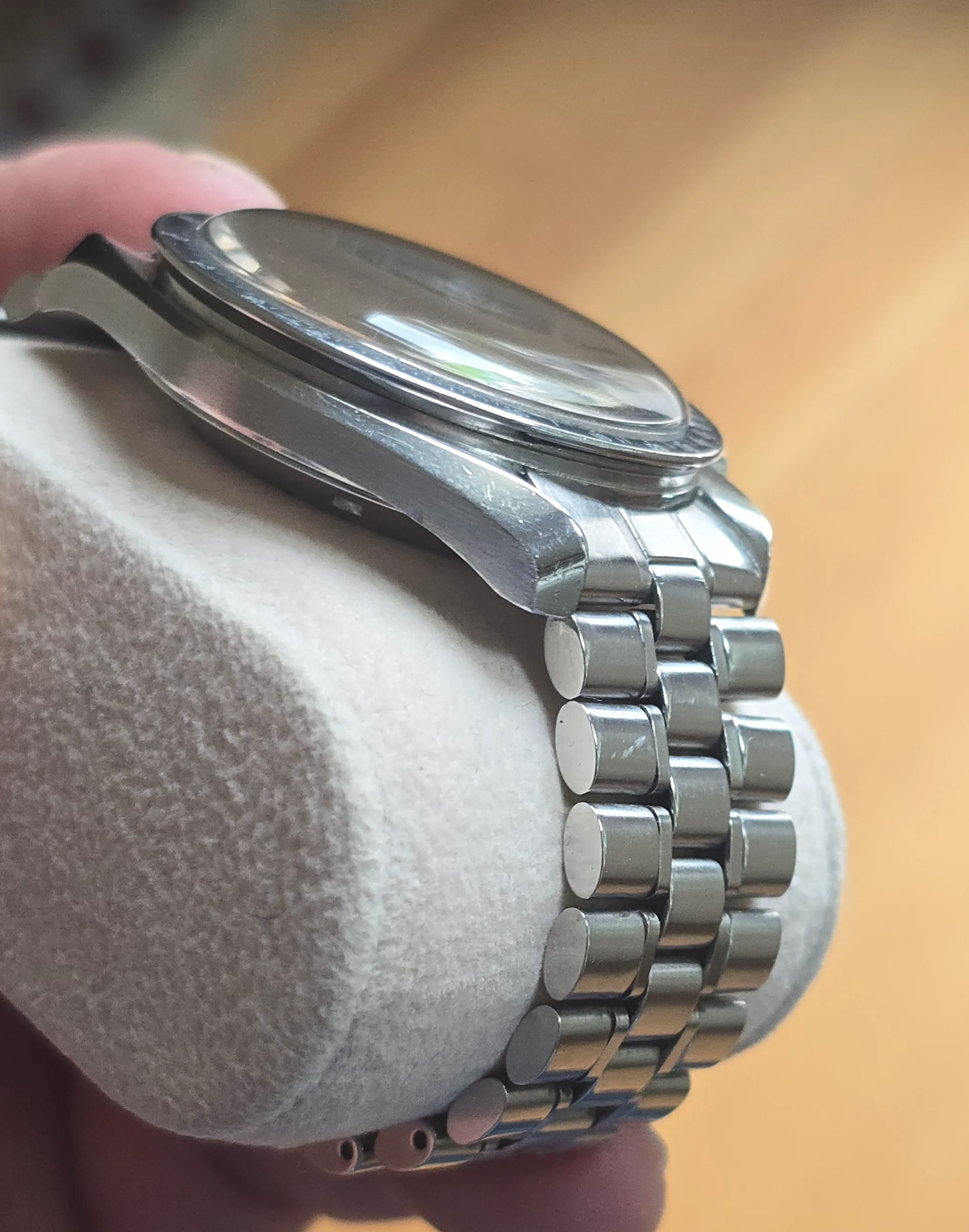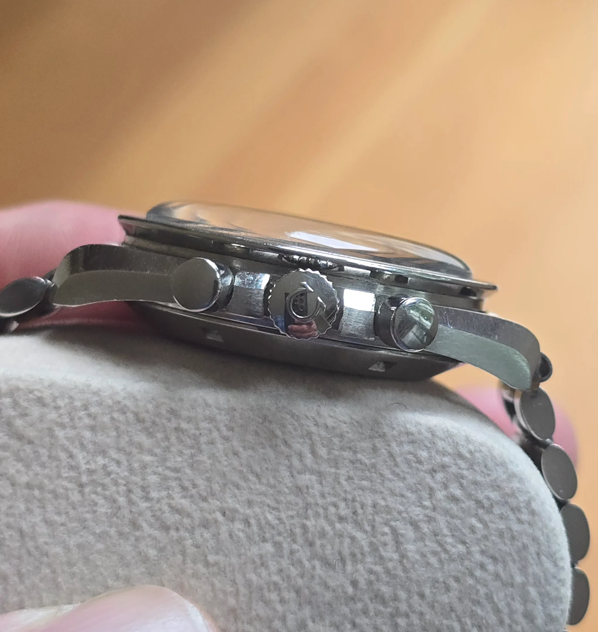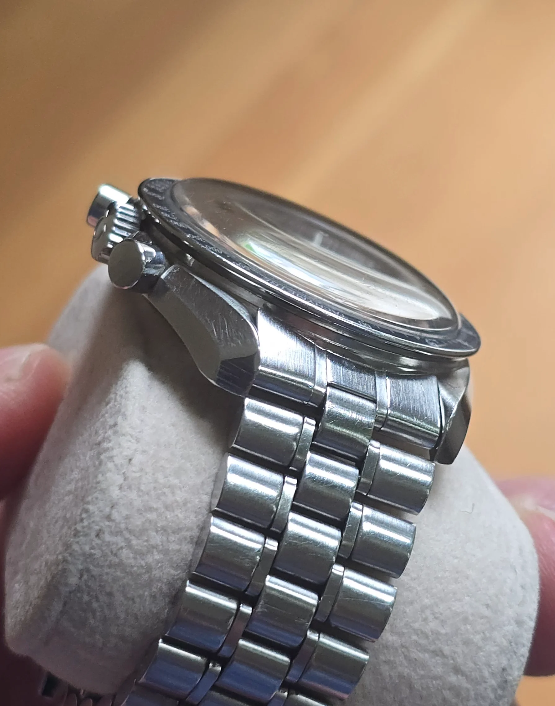 The case doesn’t look unpolished but has strong edges. There is a nick on the bottom edge of the side opposite the crown, as seen in the photos. The crown may have been replaced in a prior service.