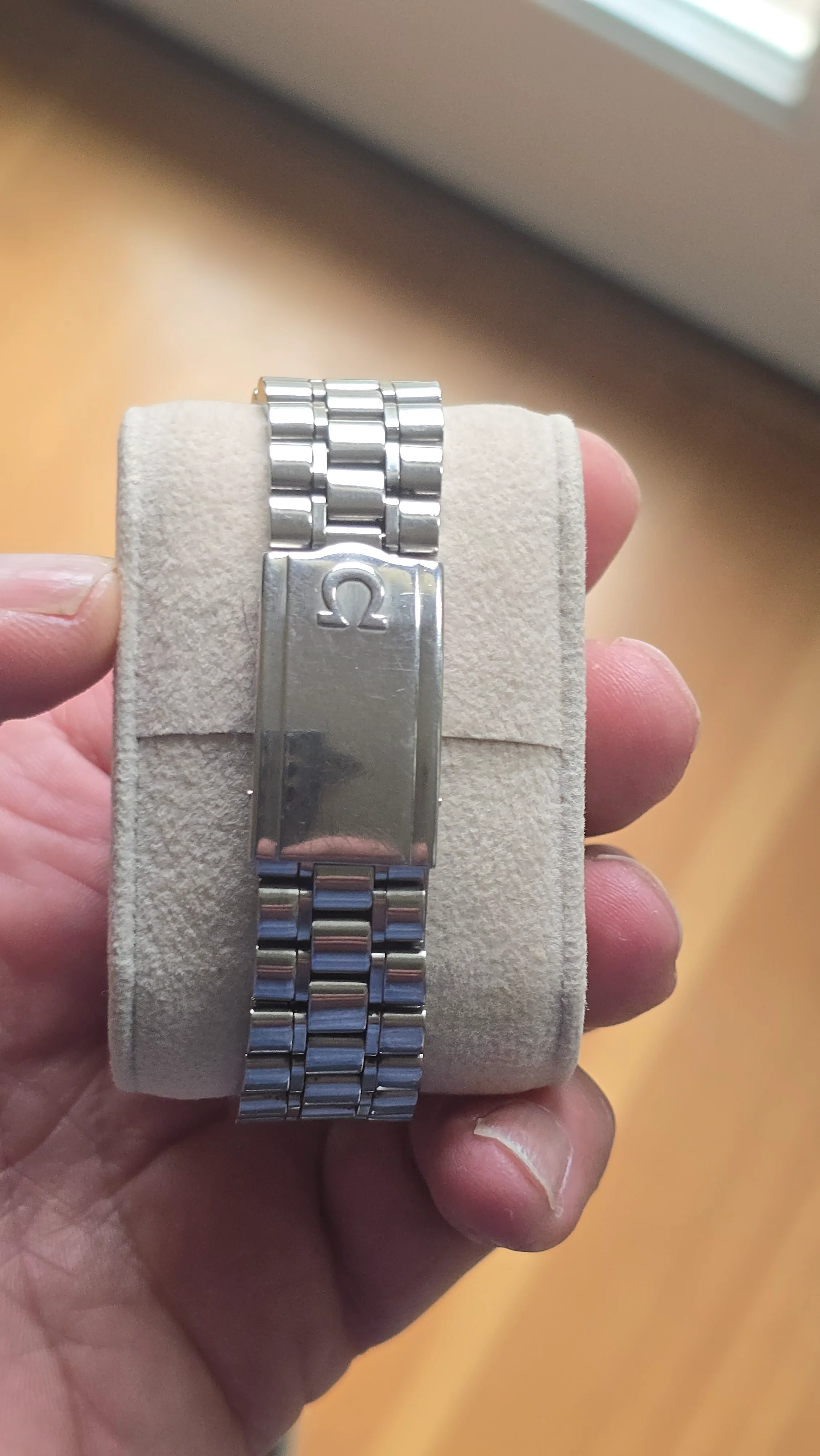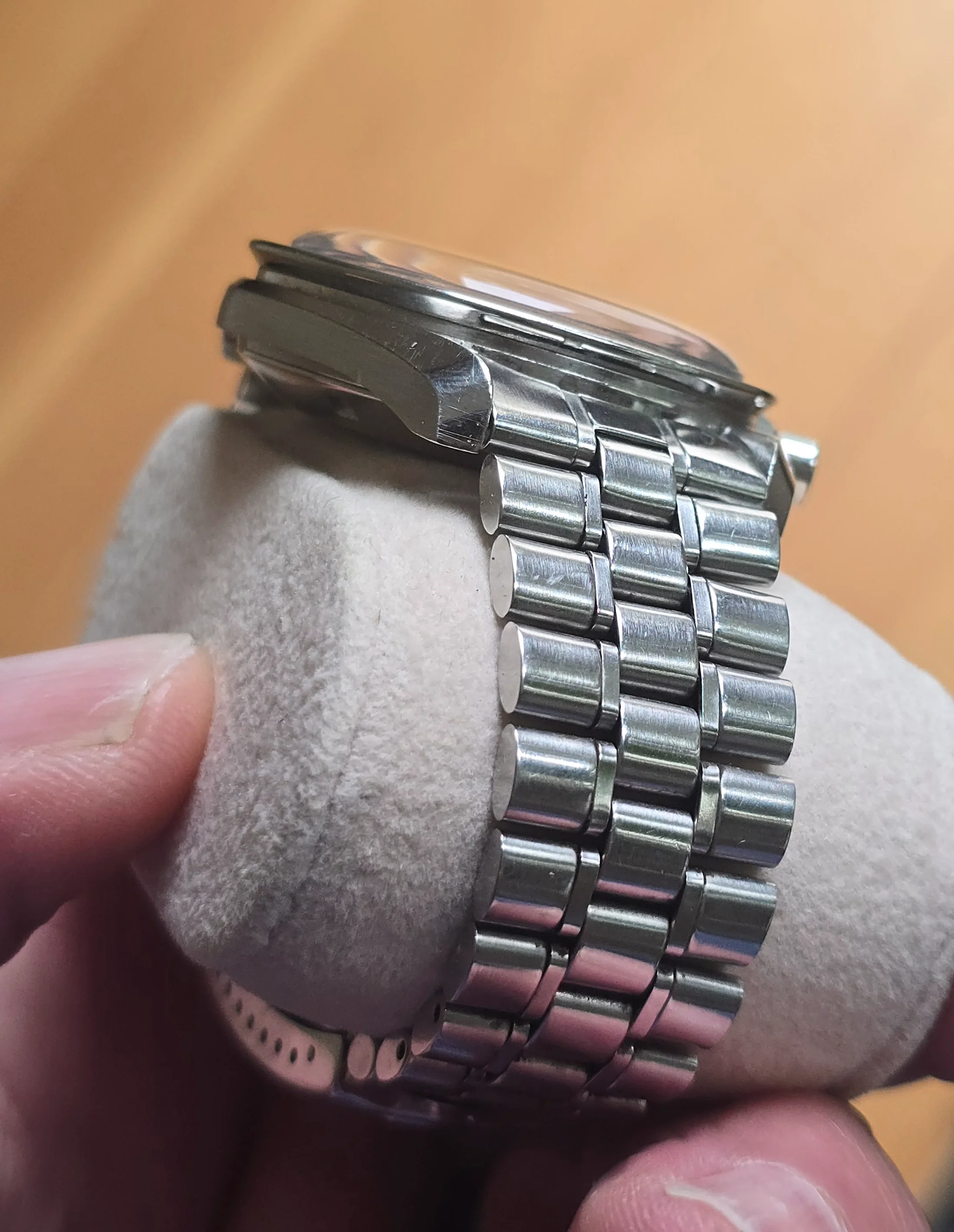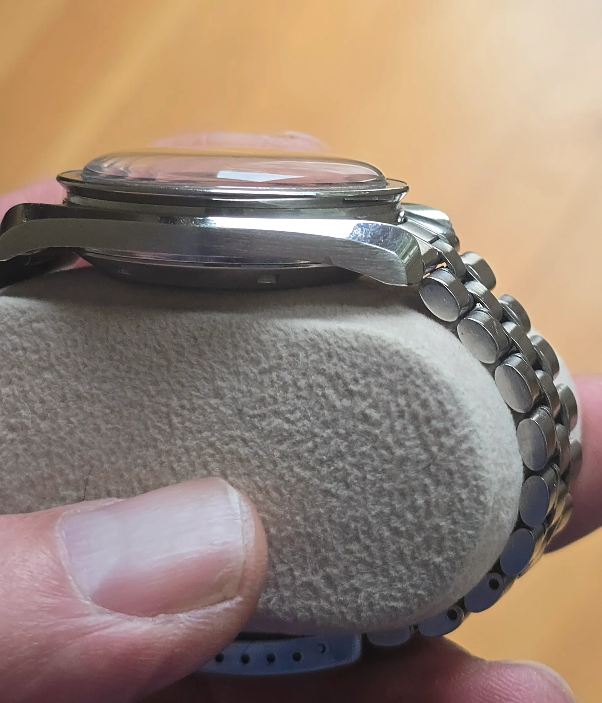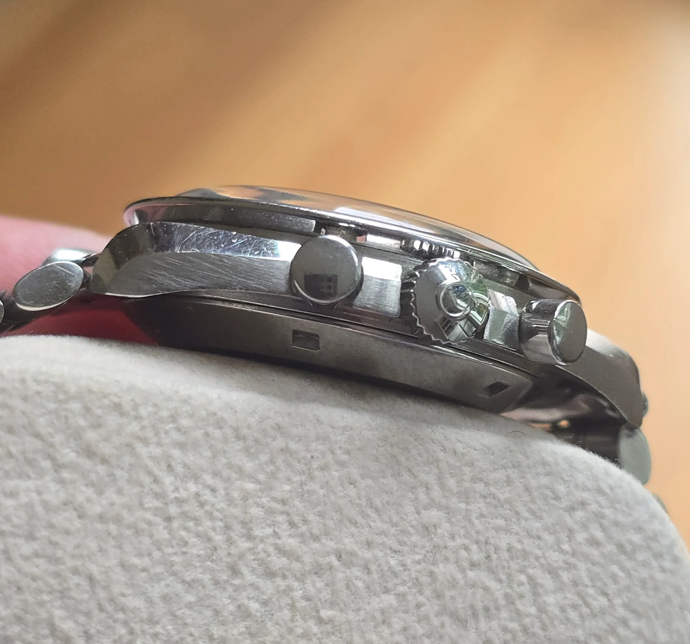 The case doesn’t look unpolished but has strong edges. There is a nick on the bottom edge of the side opposite the crown, as seen in the photos. The crown may have been replaced in a prior service.