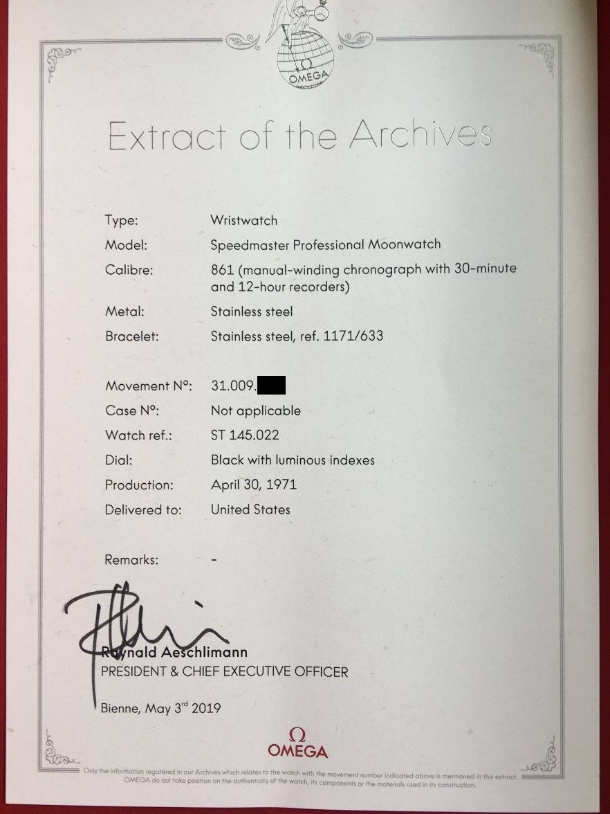 Despite attempts to find them, no such extract has been shown to exist. On the contrary, these watches consistently yield extracts with much earlier production dates - typically in 1971. While these things must always be subject to revision in the face of contradictory data, there is currently no basis in evidence for asserting that this combination of sub-reference, serial number, and production date suggests a lack of originality. I think that's progress