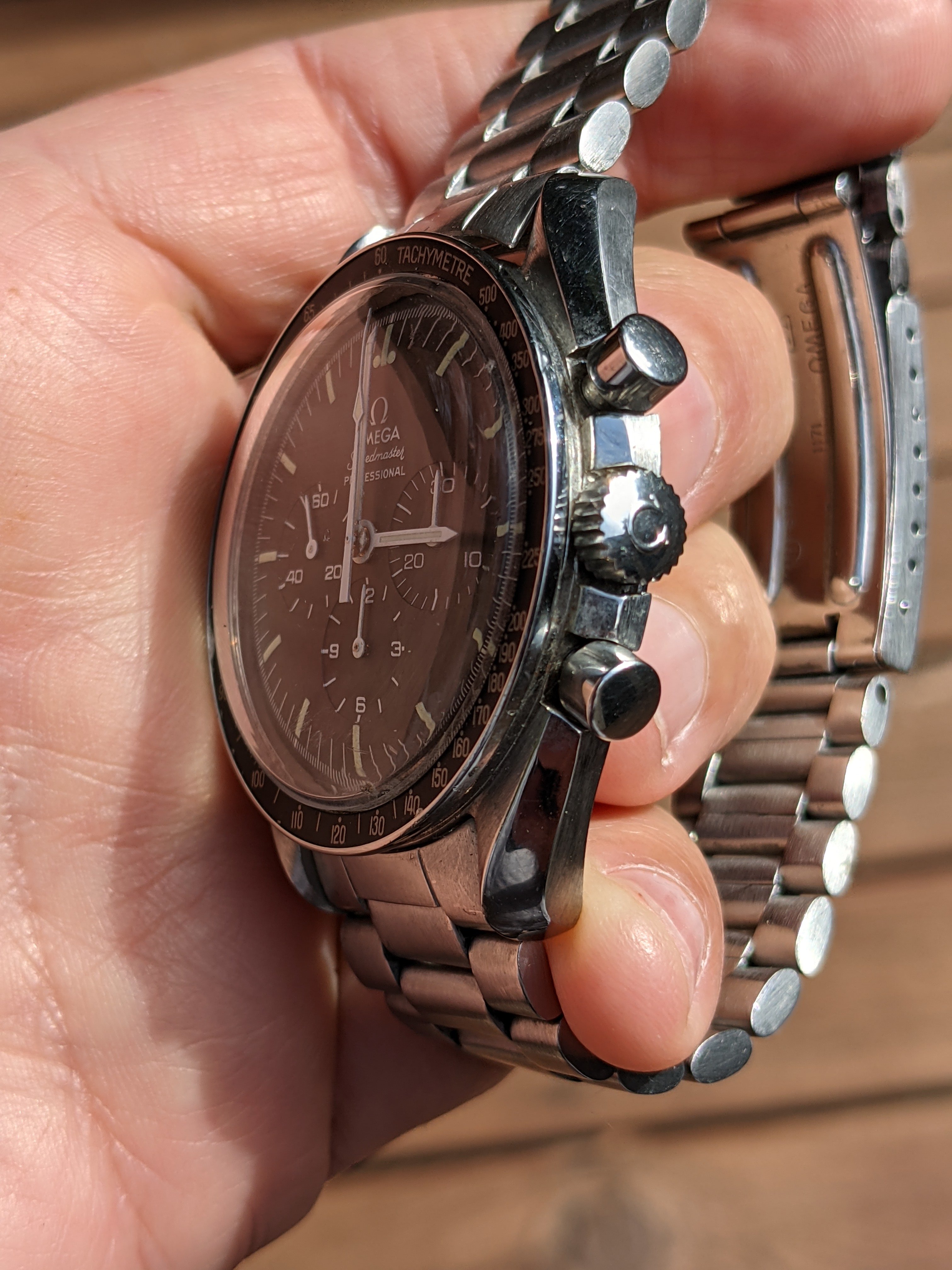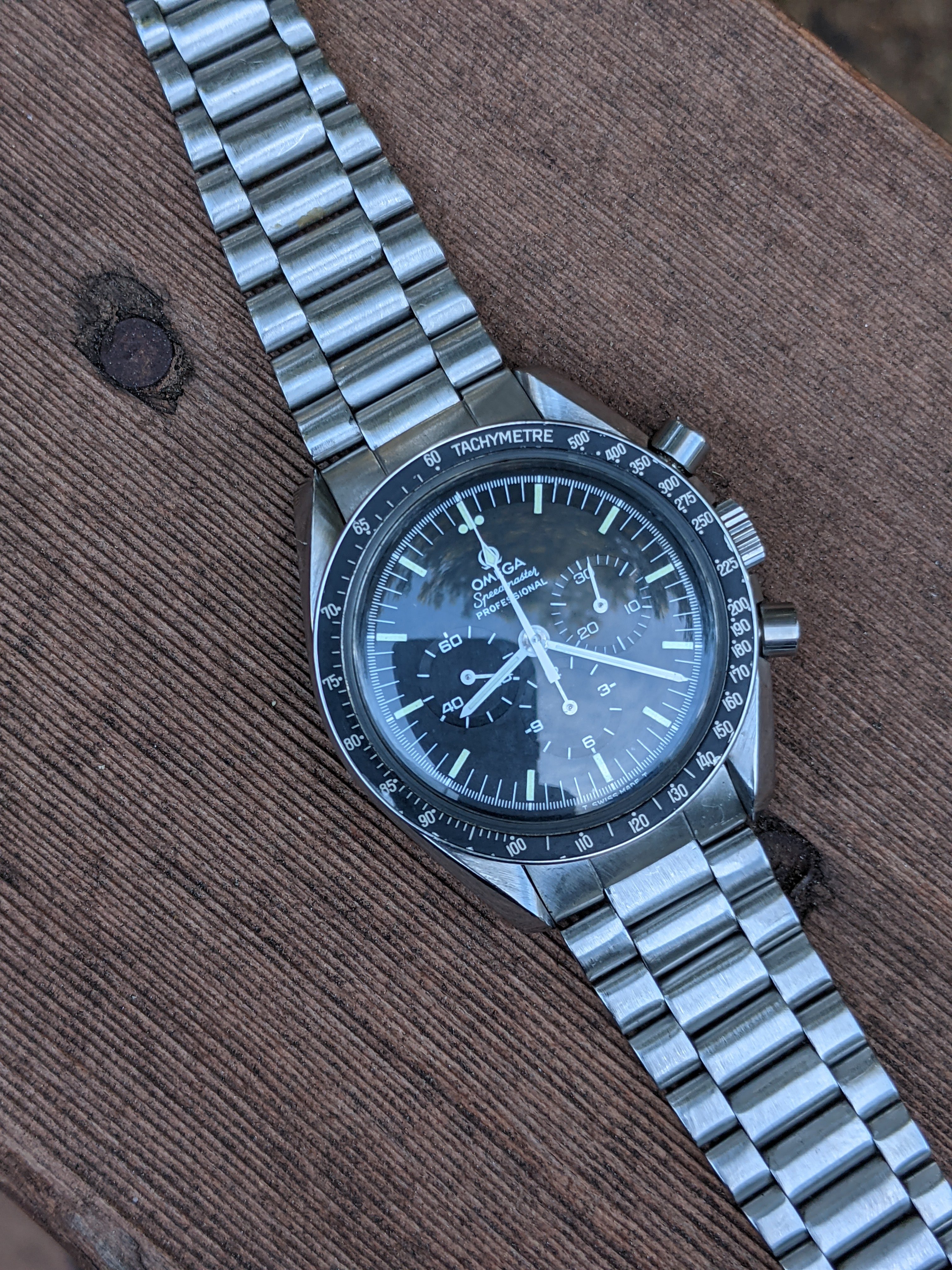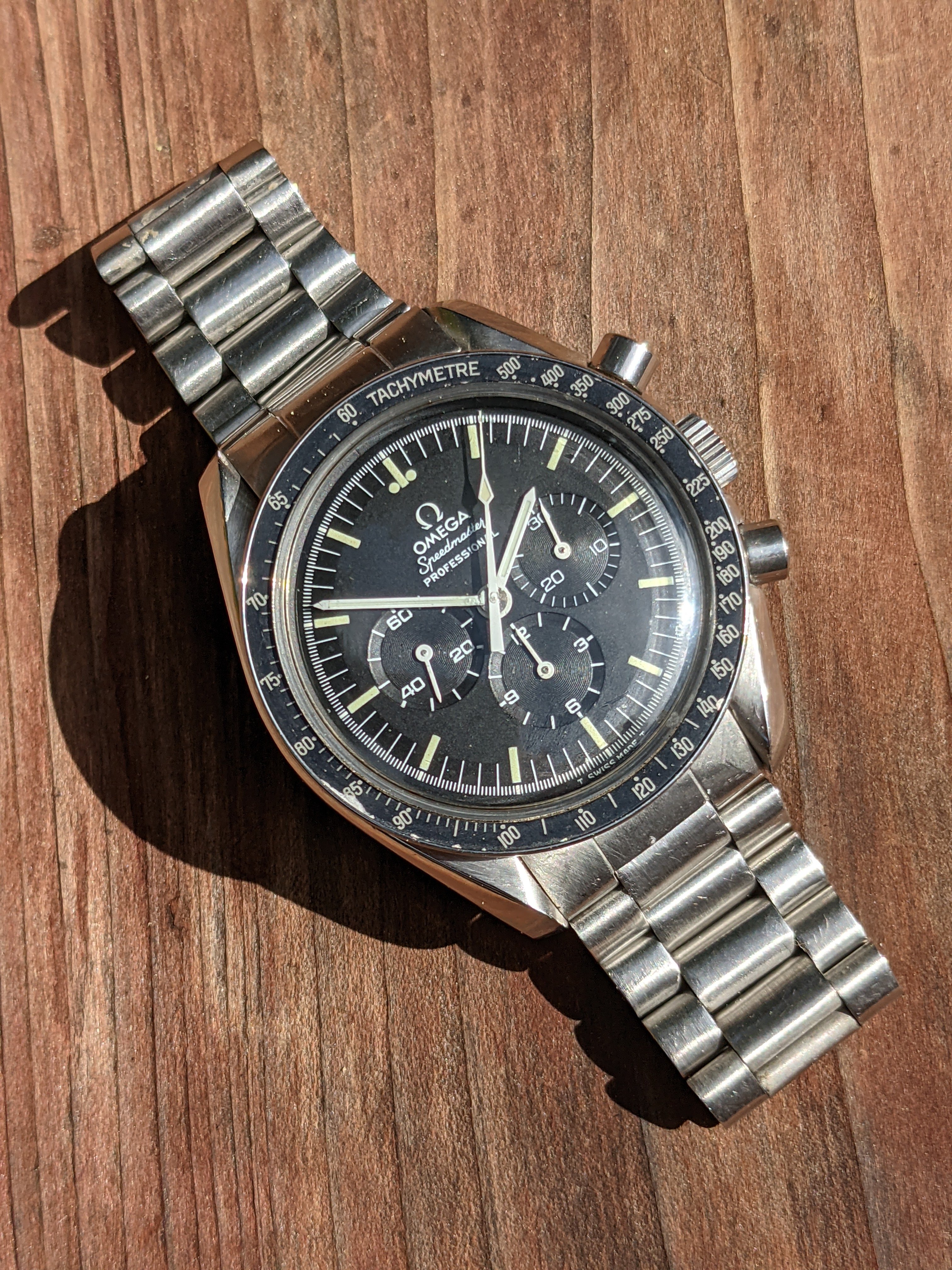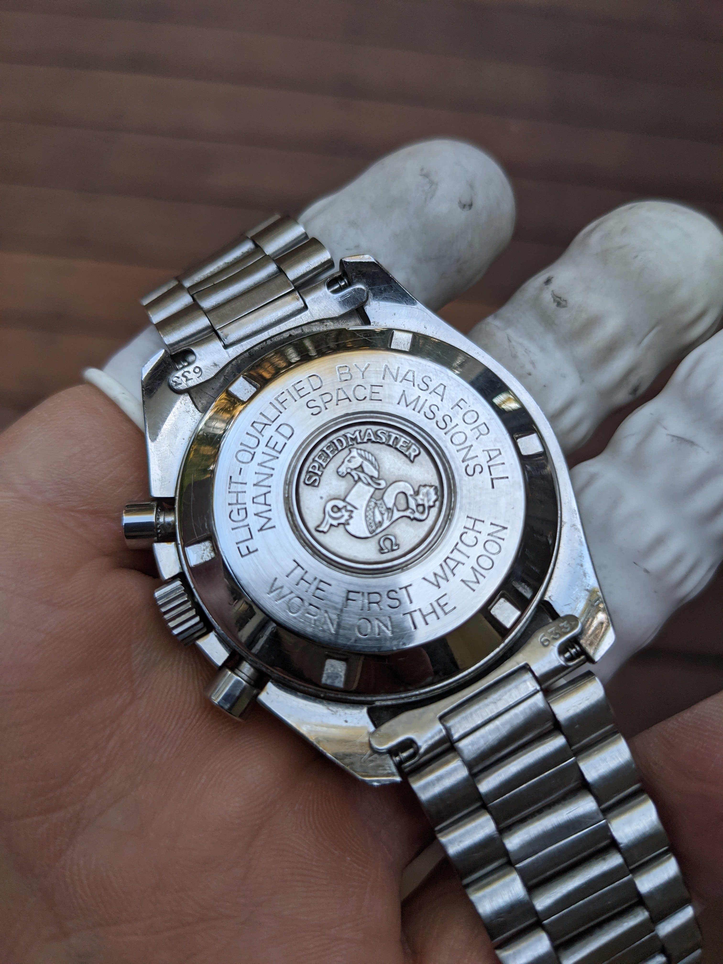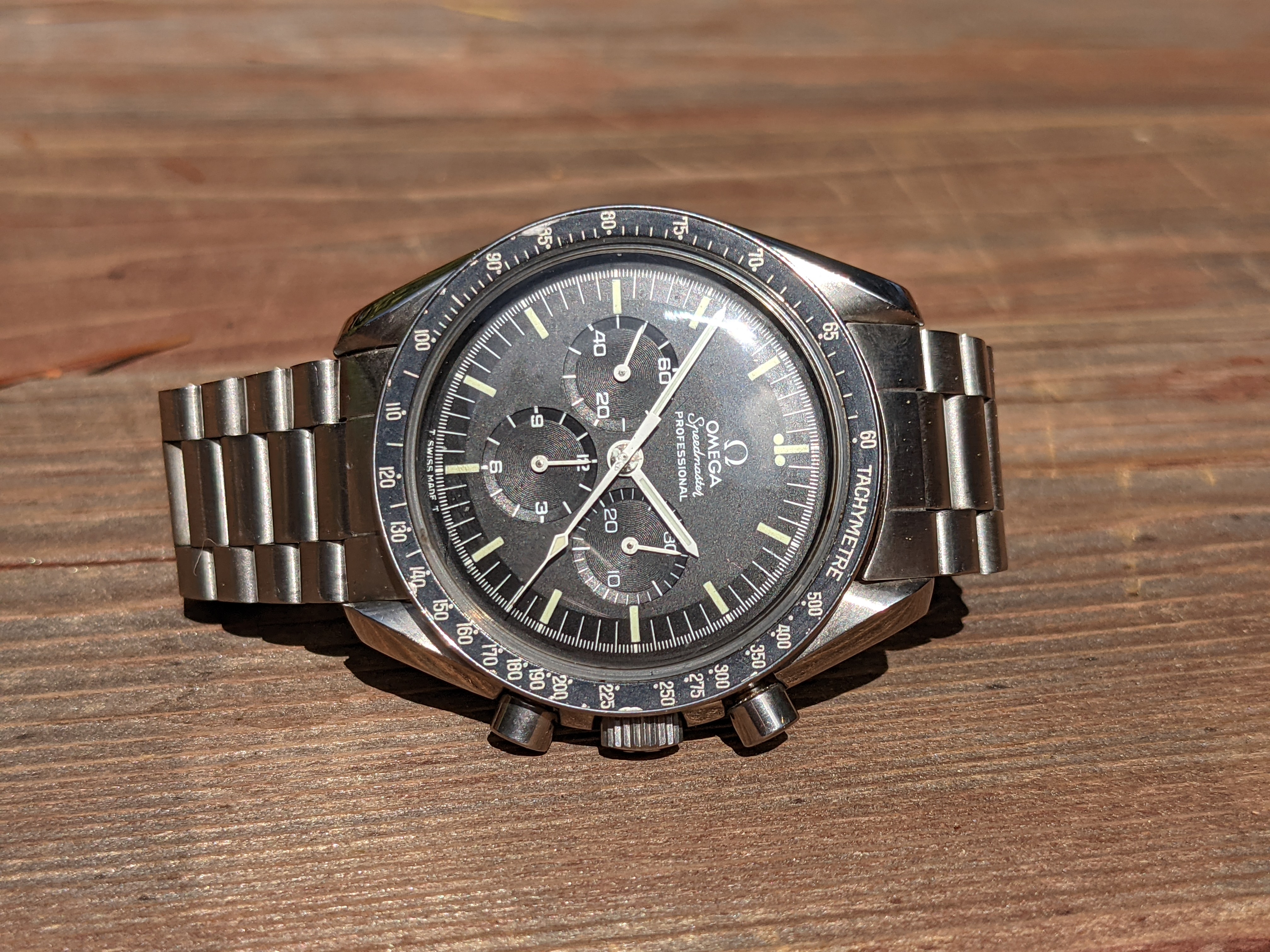 Service: This Speedy received a full service in October 2018 at World Time in San José, California. The owner is a Speedmaster collector and knows his business. As you'll see from the timegrapher photos, they did a great job: the watch runs at -1 to +4 seconds per day with superb amplitude and miniscule beat error. The chronograph resets nicely to 0 (see link to video below). I haven’t opened the caseback since it was serviced, but could do so if it’s important to you.