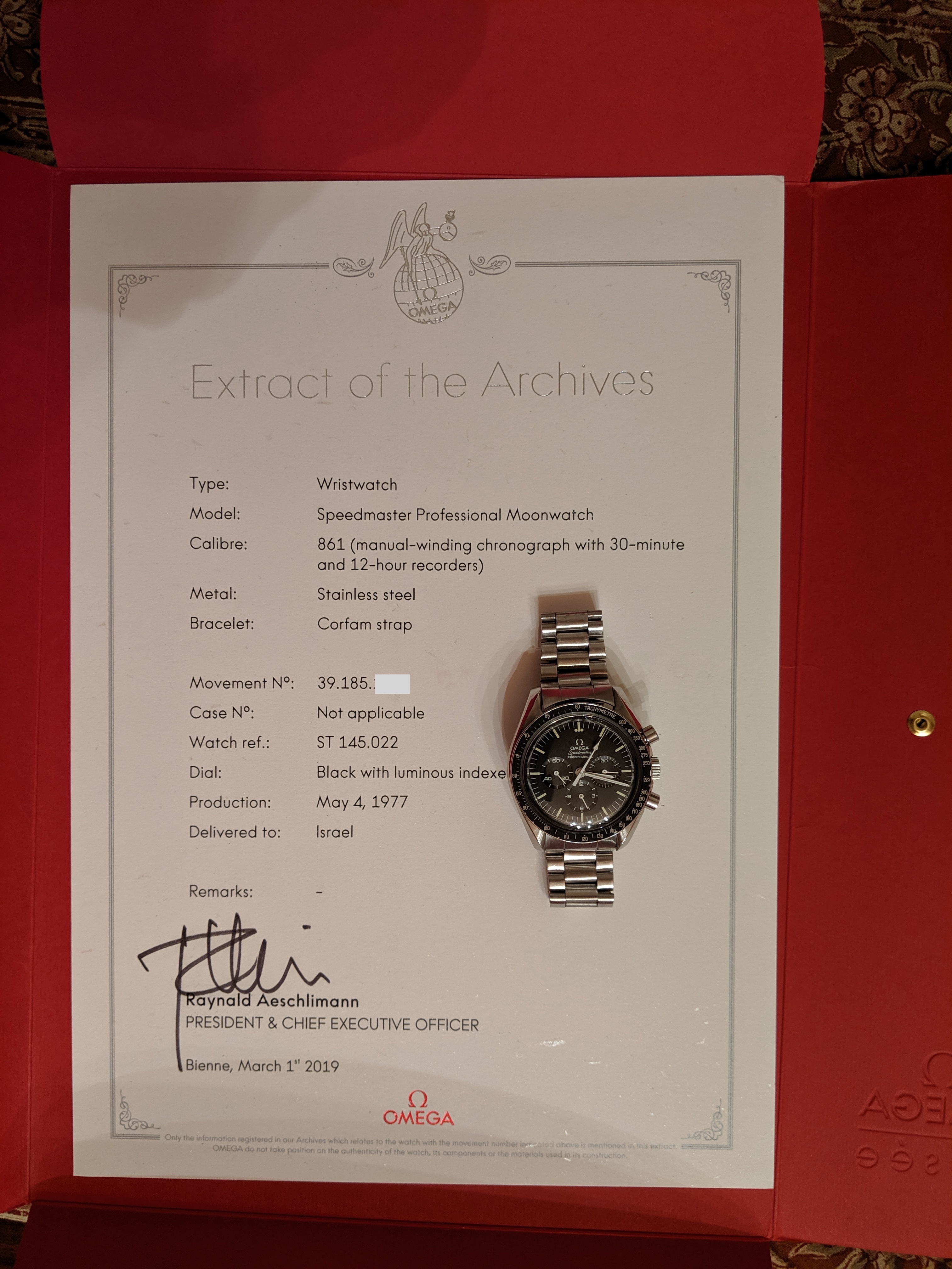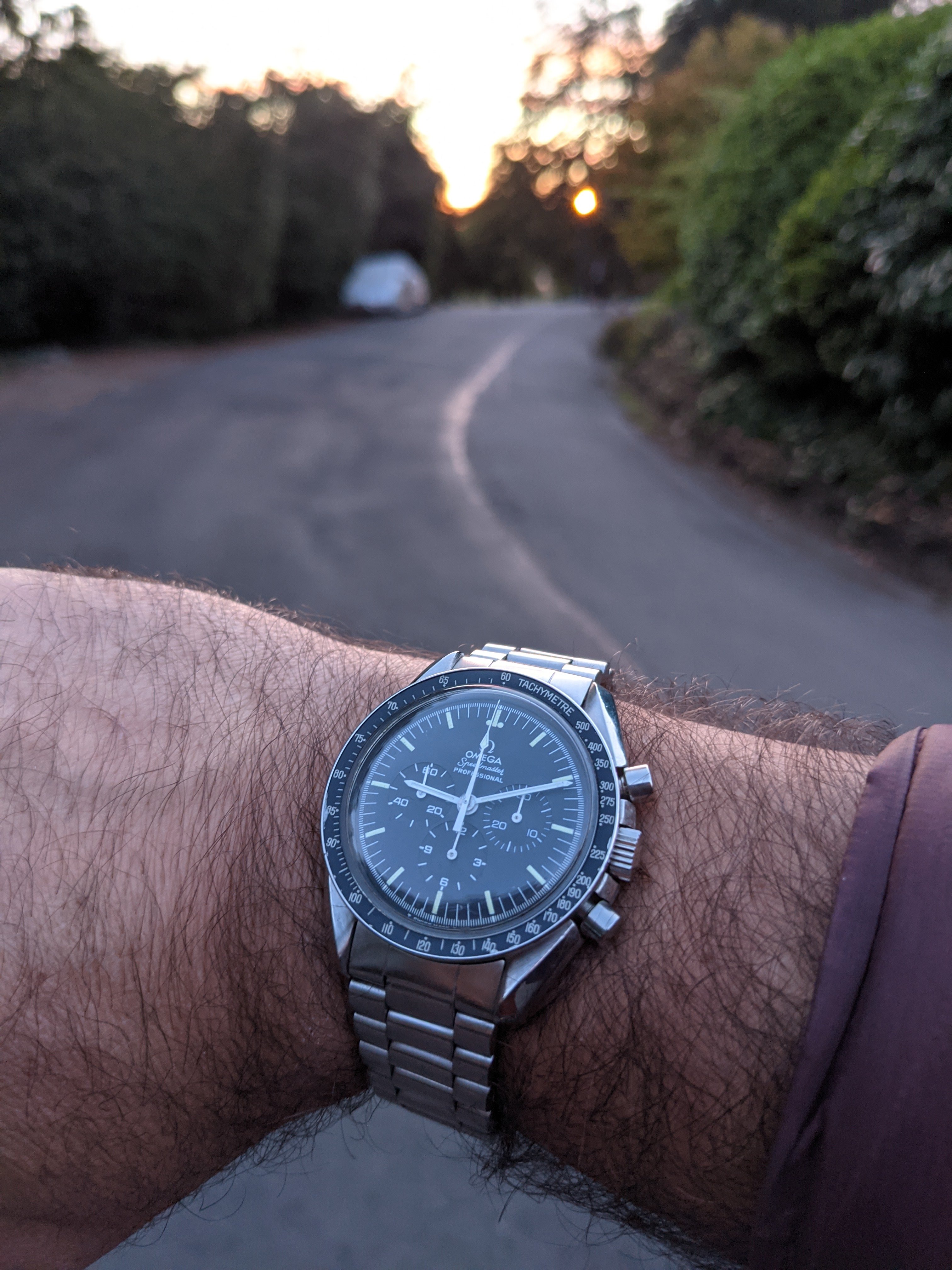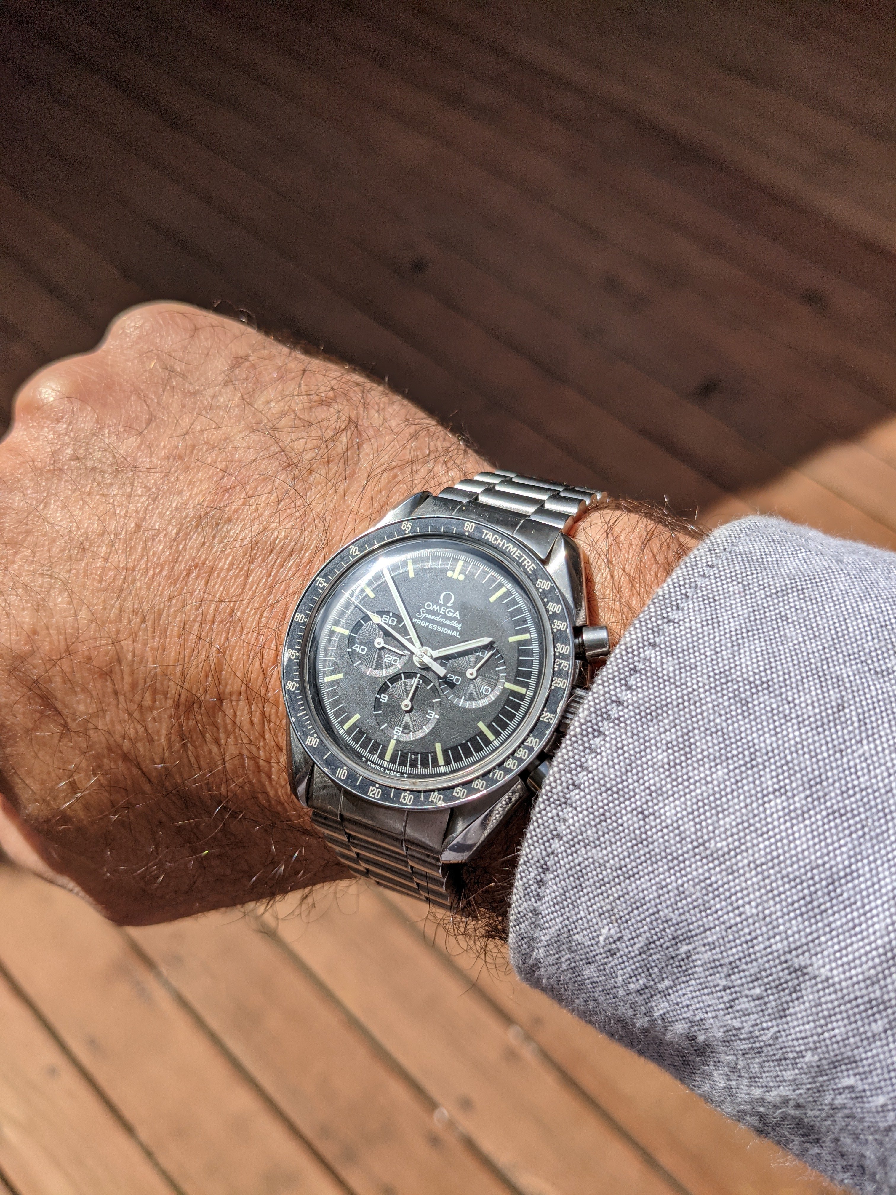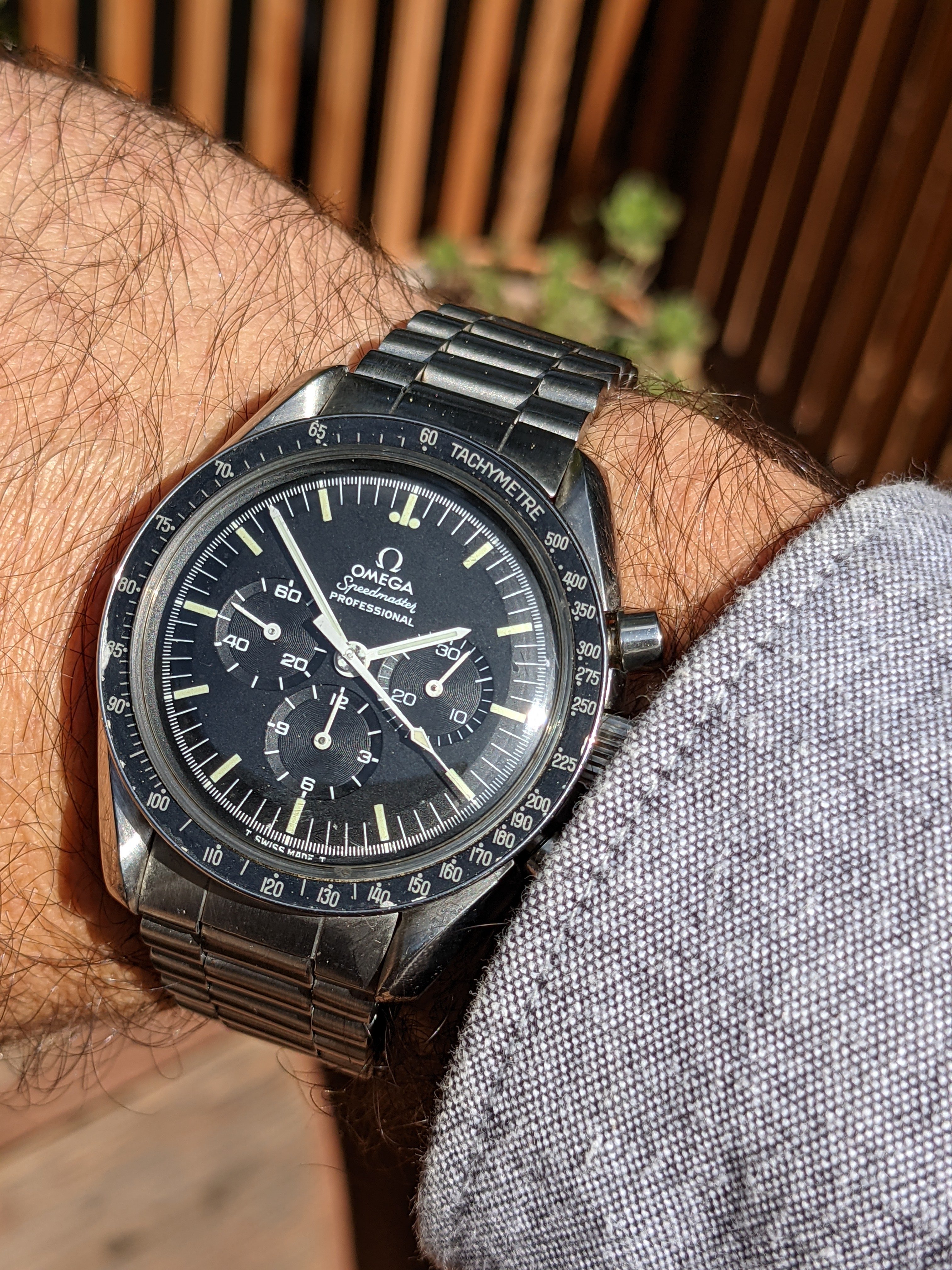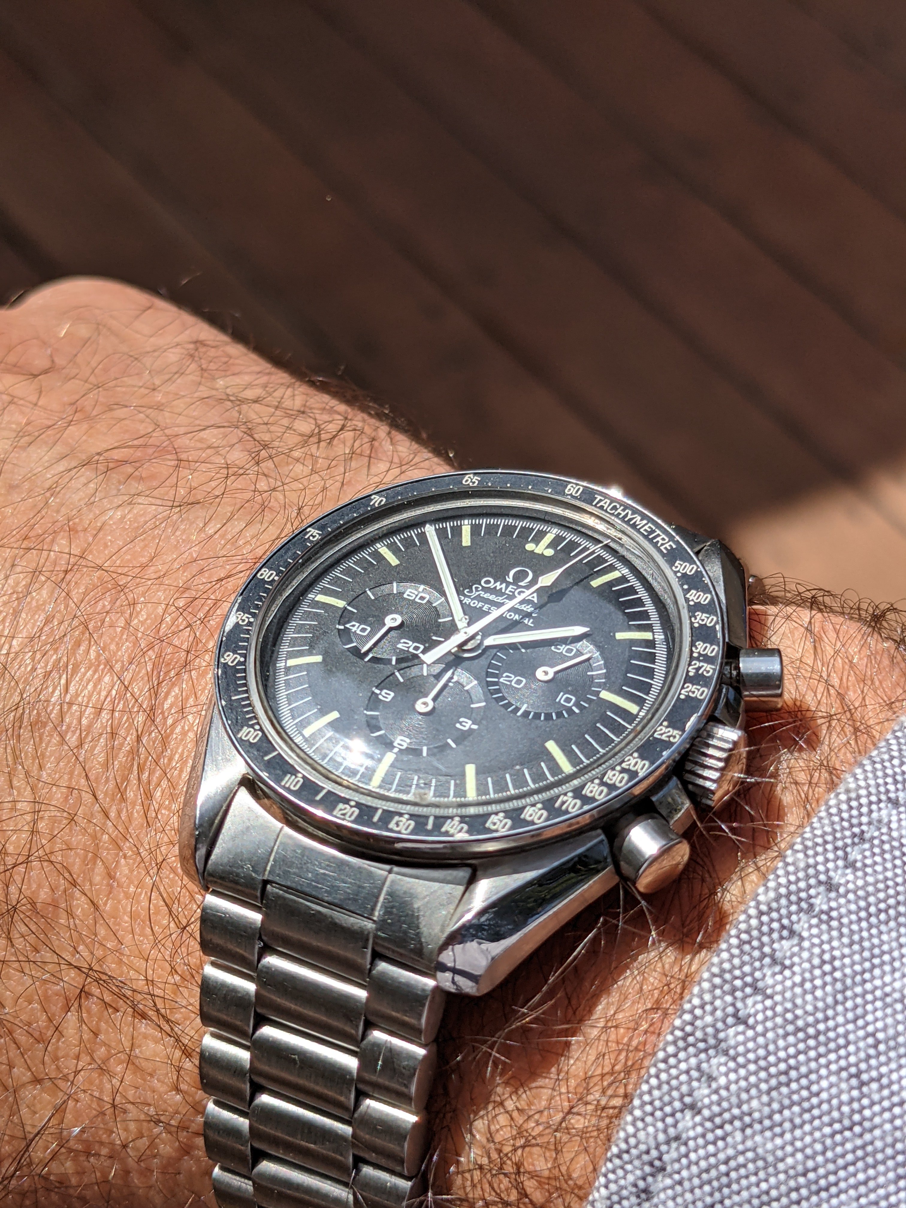 Service: This Speedy received a full service in October 2018 at World Time in San José, California. The owner is a Speedmaster collector and knows his business. As you'll see from the timegrapher photos, they did a great job: the watch runs at -1 to +4 seconds per day with superb amplitude and miniscule beat error. The chronograph resets nicely to 0 (see link to video below). I haven’t opened the caseback since it was serviced, but could do so if it’s important to you.