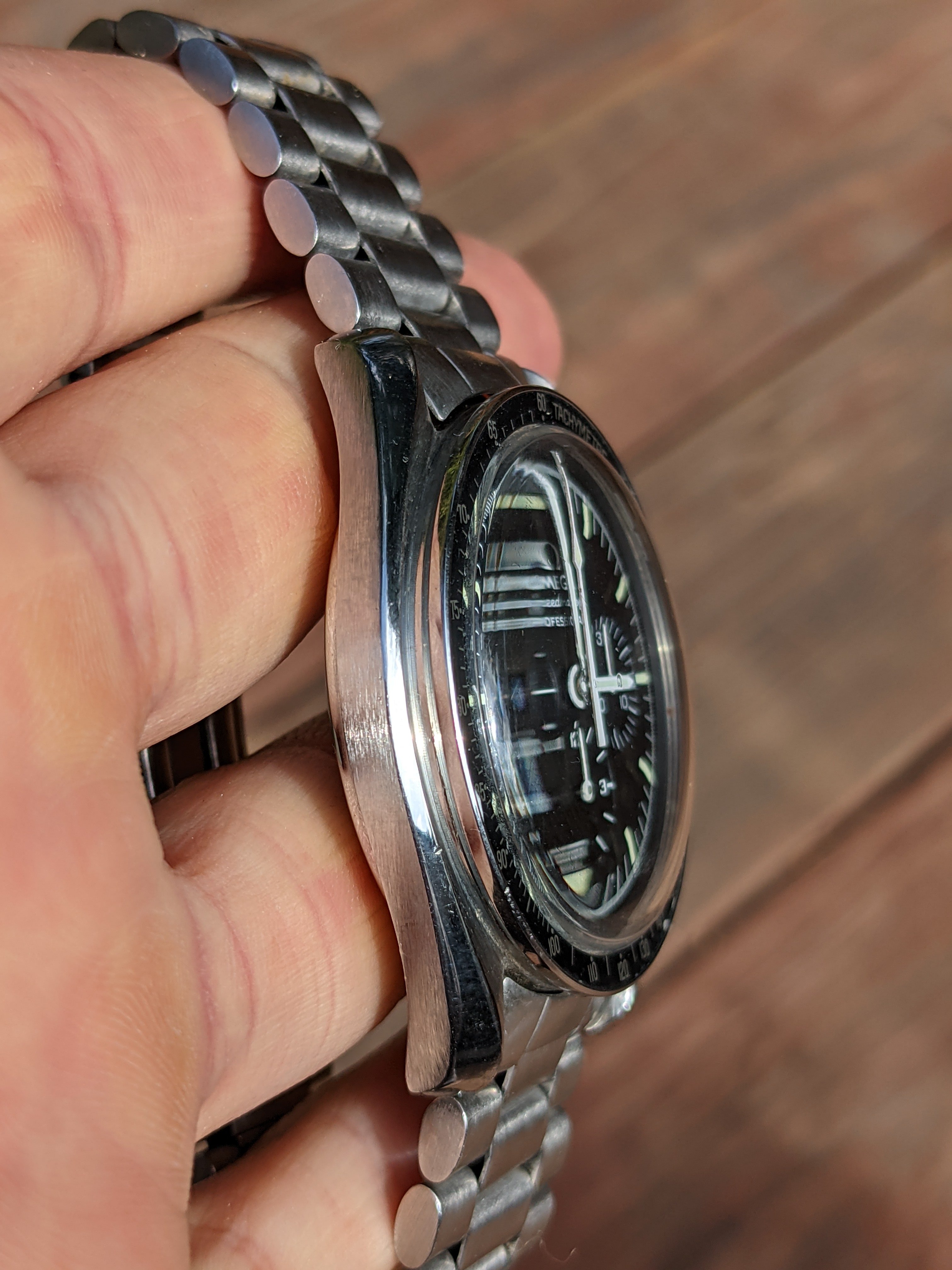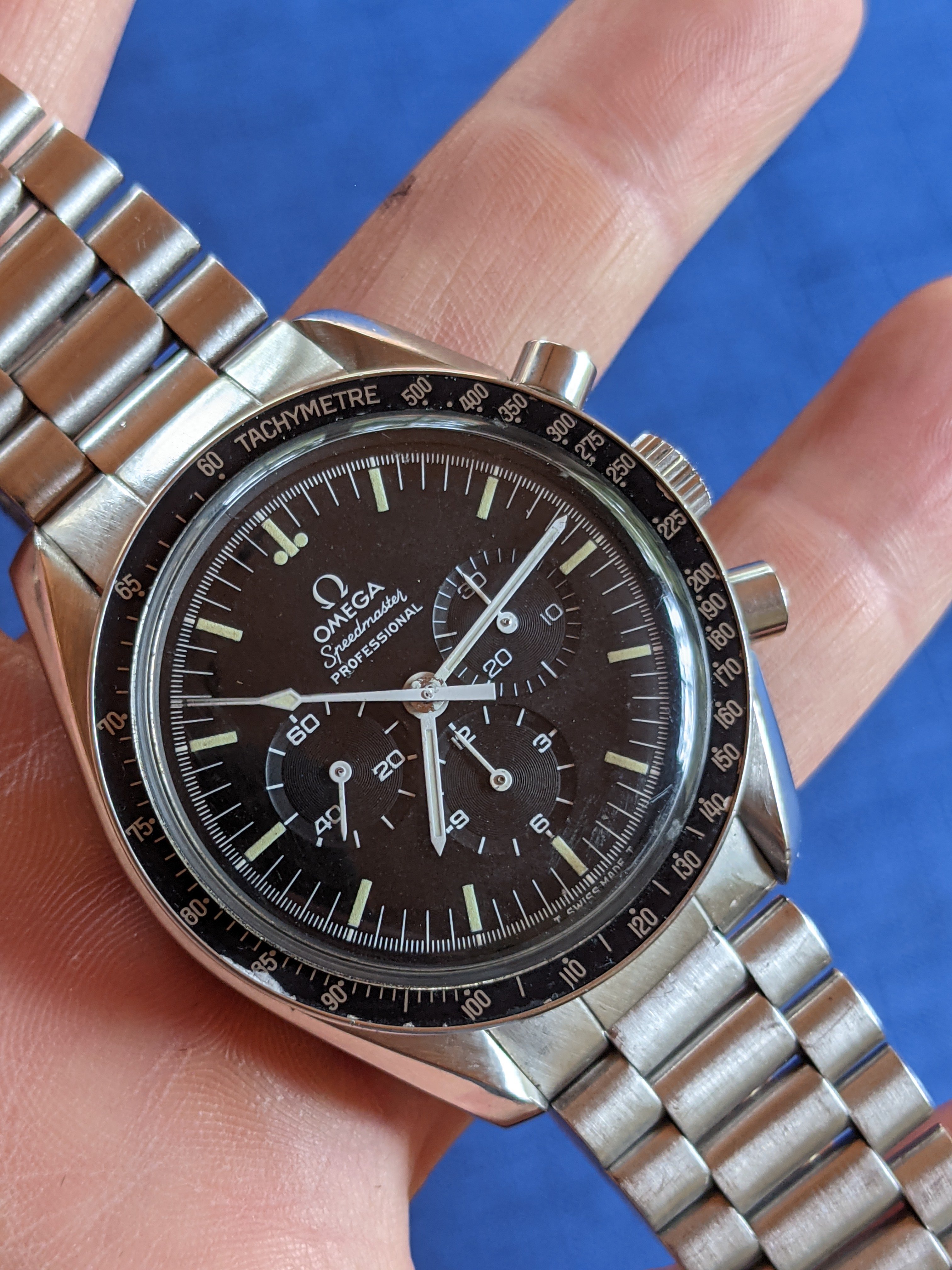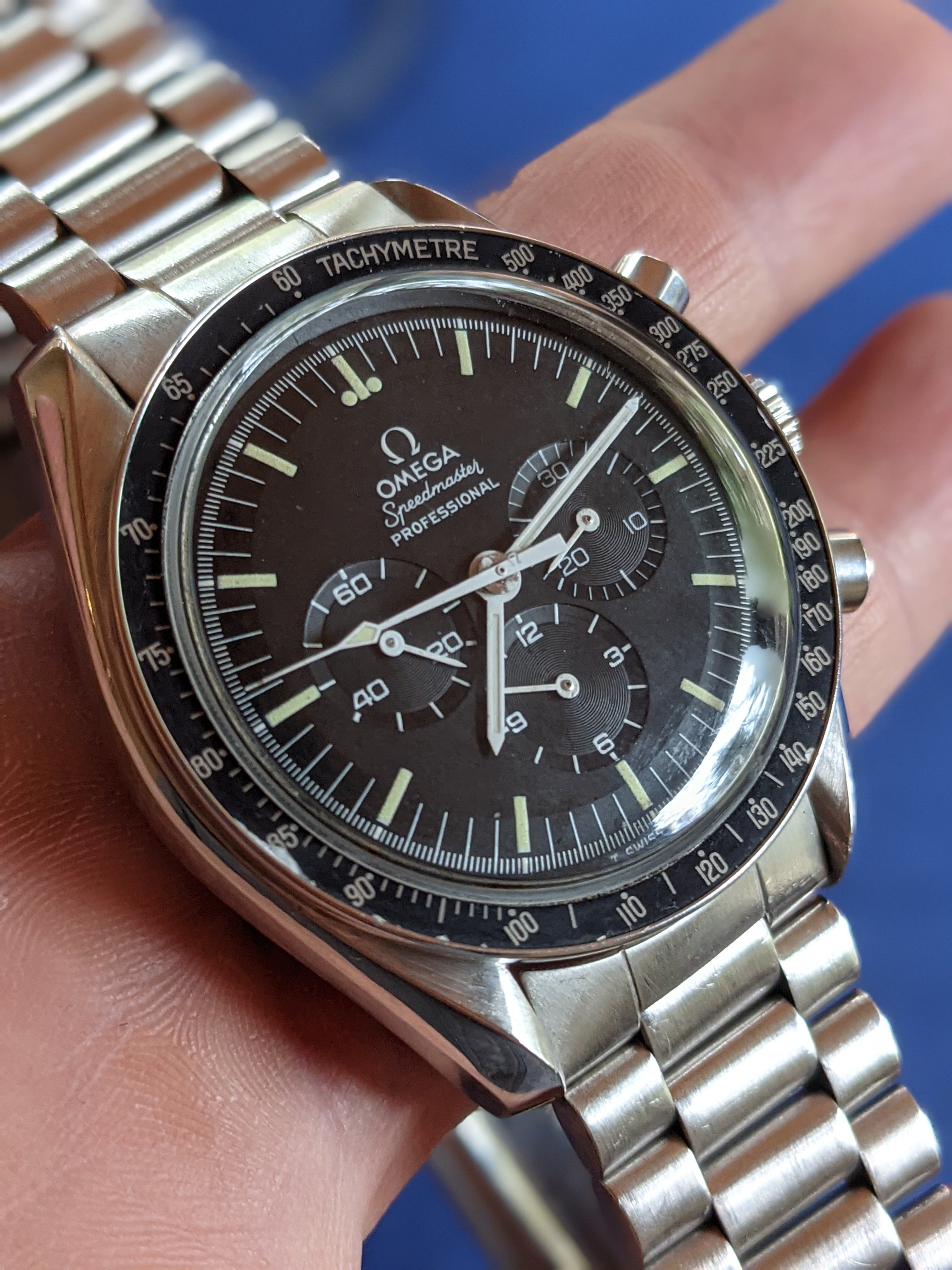 Case: The case and bracelet area in great shape, with a tiny fleabite on the case at 8 o'clock and some chips on the bezel paint. The caseback is sharp and crisp. It has a genuine Omega Hesalite crystal. I’d rate this at 85% on the Timezone condition scale and between 'good' and 'very good' on the Speedmaster 101 scale.