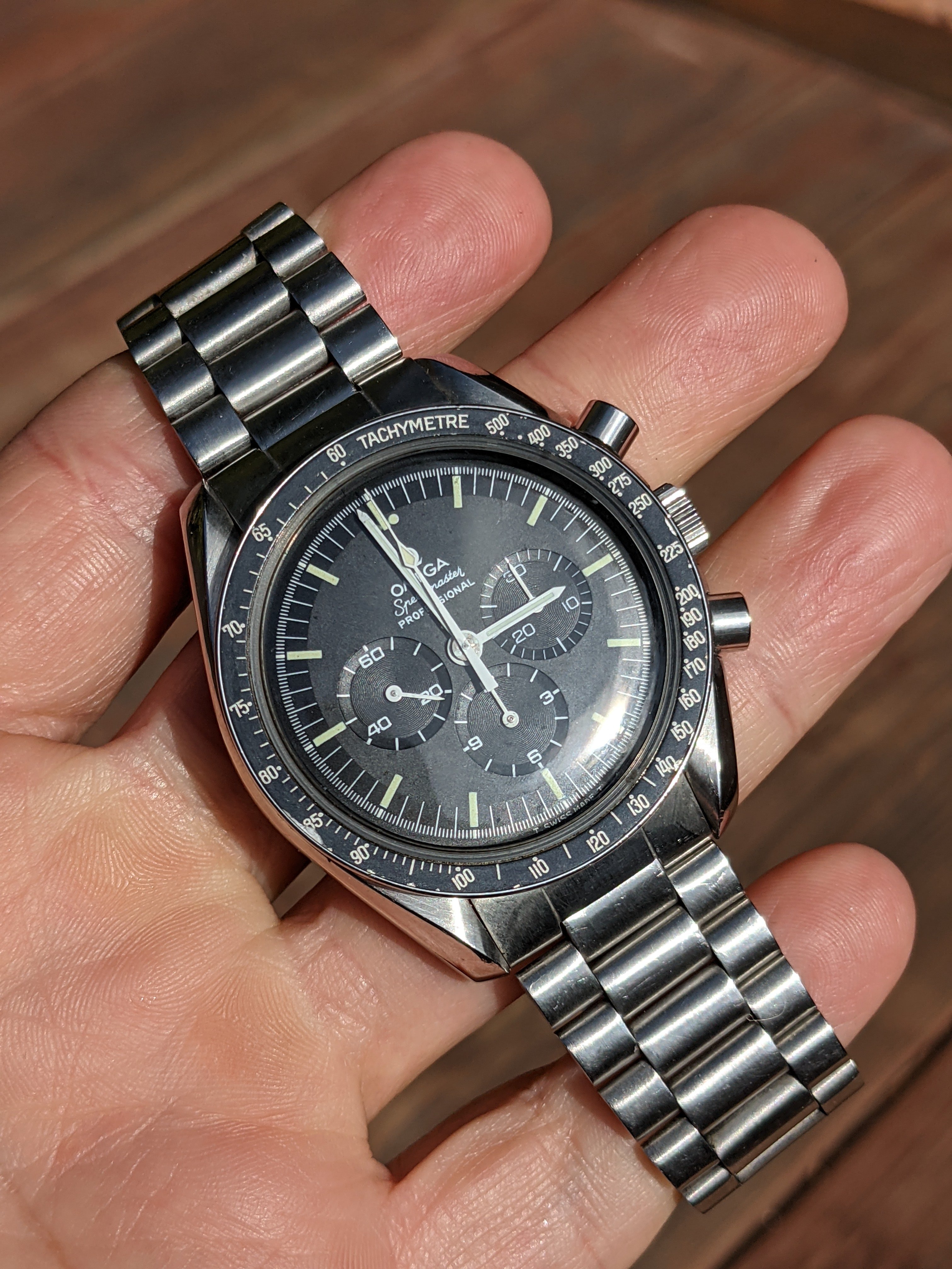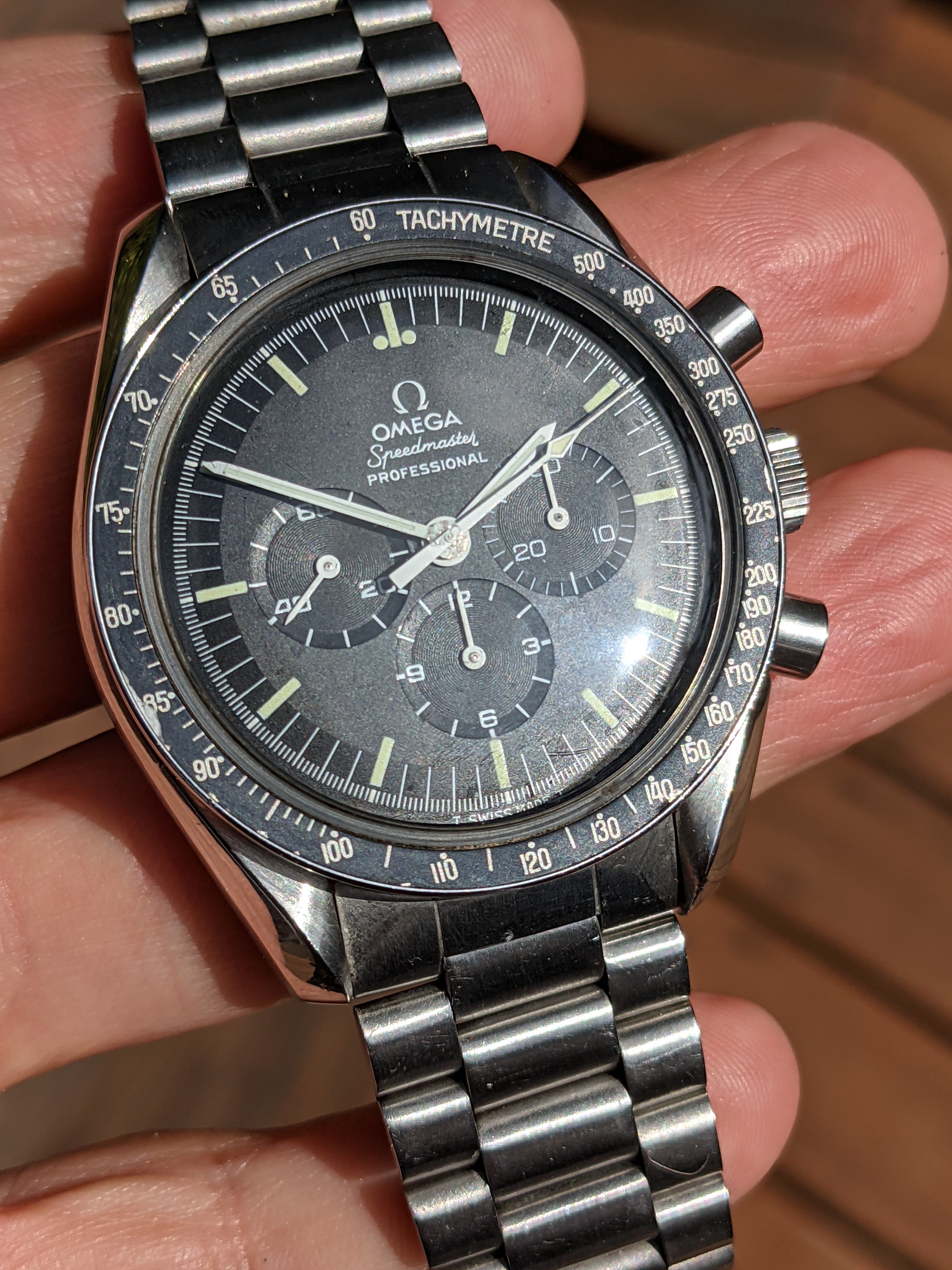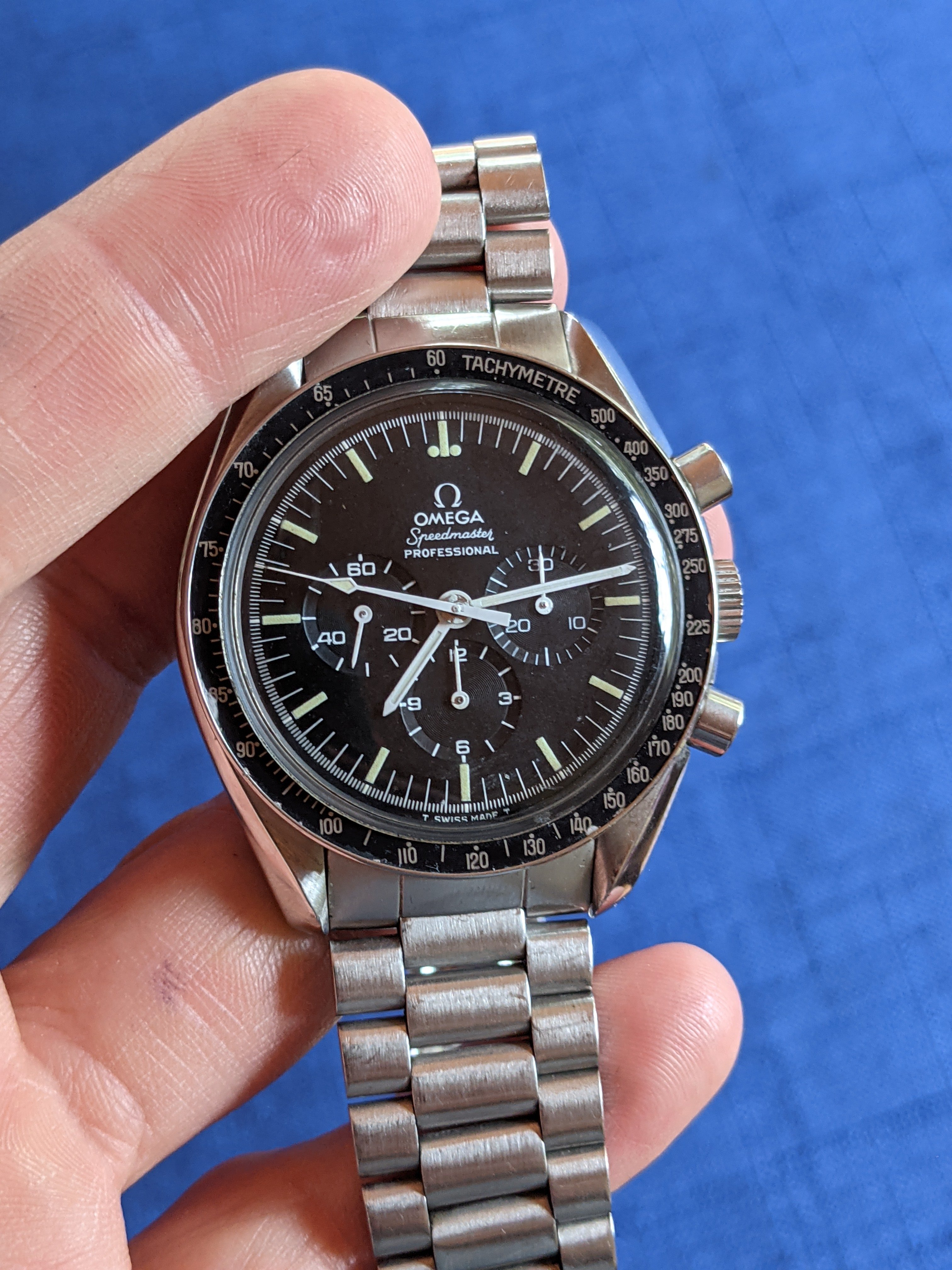 Case: The case and bracelet area in great shape, with a tiny fleabite on the case at 8 o'clock and some chips on the bezel paint. The caseback is sharp and crisp. It has a genuine Omega Hesalite crystal. I’d rate this at 85% on the Timezone condition scale and between 'good' and 'very good' on the Speedmaster 101 scale.