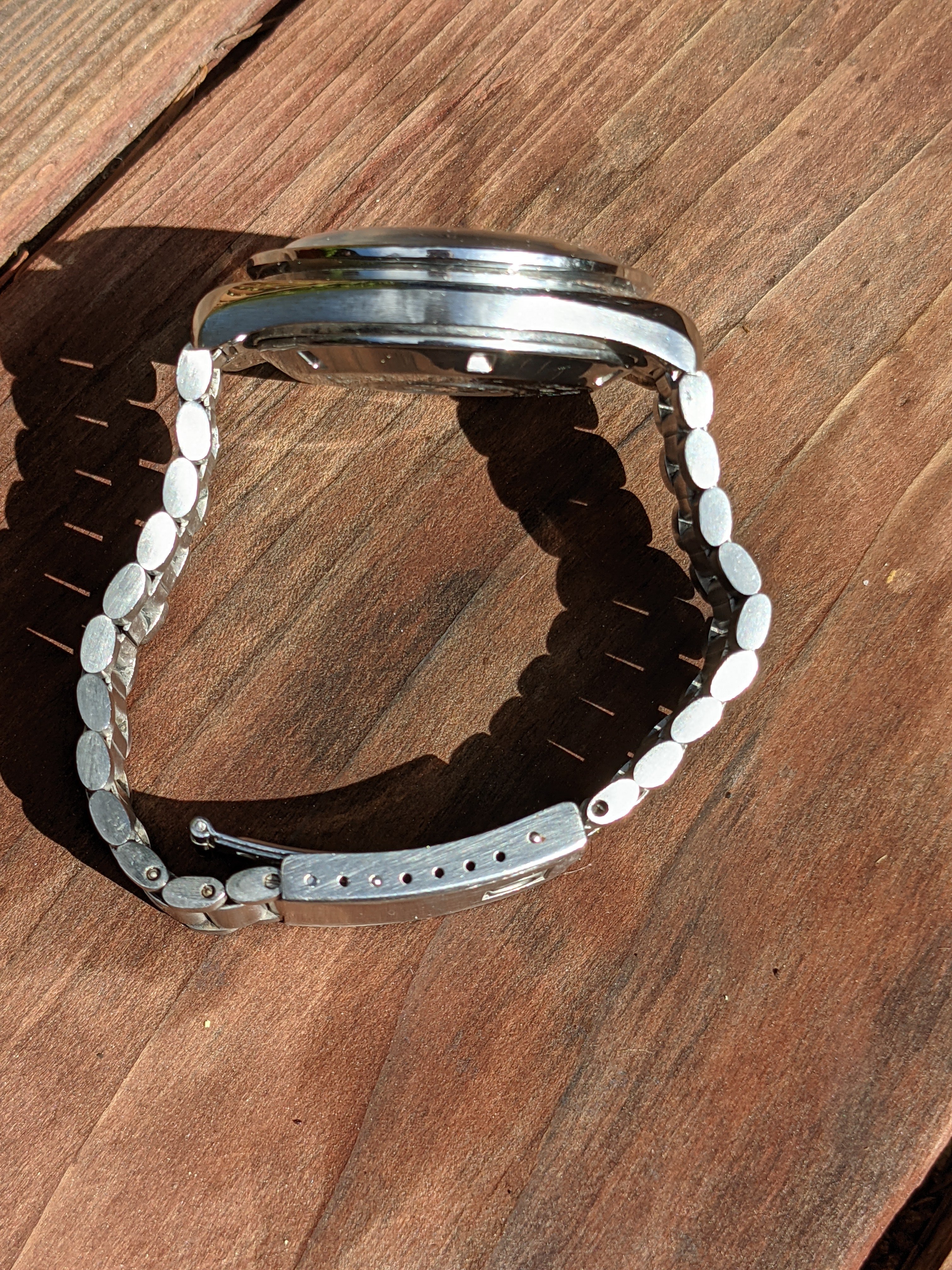 Bracelet: The bracelet is a nice period-correct 1171 with 633 end-links and trapezoidal Omega logo on the clasp, which dates it to before 1980. There is a light desk diving wear and a tiny ding on the clasp. It can accommodate a 7.5 inch/18.5 cm wrist, maybe a bit more. The extract shows that the watch originally came on a DuPont Corfam strap (a kind of synthetic leather). I don’t know when the bracelet was added, but it is period-appropriate to the watch.