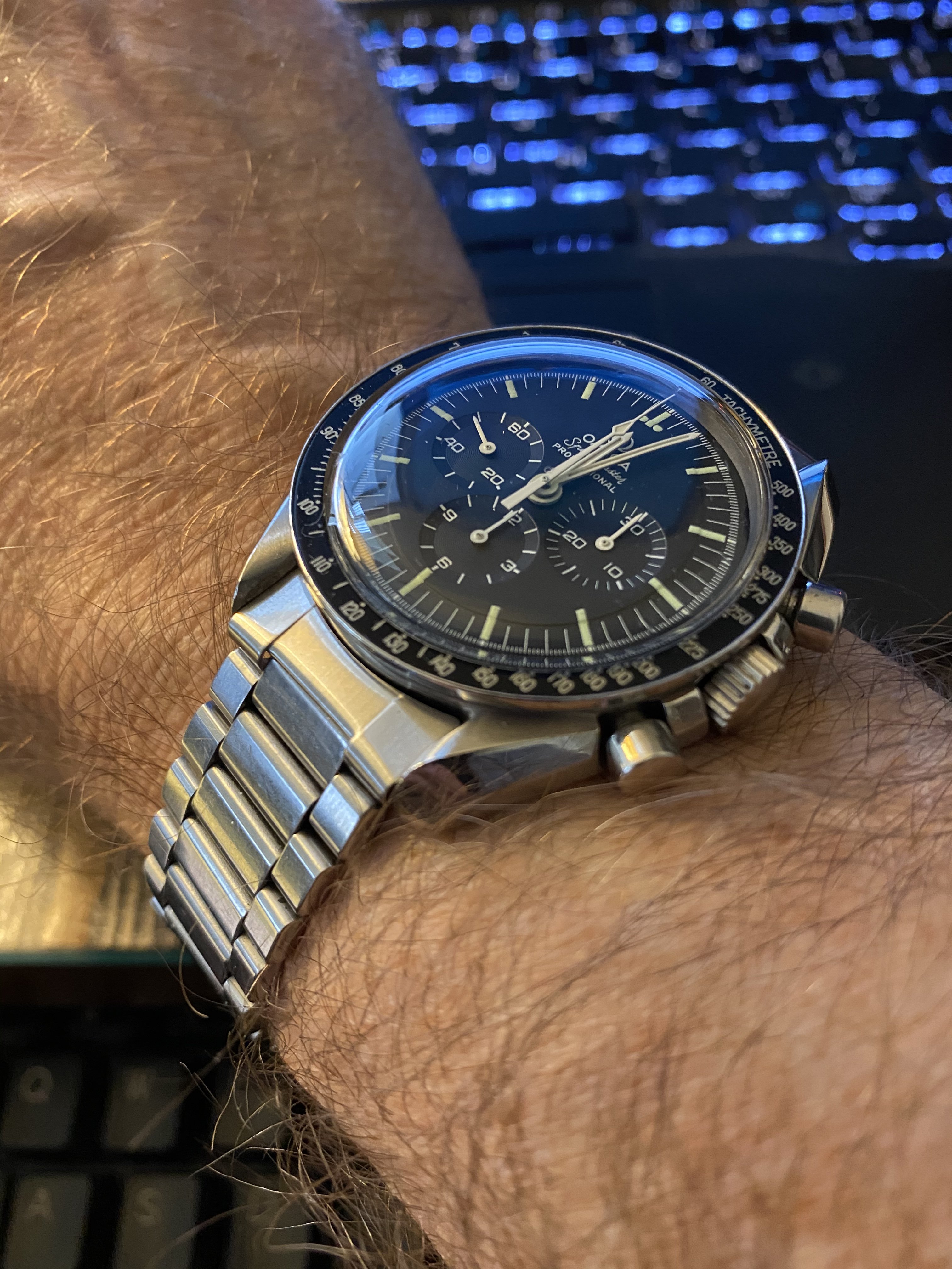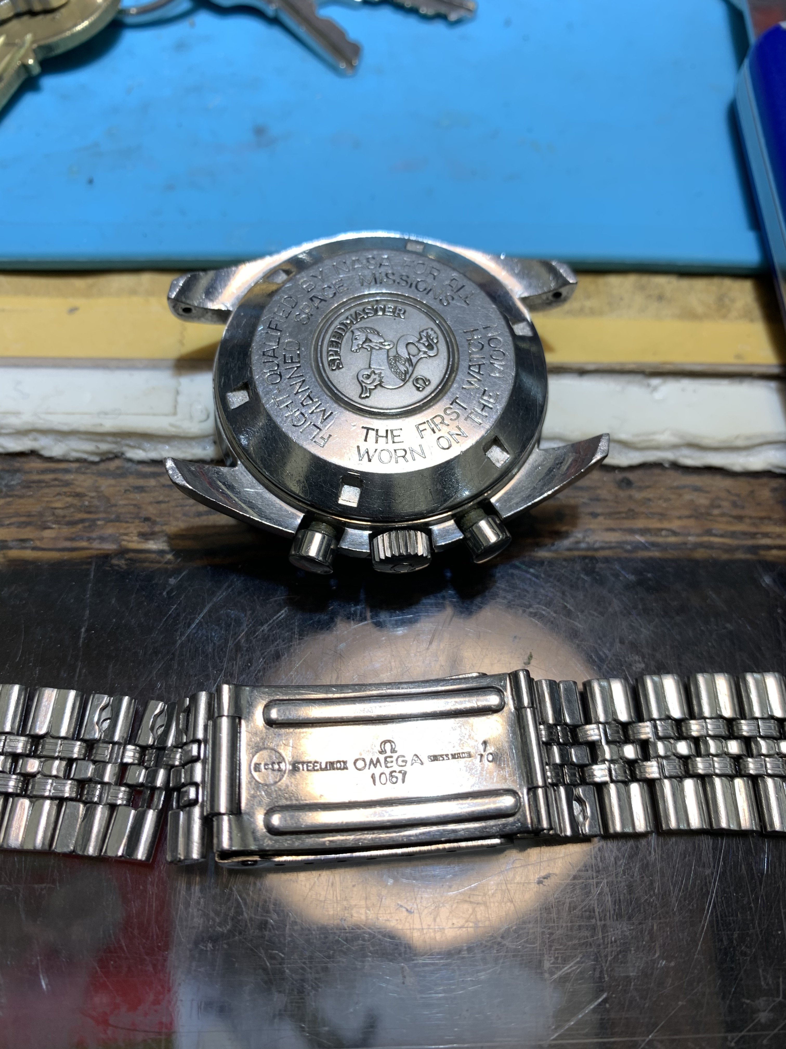 With the exception of the bracelet, the watch looks original and correct to me, but it’s really hard to tell without better photos. The case certainly shows some wear and the watch is in need of a service. The offset hand on the 12 hour recorder is what we call “chrono creep” and a service will fix that. The 1067 bracelet is a Seamaster bracelet. Attached is a link to a table that shows the period correct Speedmaster bracelets for each Speedmaster reference. Hope this helps.