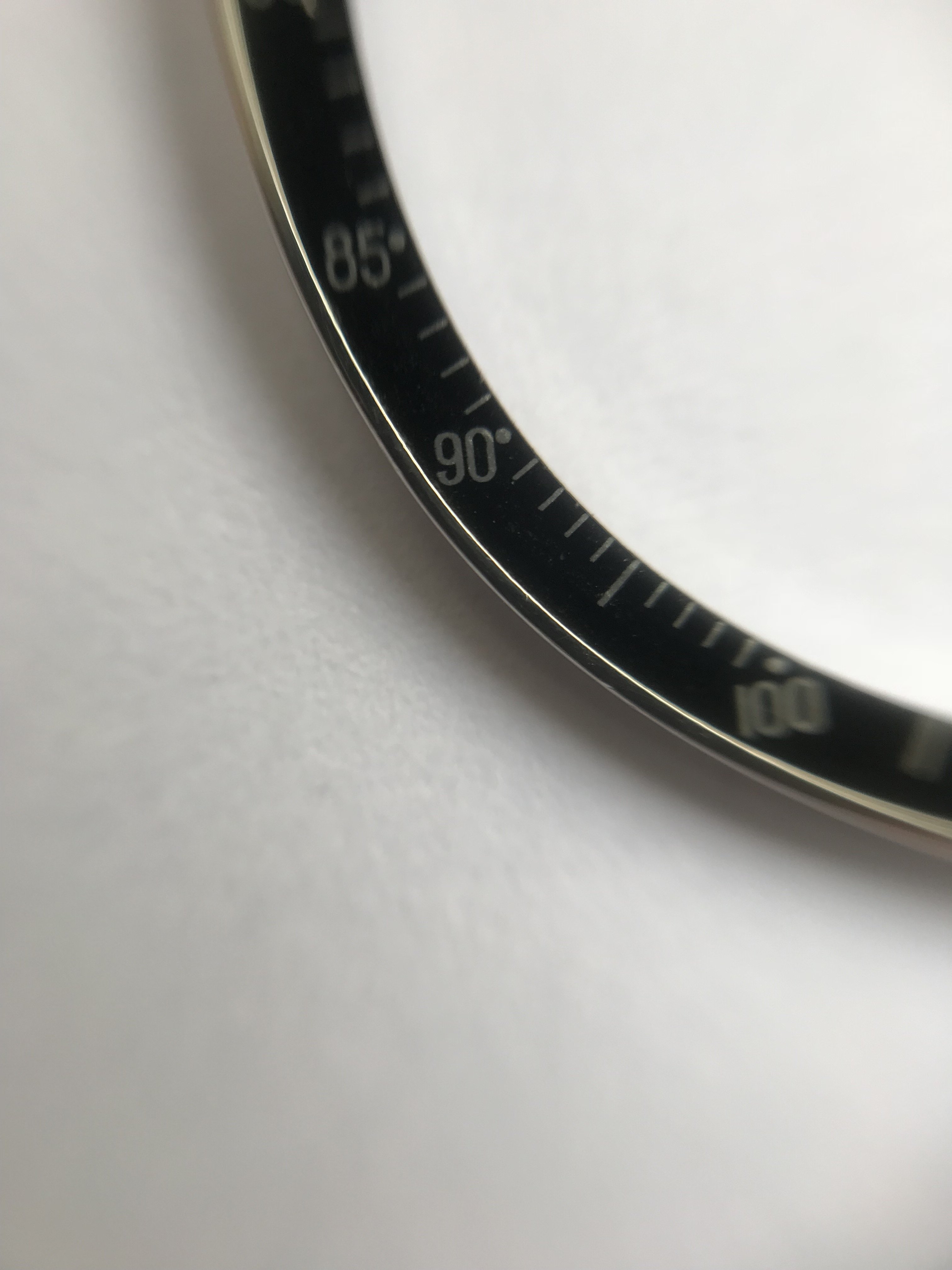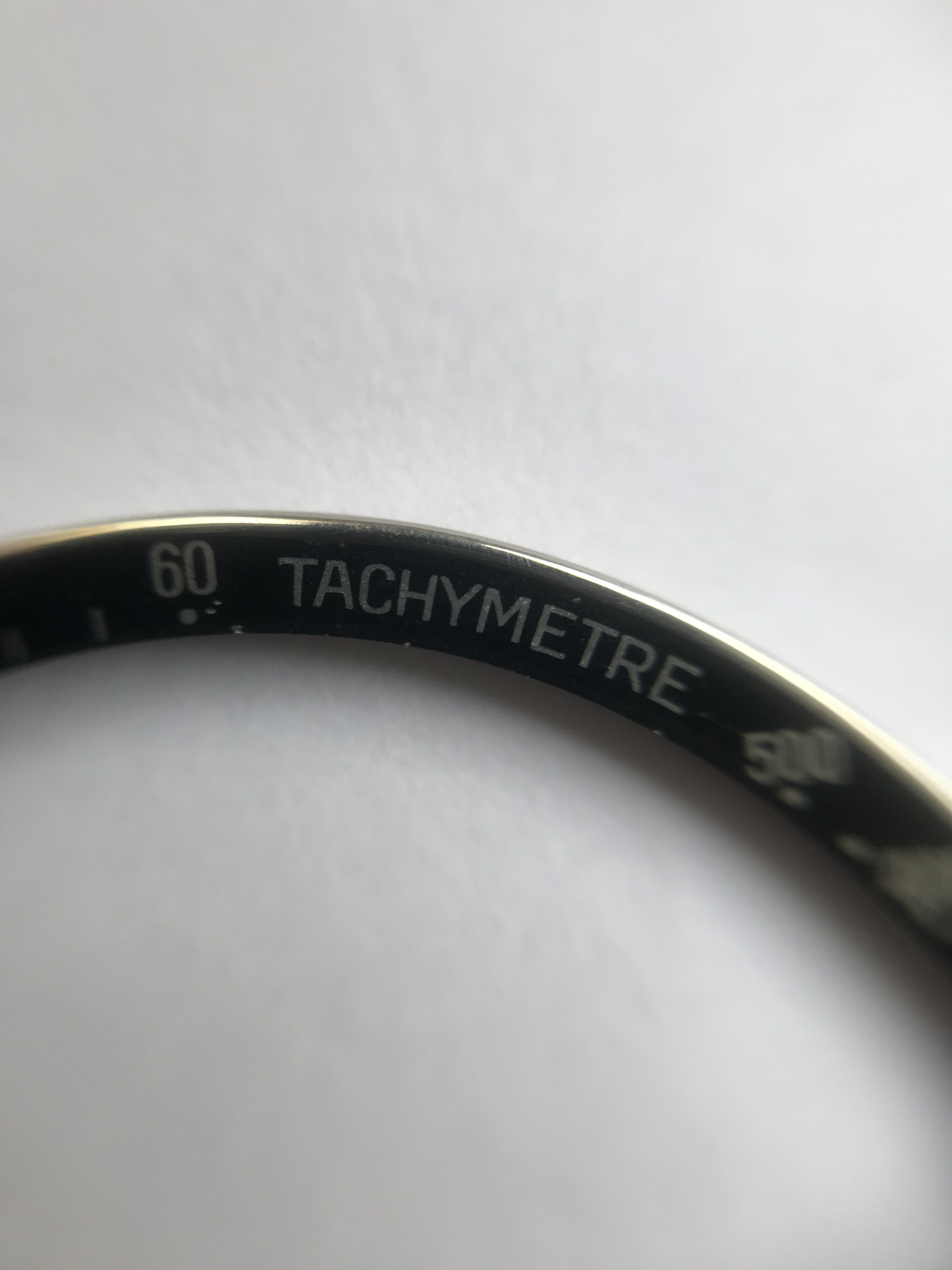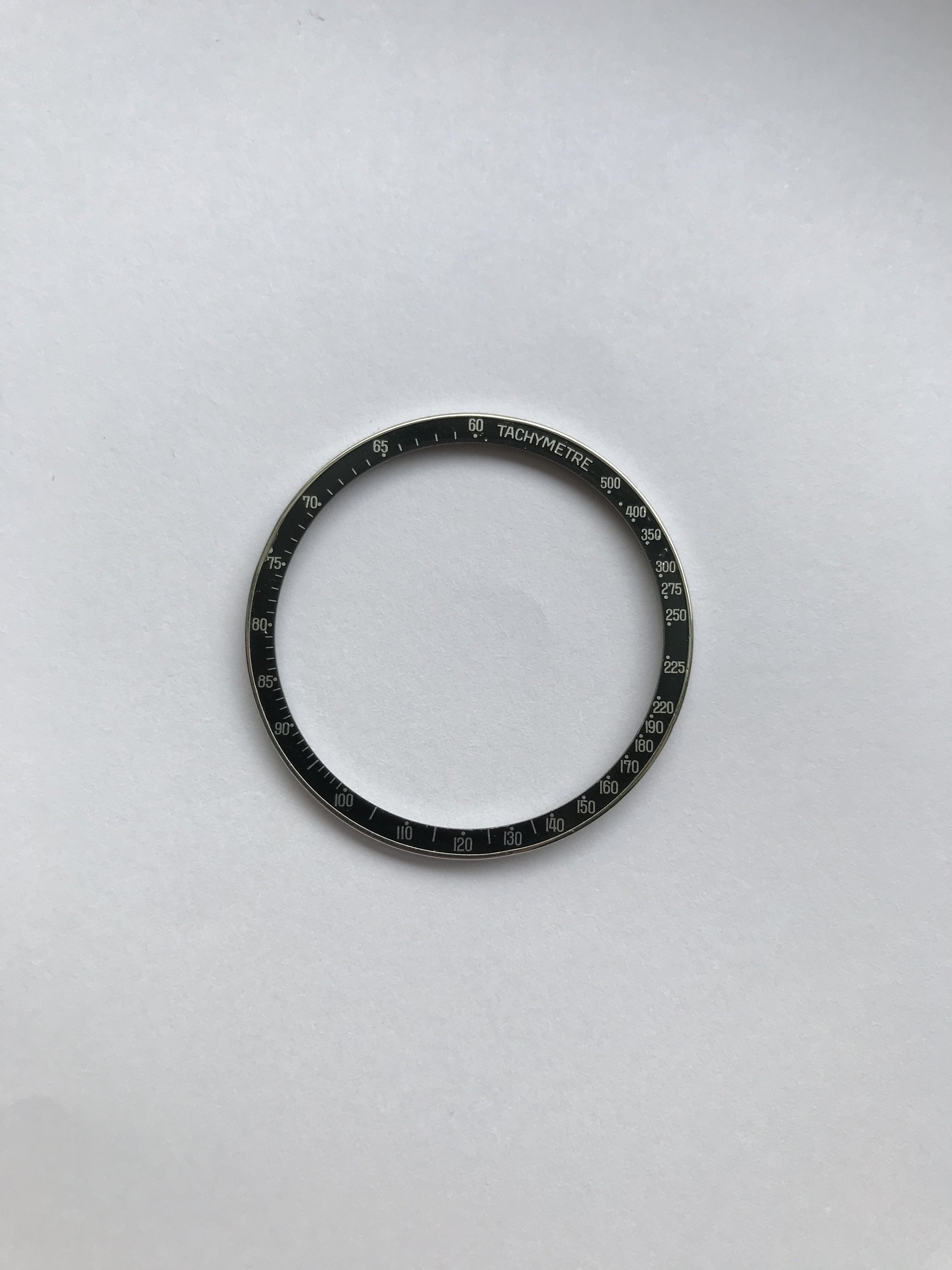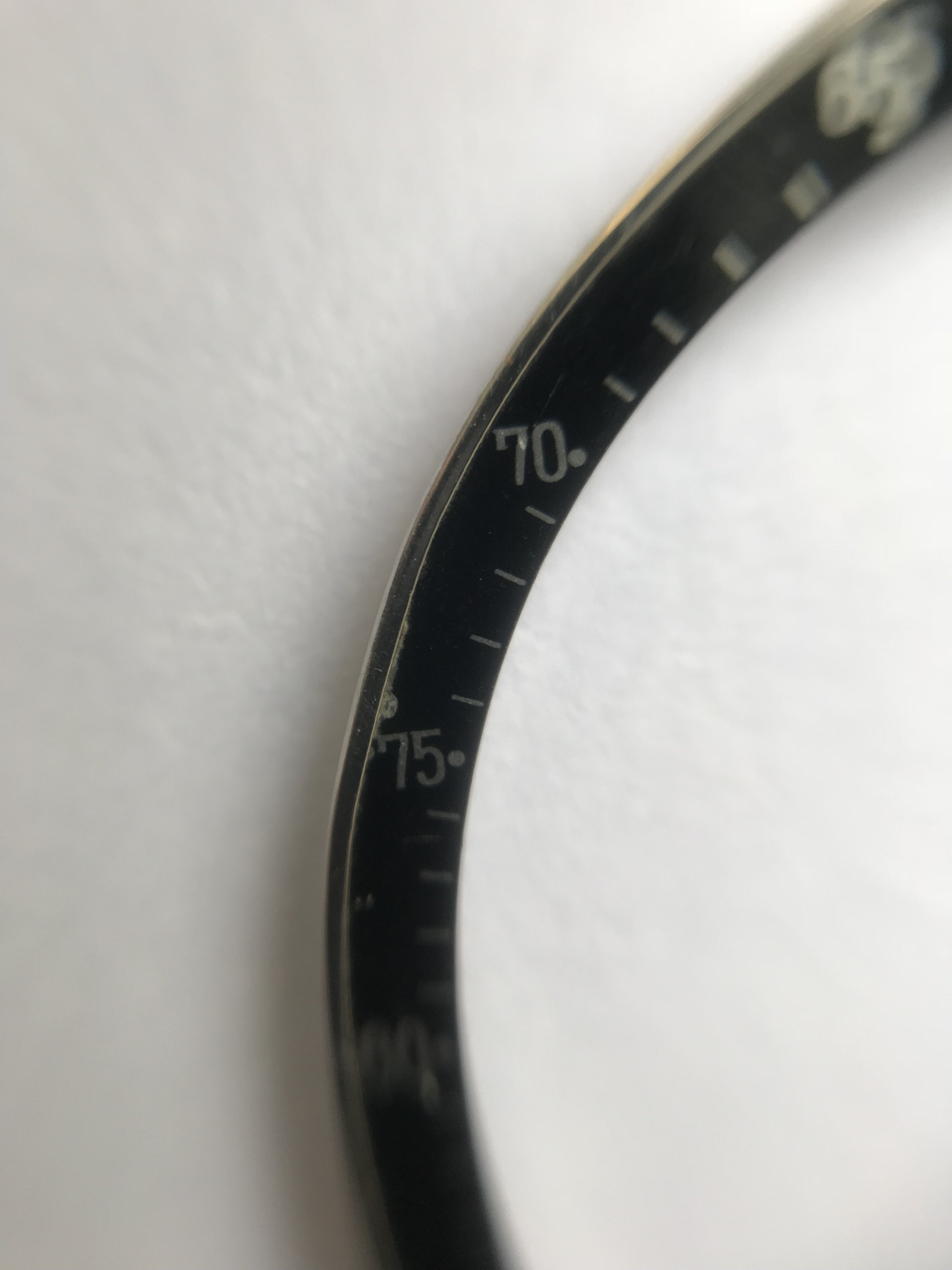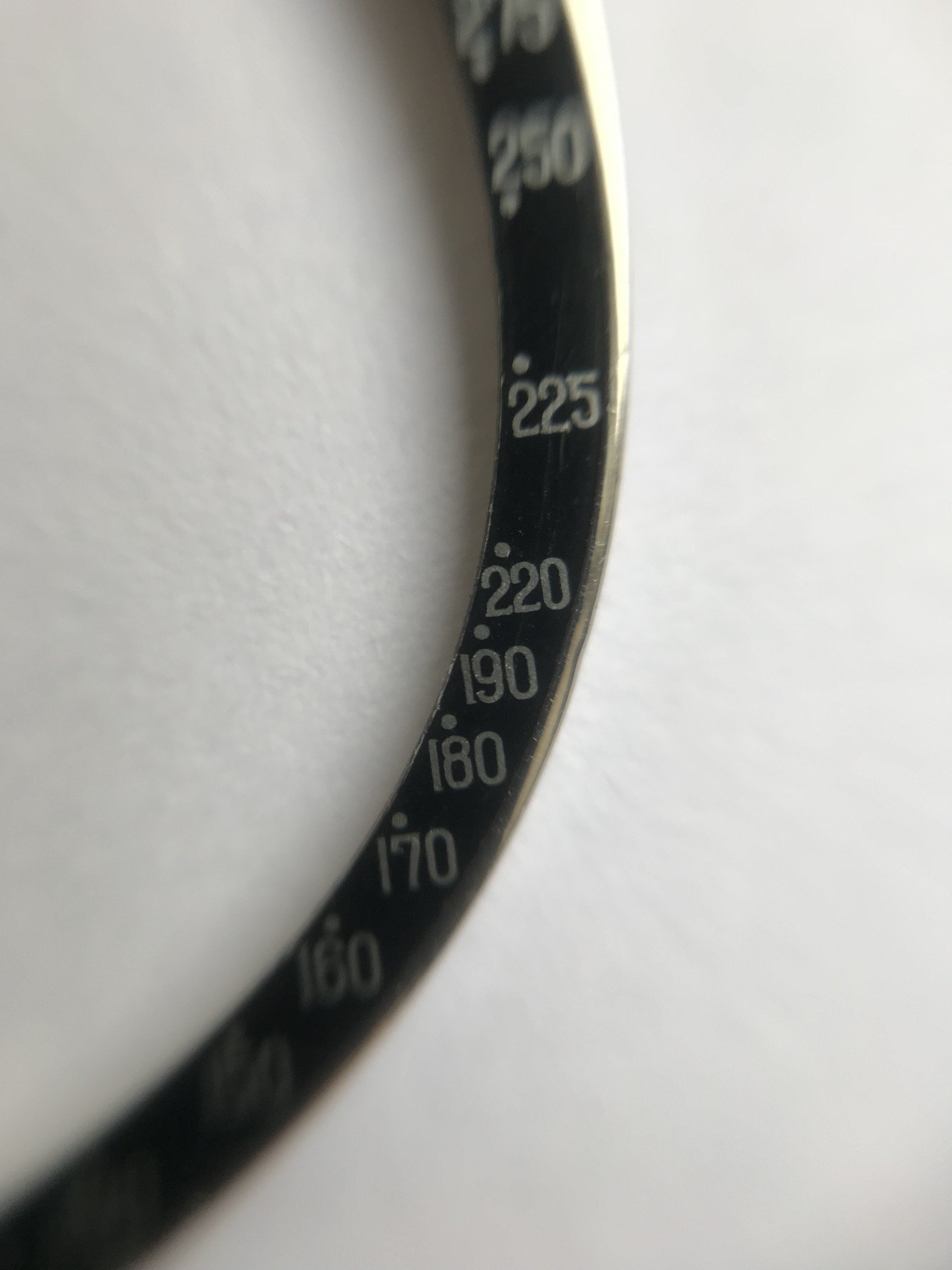 ·I would like to offer my 220 bezel from my 69 Speedmaster as I now have a faded grey bezel without the 220 that I prefer and the watch is a keeper anyway. The condition is very good but not mint as can be seen in the photos. I have taken some macro shots of the important parts but if anymore photos are required please let me know. Difficult to price this but given the condition and the lack of previous sales to link to but I would like £1100 including postage in the Uk. I'm also happy to ship outside the UK at cost