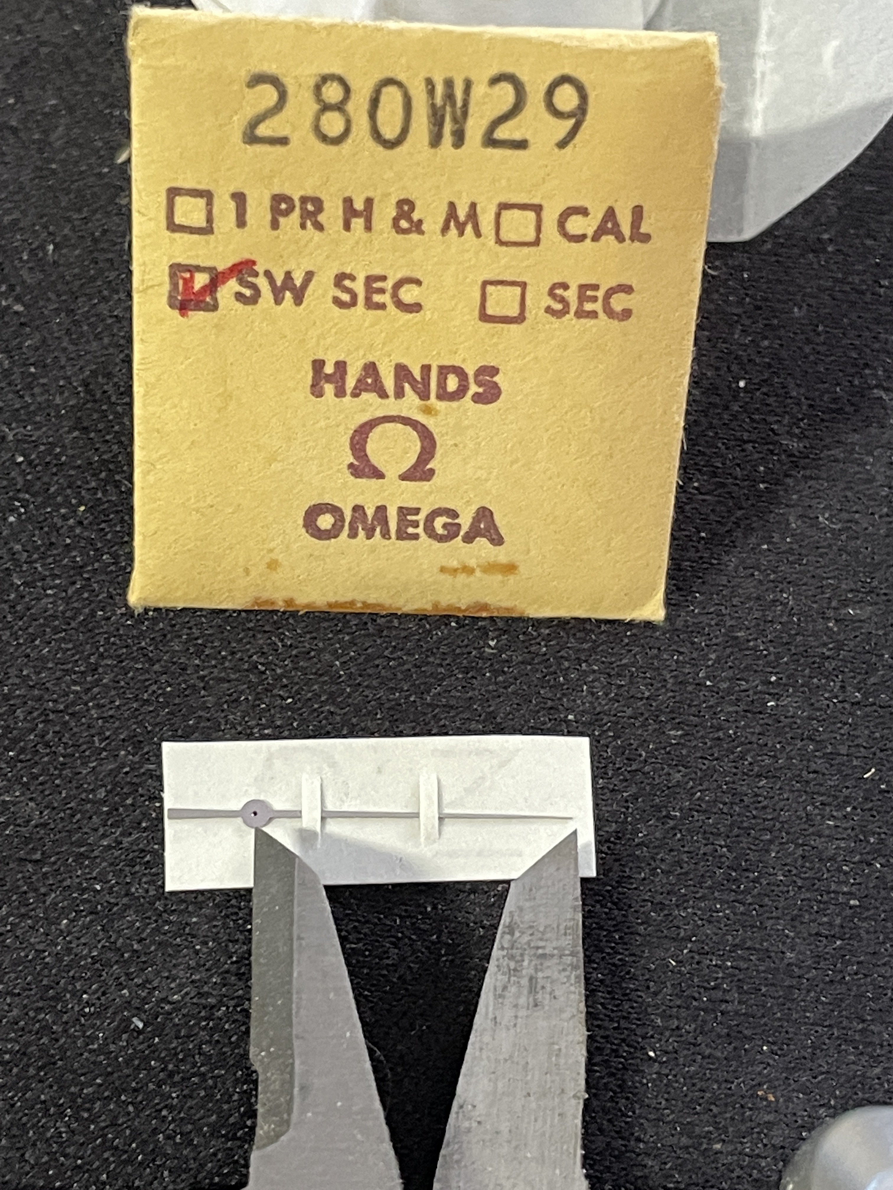 I have an Omega "second hand" it is unpainted, it is in its original packet marked 280W29, it is 14.5mm from the centre to the end of the hand, the overall length is just shy of 19mm.