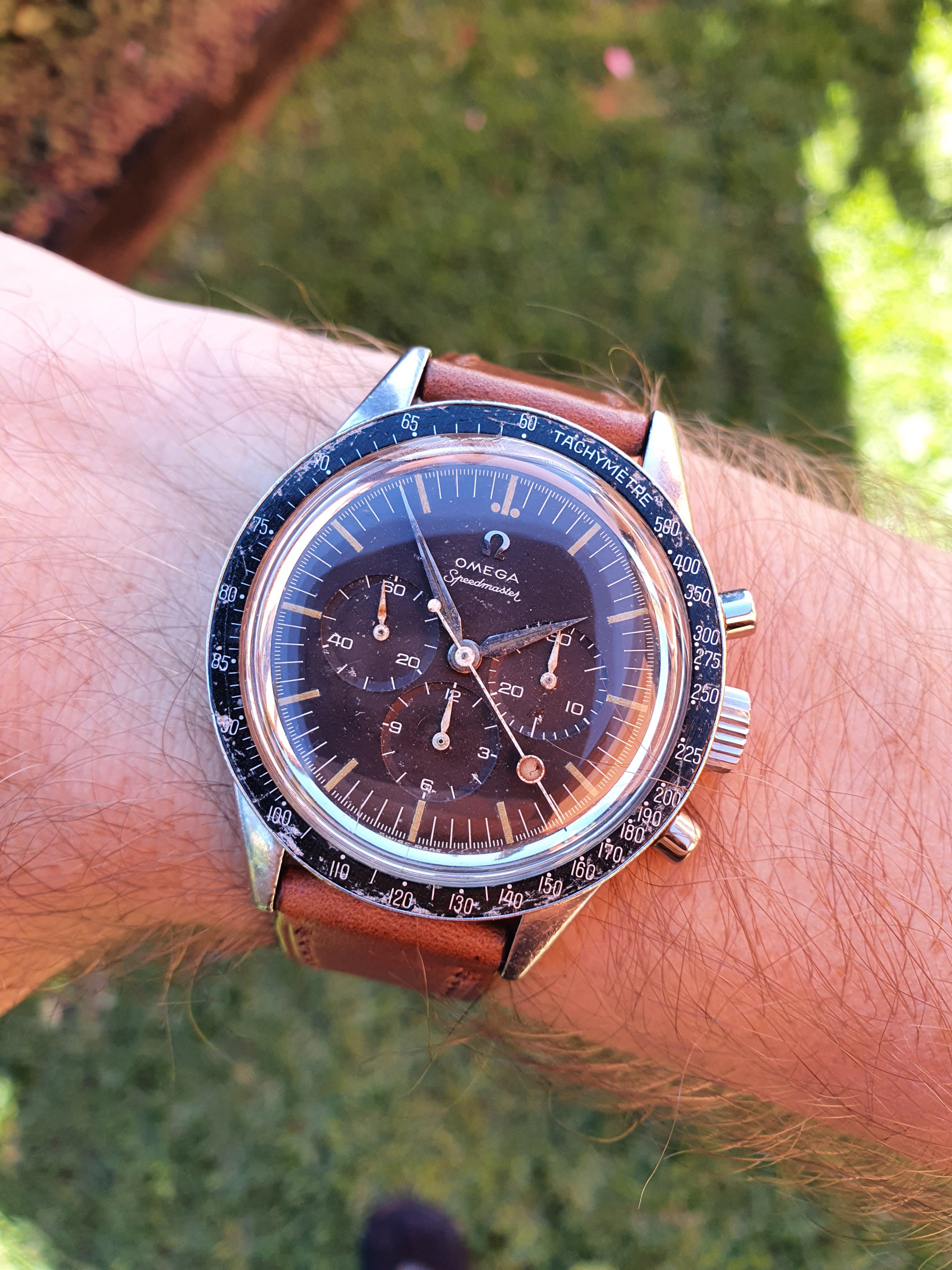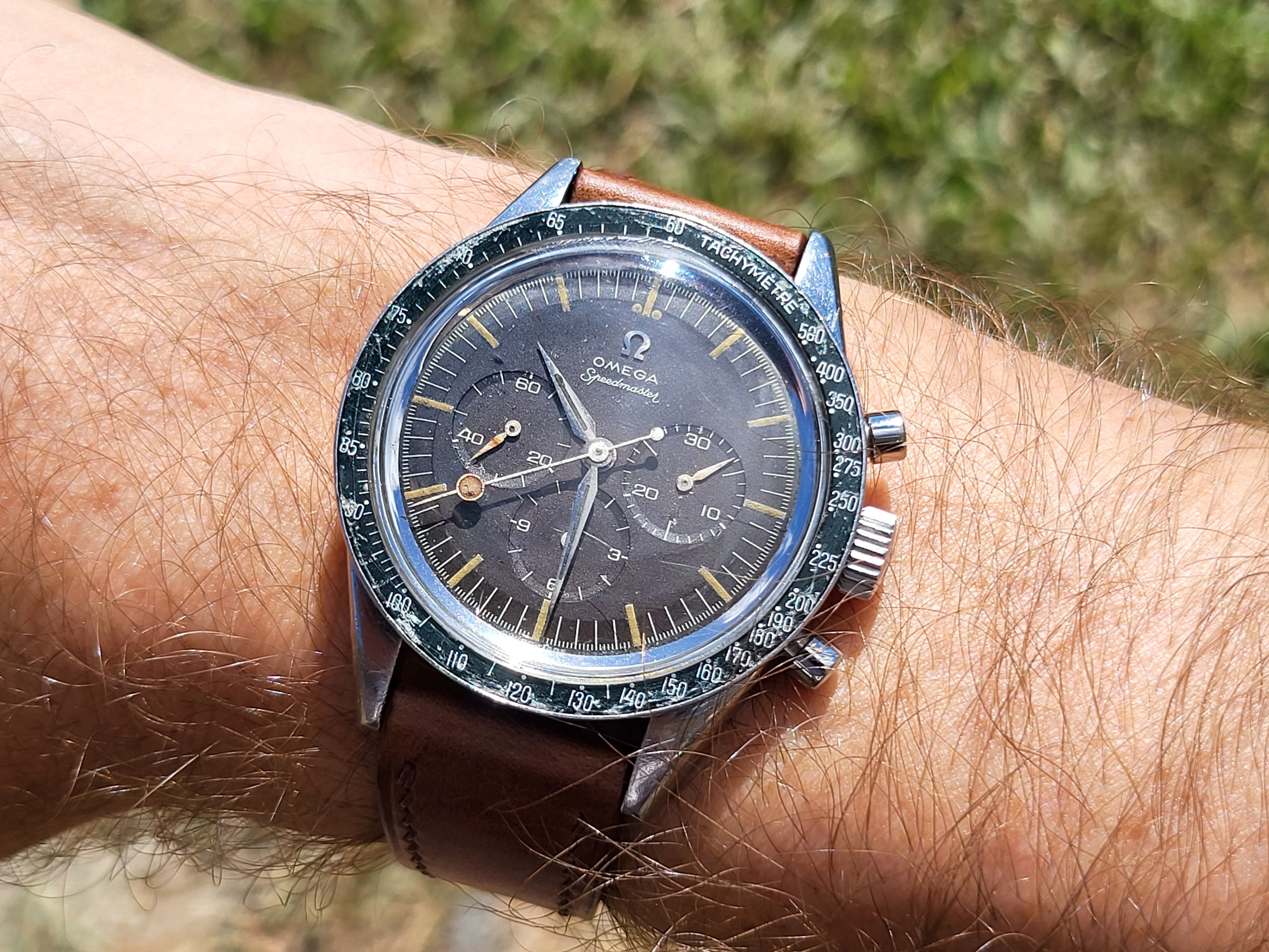 DON bezel in 'ok' condition and has a green hue under certain light. This model should have a Base 1000 bezel according the Speedmaster101/MWO, but the DON looks fine on it as is.