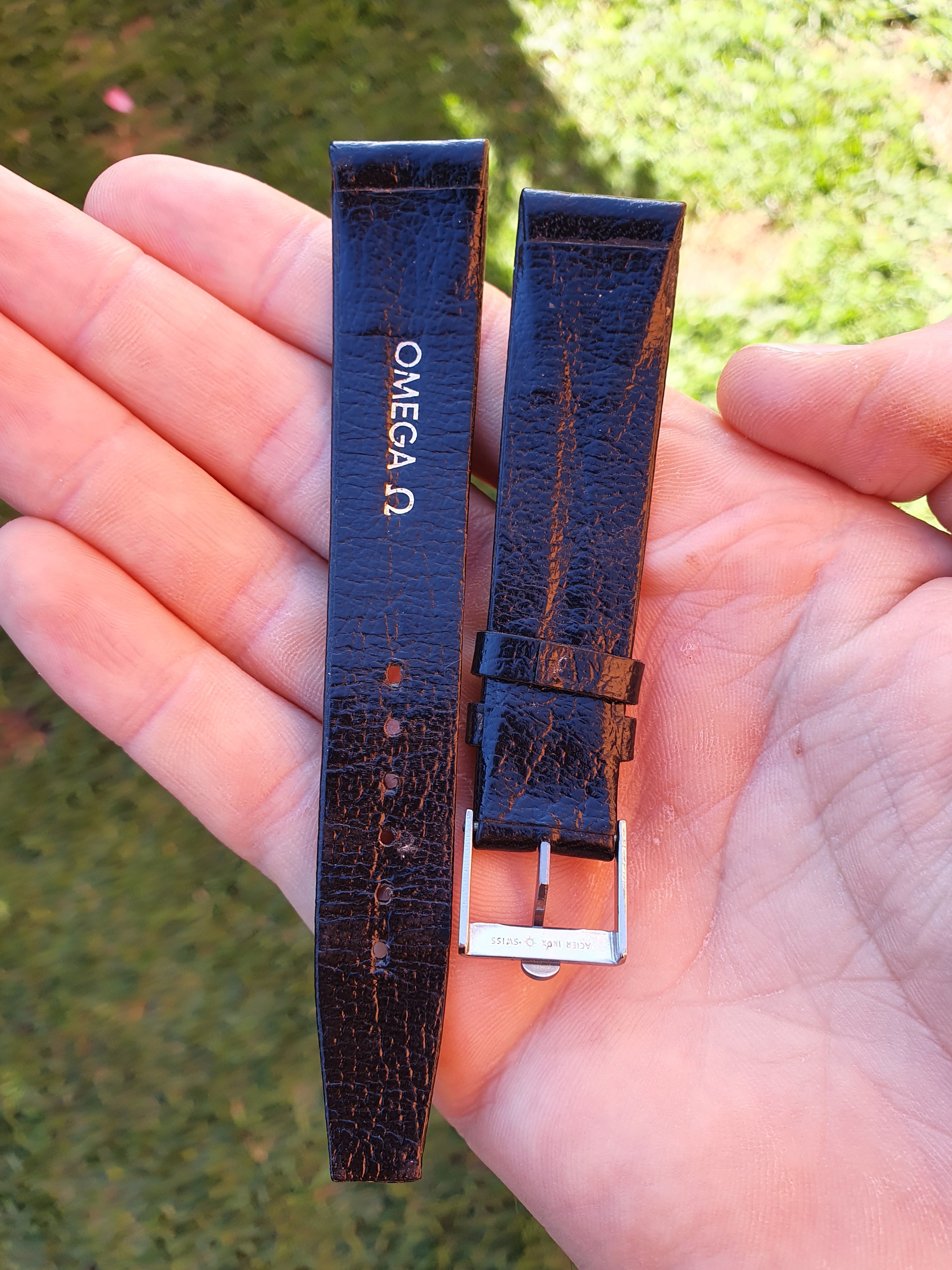 Comes on pictured leather strap + original unworn vintage omega strap