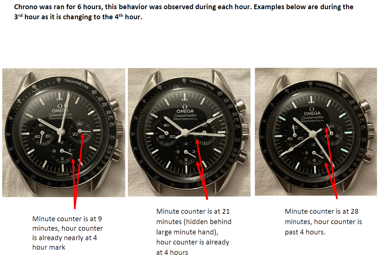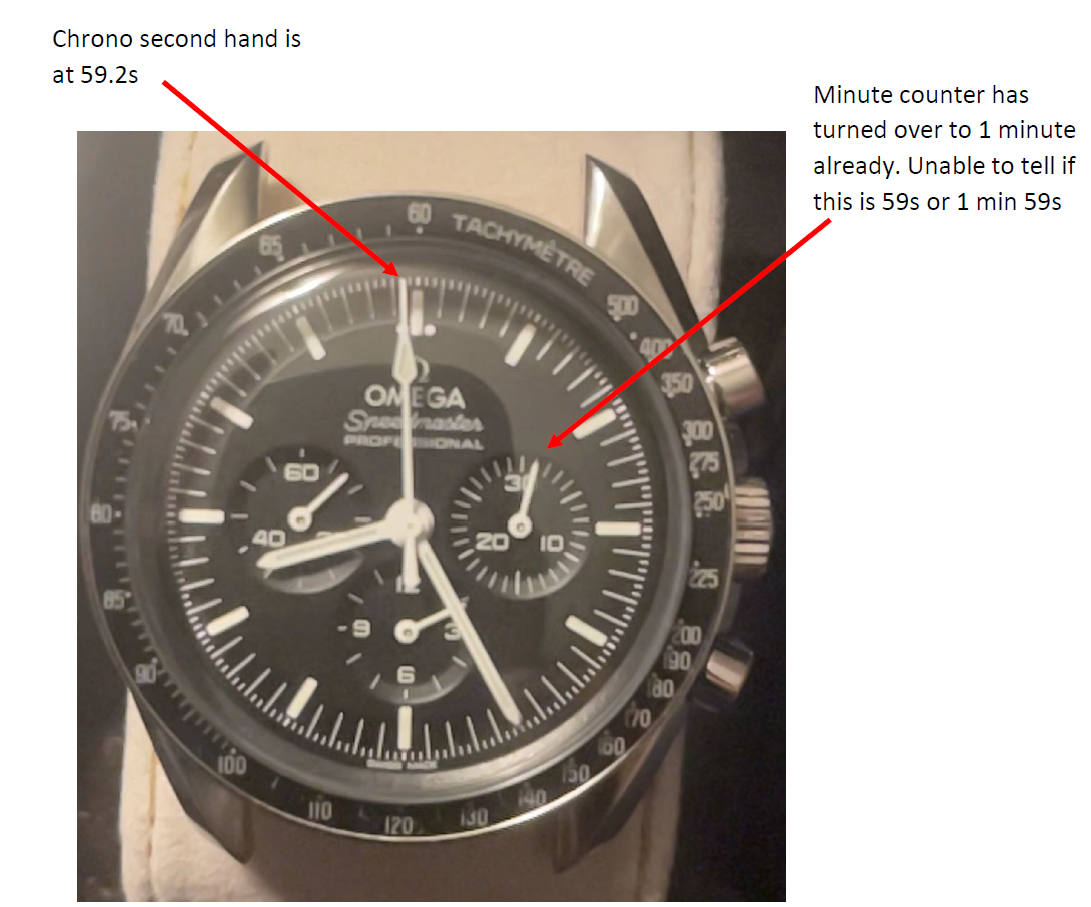 Additionally, my chrono second hand is activating the minute subdial about 0.8s to 1.0s too fast, which I have also seen as a problem before in the forums. When it is reset it is slightly off to the left, so maybe this is contributing too. Pictures of the issue below again: