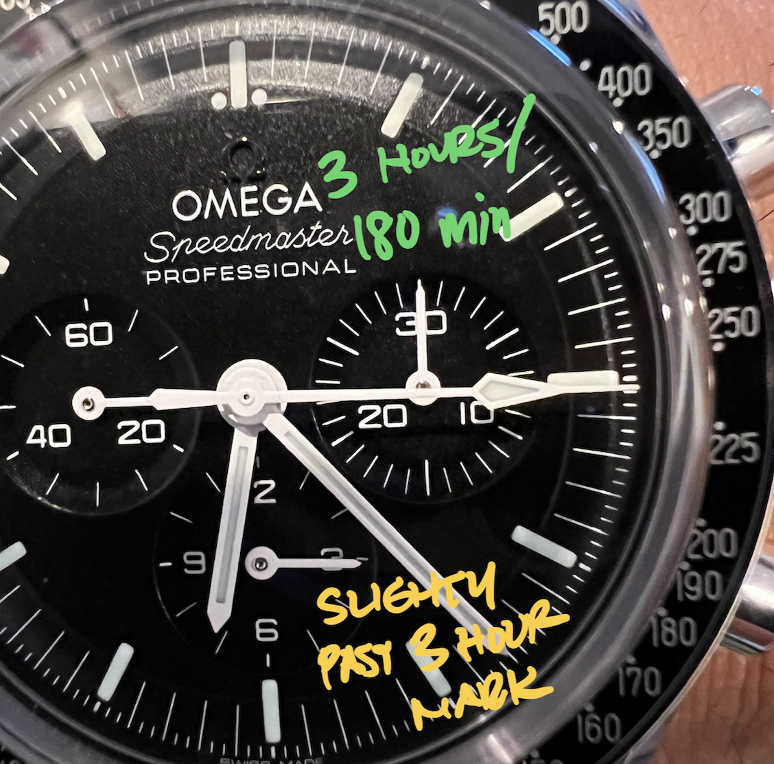 I repeated this for 4 hours and the hands were accurate to their location from the first hour. This is the picture at hour 3. The picture angle and lens distortion makes the hour hand look a little more severe but it was very close to the 3 hour marker.