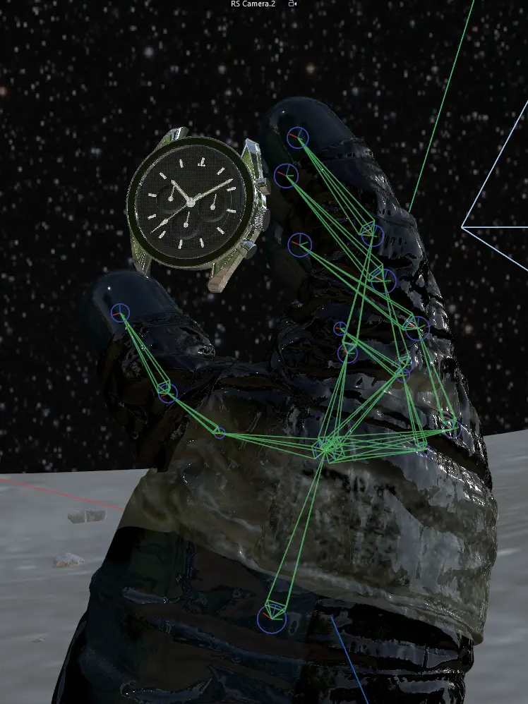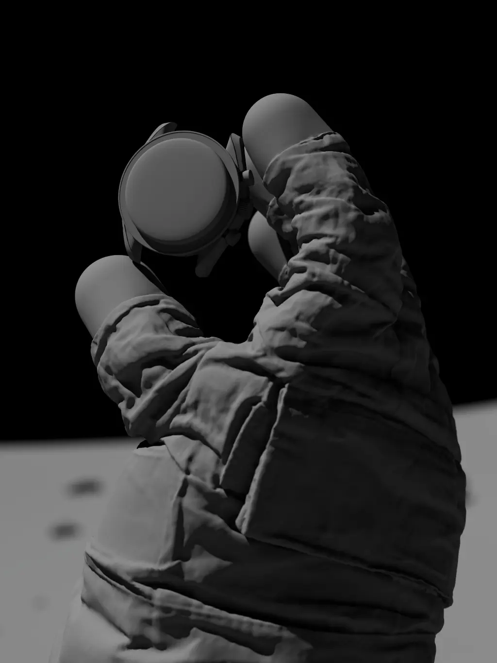 While searching for a suitable 3D glove model for the Comp, I came across an amazing scan of Neil Armstrong’s glove in the Smithsonian archive. I added a bone structure to the model so I could move the fingers and pose it as needed. After previsualizing the composition with a 3D Speedmaster to dial in the angle and perspective, I matched the positioning with my physical 145.012 in-camera.