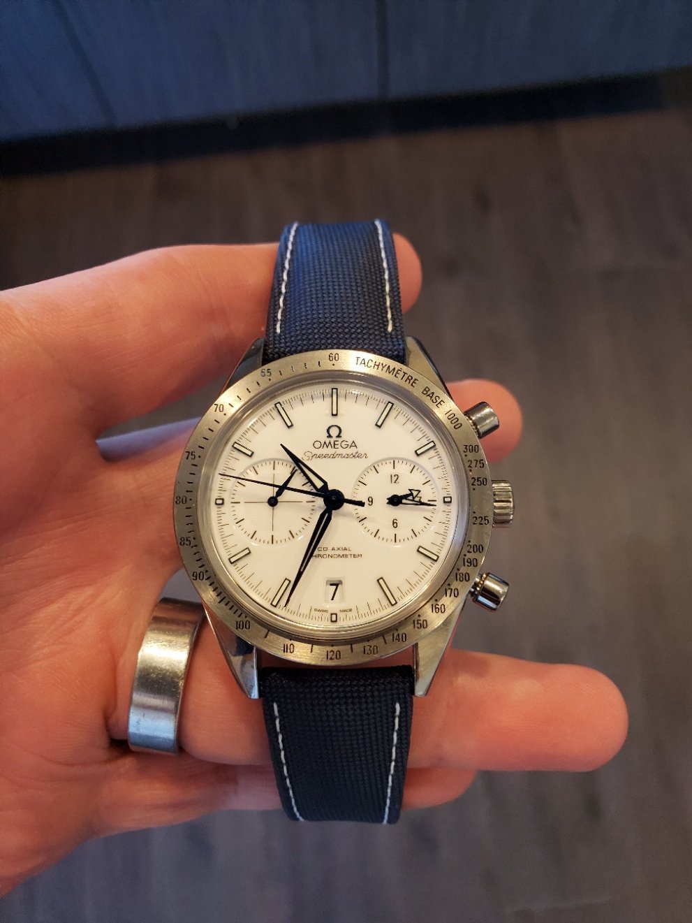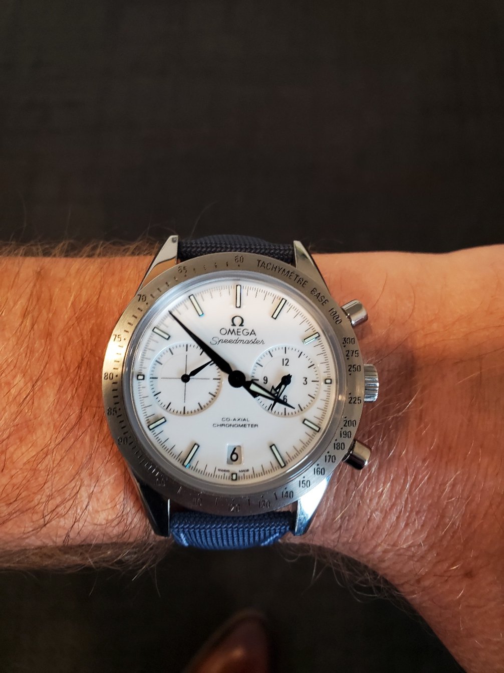 ·I am loving the Silver Snoopy (deployant) strap I just put on my Titanium Speedmaster 57. It was custom made by Jean Rousseau for an Omega deployant clasp, but is essentially the same strap found on the Silver Snoopy. It brings out the blue accents on the hands and hour markers on the Speedmaster 57. The white stitching on the strap also compliments the white dial. Overall, I would say the sailcloth material of this strap gives this watch a great casual summery vibe. It's got me looking forward to summer already. Omega, you need to offer this strap as on option on this watch. You can thank me later when you start selling more of these. Just wanted to share this look in case anyone was considering this watch or strap. I would recommend both.