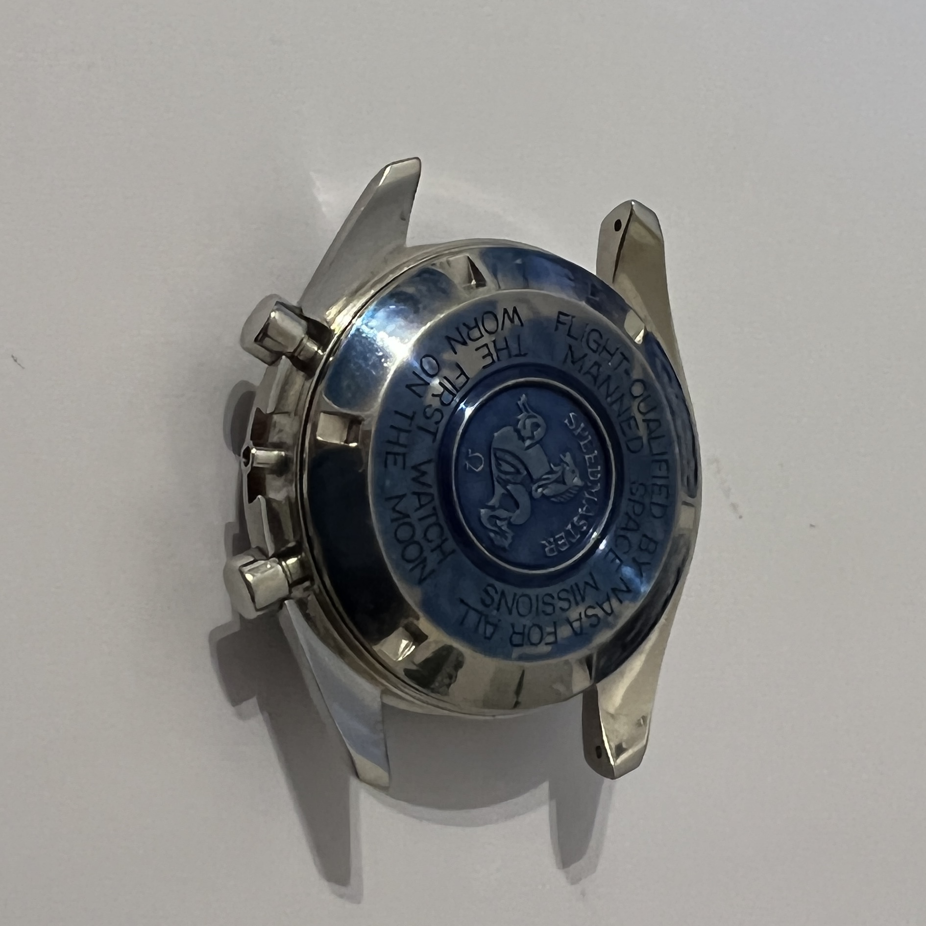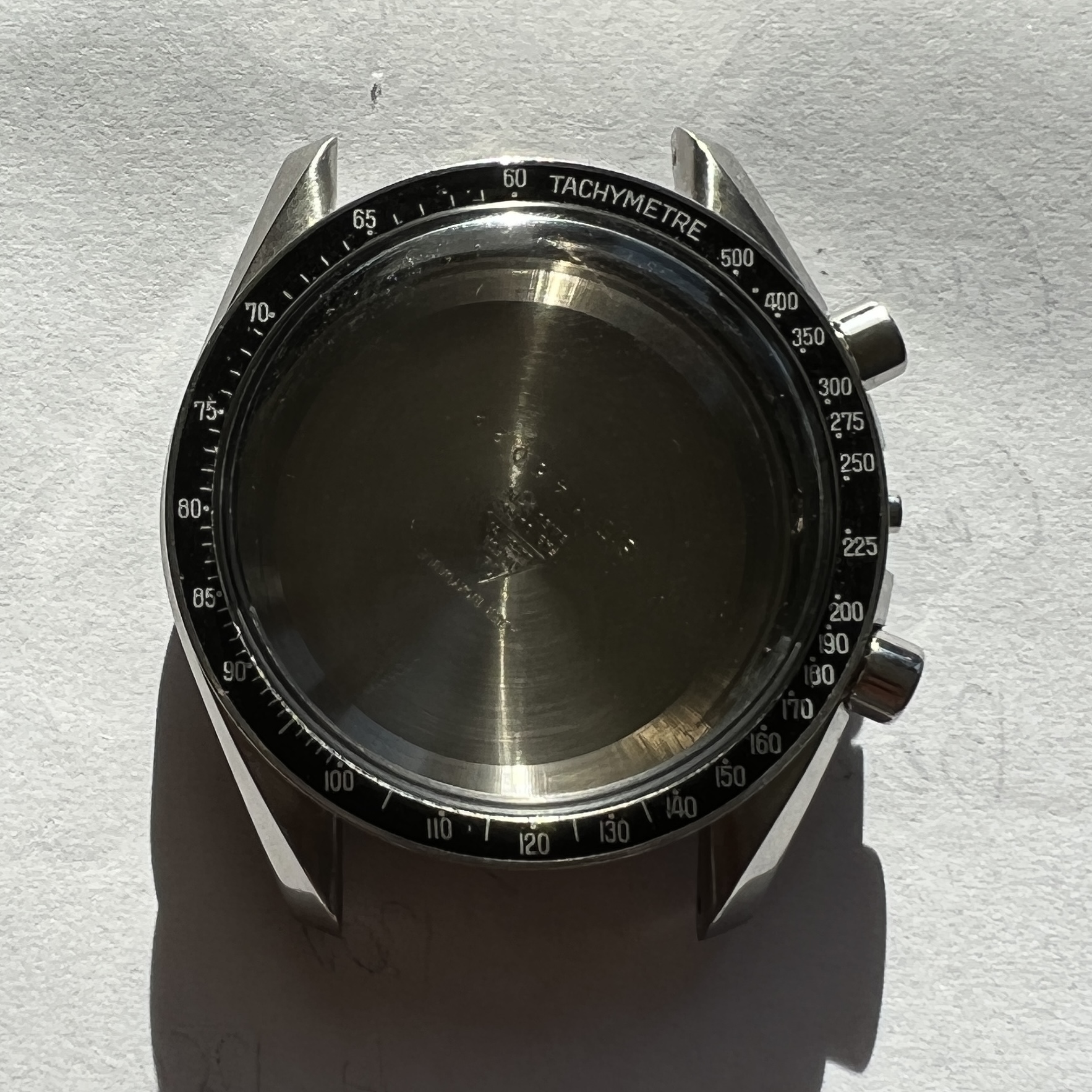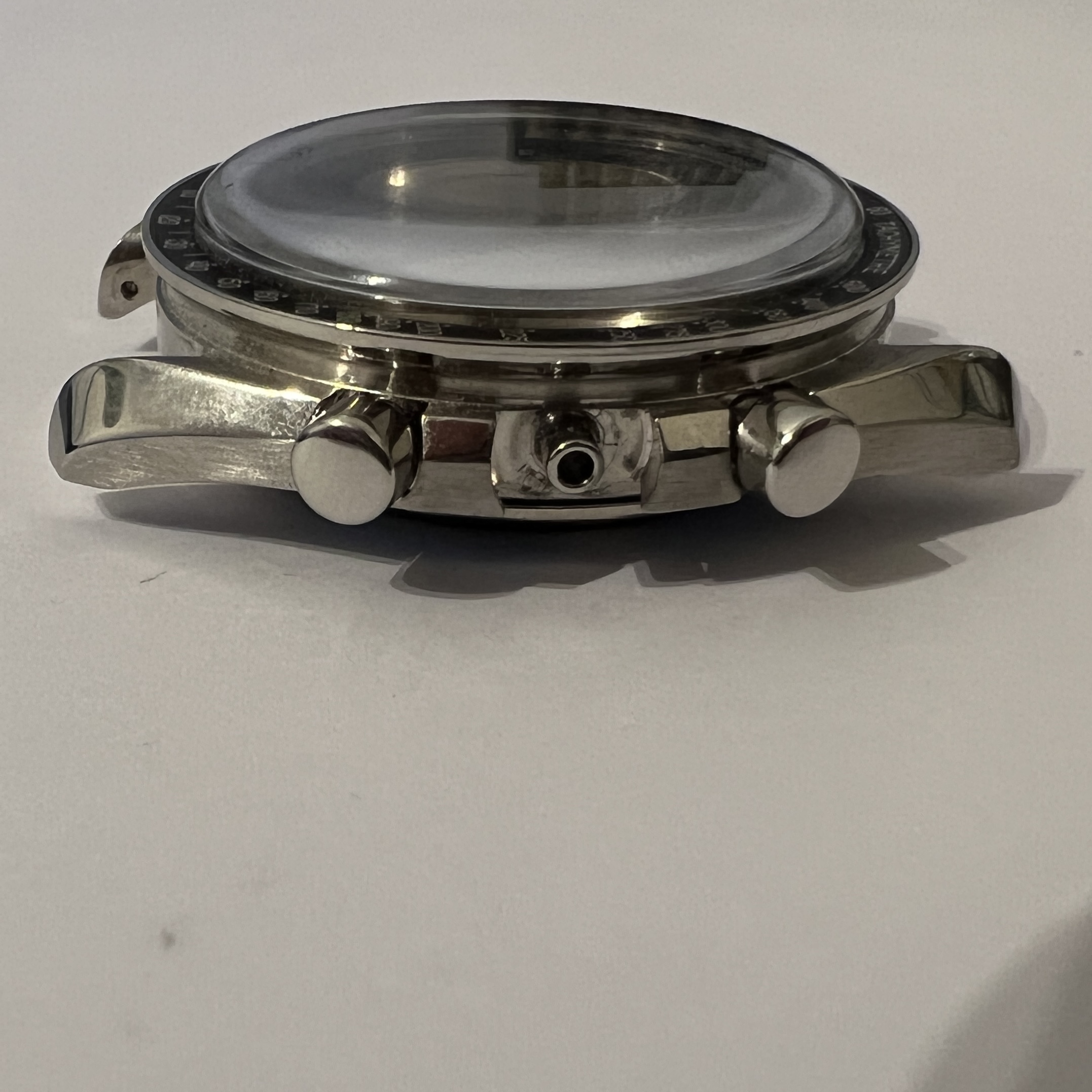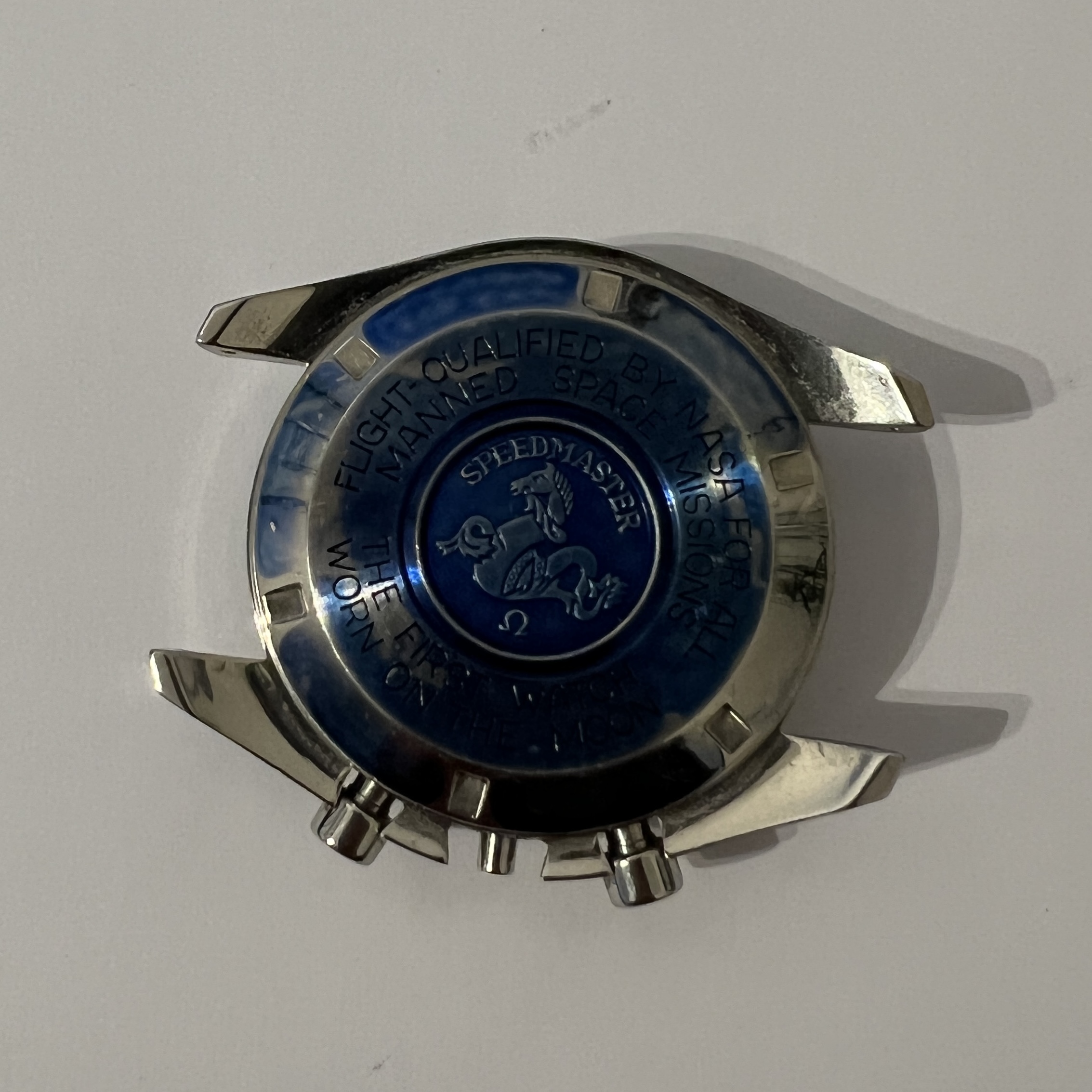 Case / Midcase: Nice fat case, coming from an '84 Speedmaster (44-serial) I've bought earlier this year. It is one of the less common ADB-cases as opposed to the more common CRS ones. The watch it came with had recently been serviced and pushers and plexi had been replaced with genuine Omega parts. So far for the good news. Unfortunately, it has also been polished and pretty seriously so on the lower lugs, particularly the lower right one, which is visibly thinner than it should be. Could certainly make for a perfect case of a beater watch, but isn't collector grade! Still, someone less pedantic than myself will certainly get a lot of enjoyment out of it. 😁