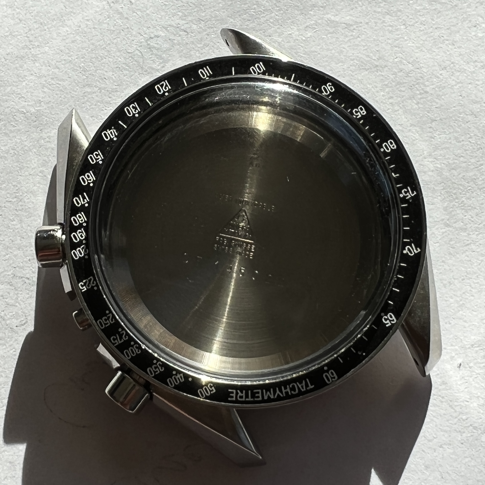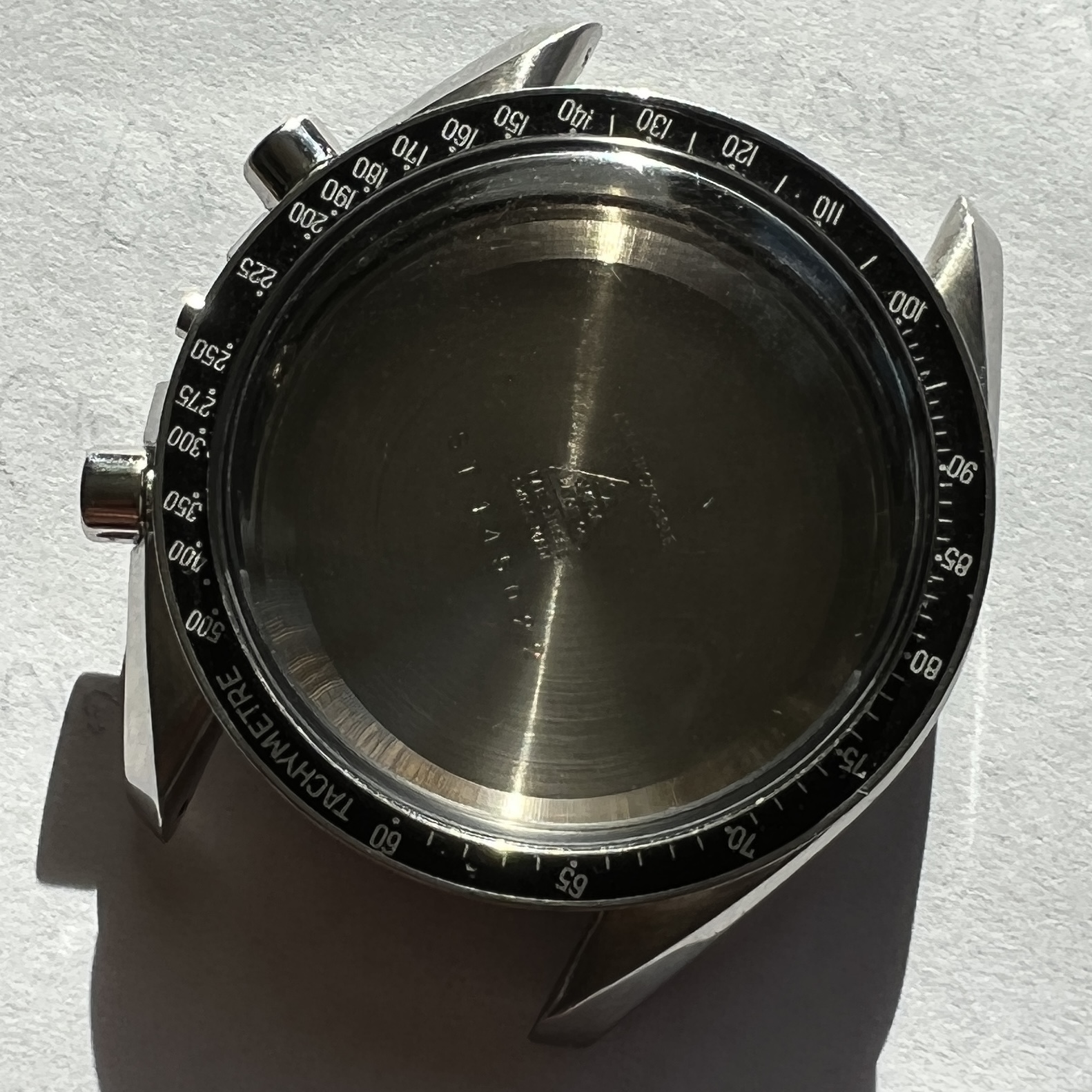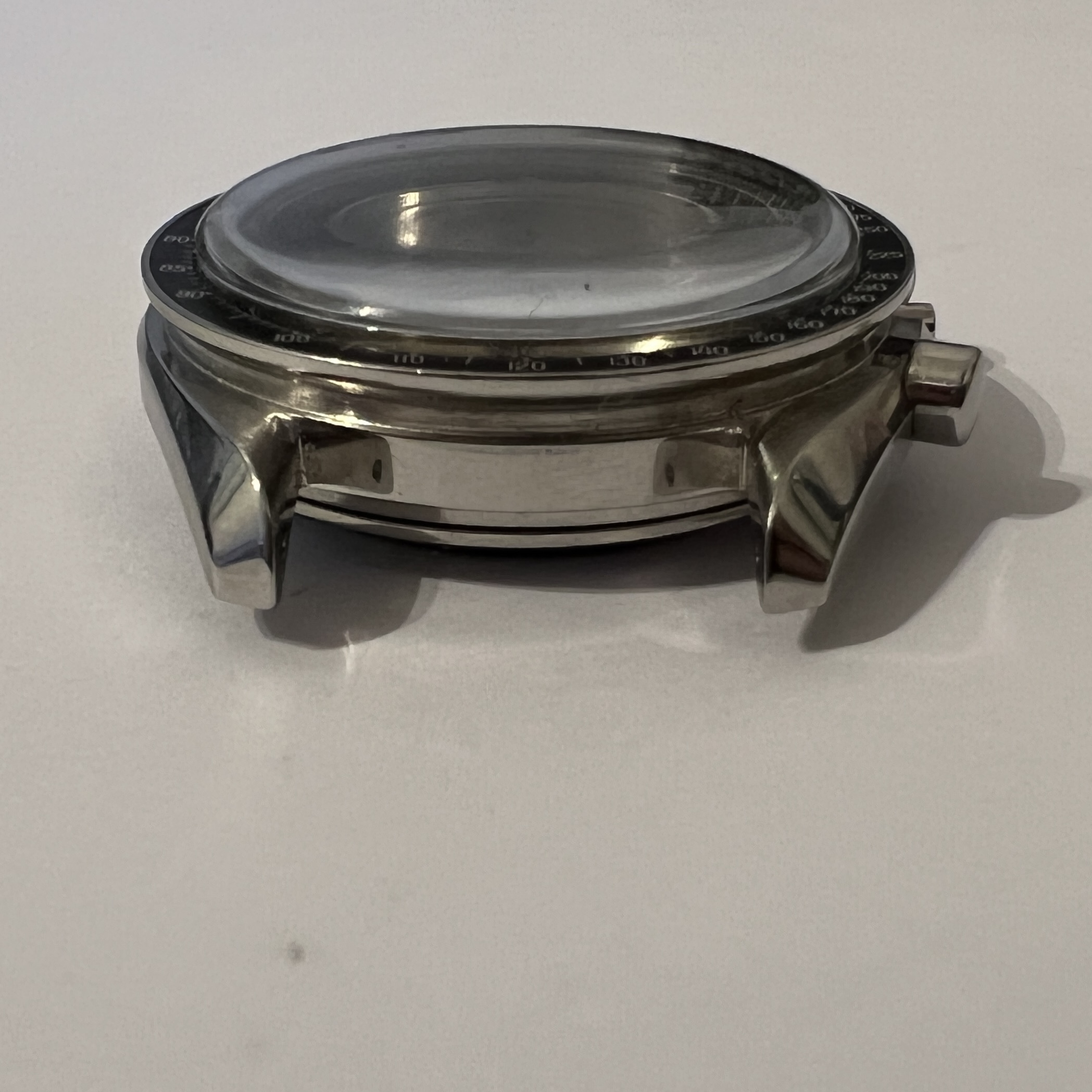 Case / Midcase: Nice fat case, coming from an '84 Speedmaster (44-serial) I've bought earlier this year. It is one of the less common ADB-cases as opposed to the more common CRS ones. The watch it came with had recently been serviced and pushers and plexi had been replaced with genuine Omega parts. So far for the good news. Unfortunately, it has also been polished and pretty seriously so on the lower lugs, particularly the lower right one, which is visibly thinner than it should be. Could certainly make for a perfect case of a beater watch, but isn't collector grade! Still, someone less pedantic than myself will certainly get a lot of enjoyment out of it. 😁