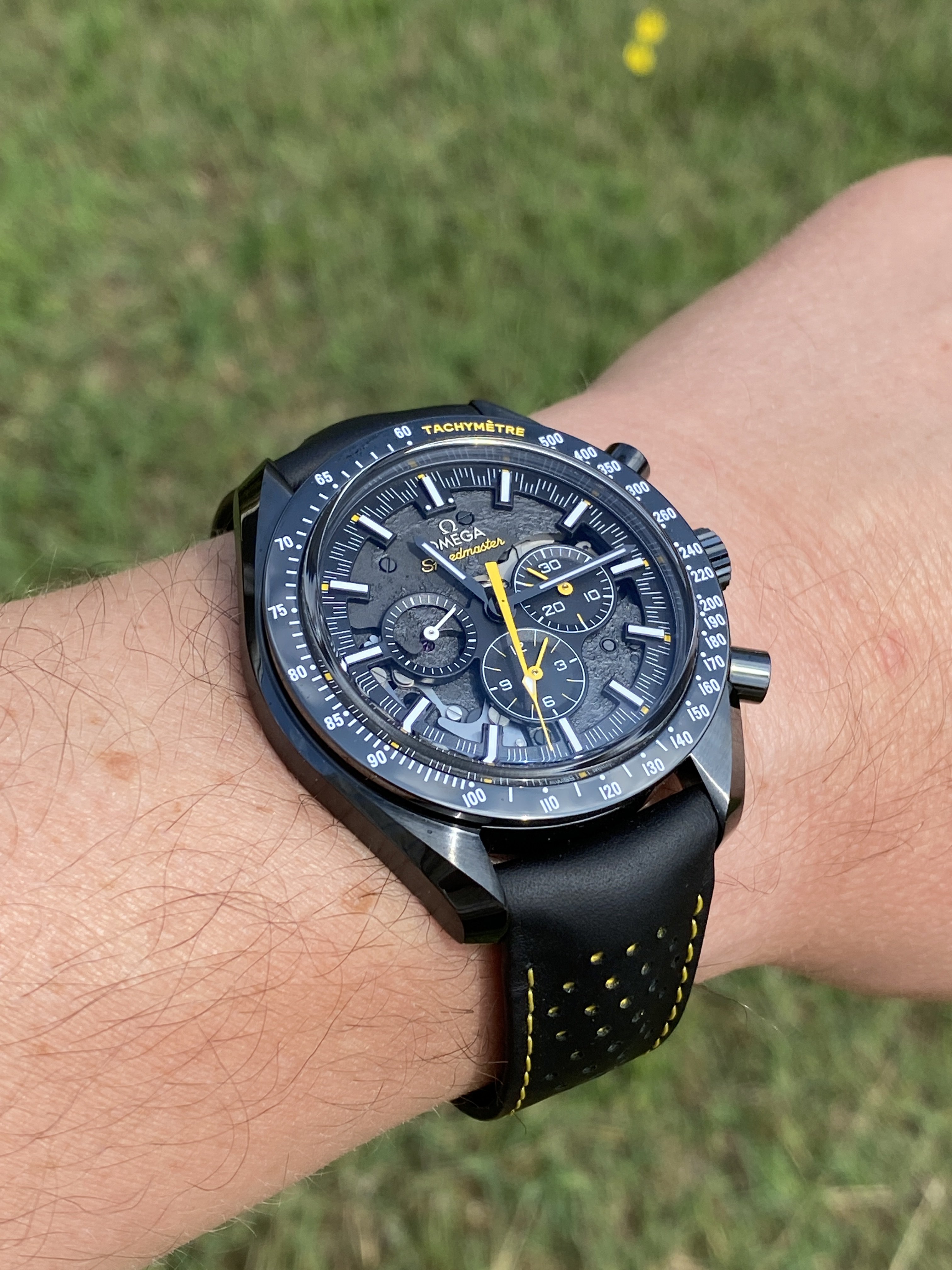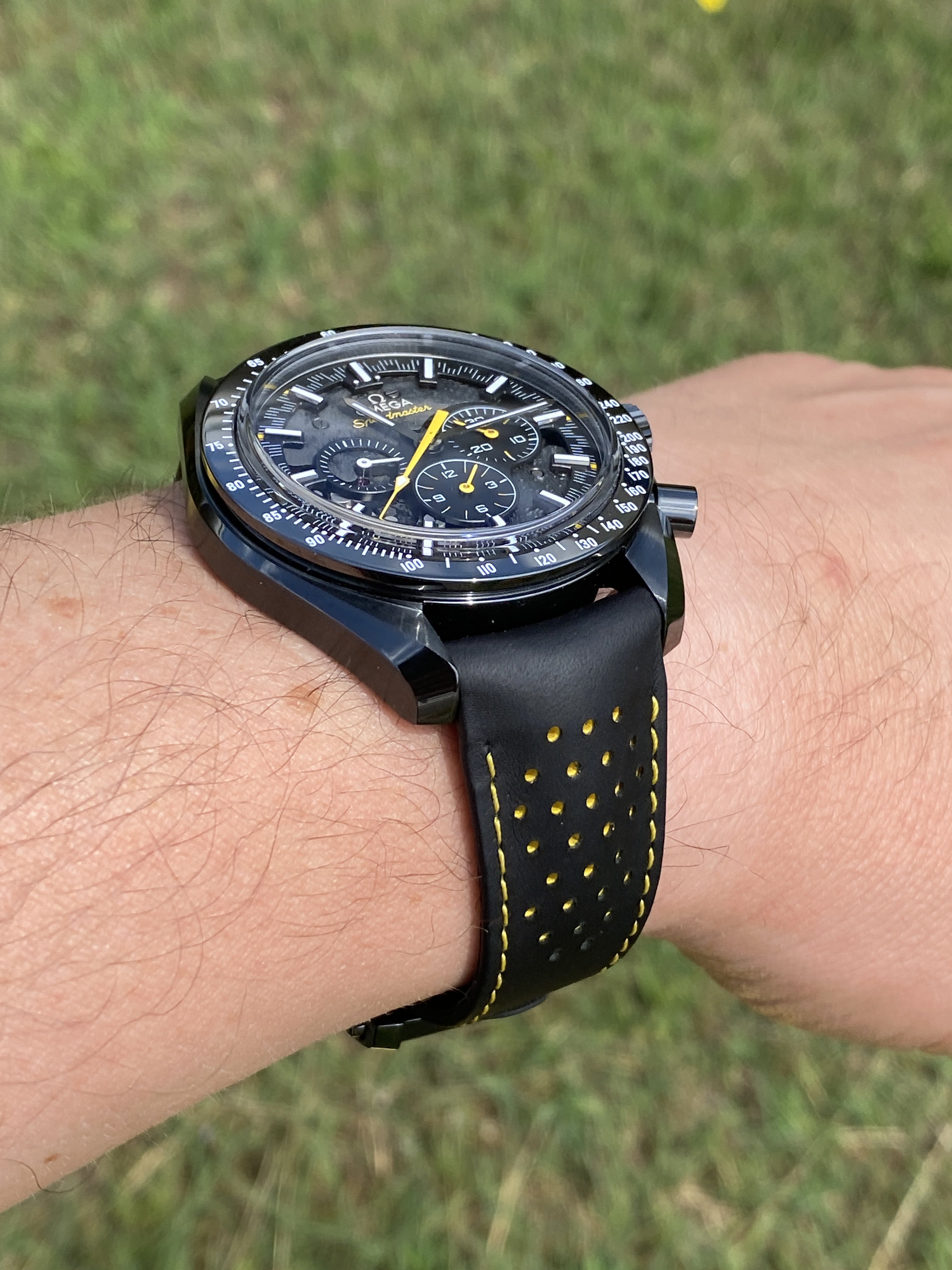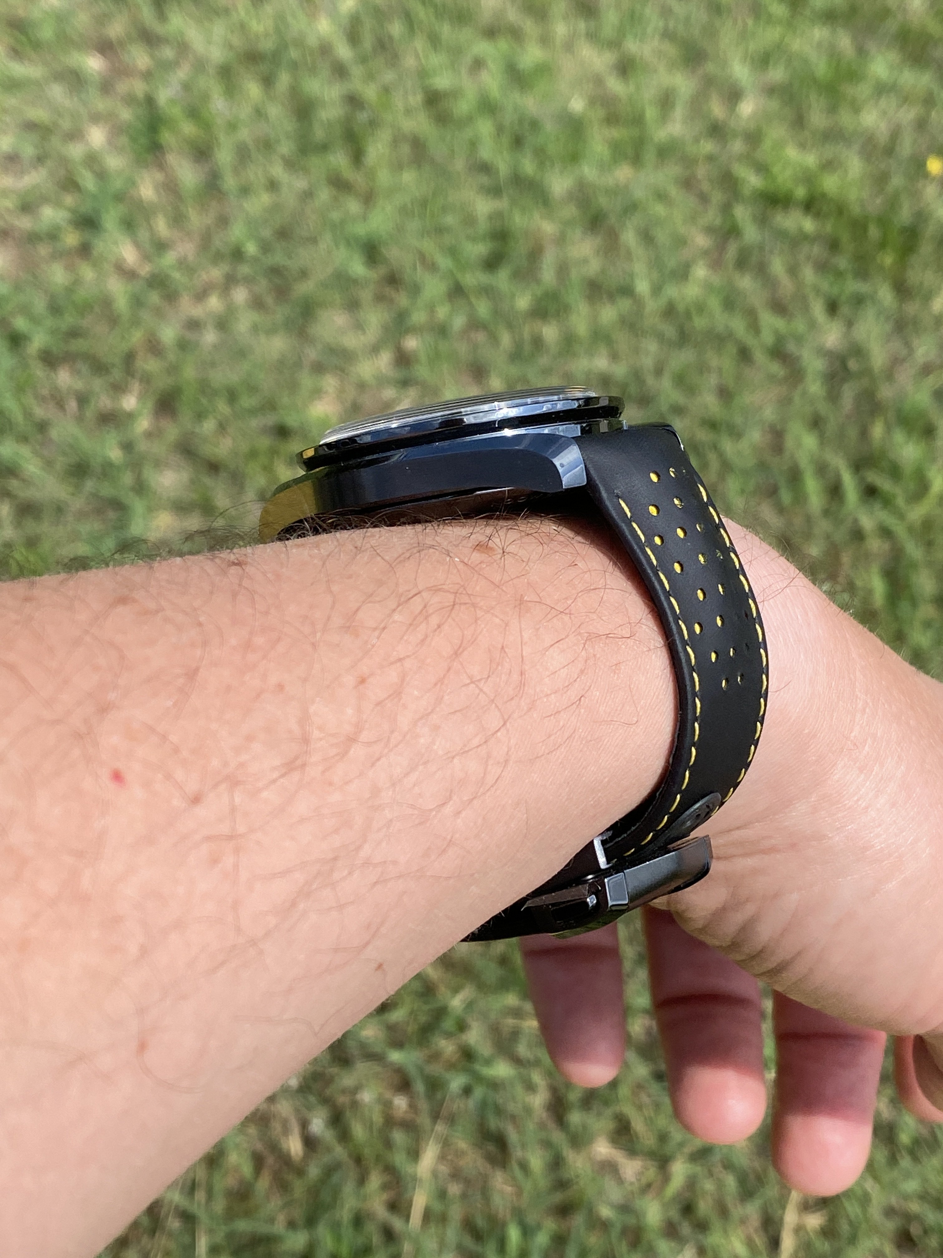 As standard it comes on a black racing strap with yellow accents and standard tang-buckle.
