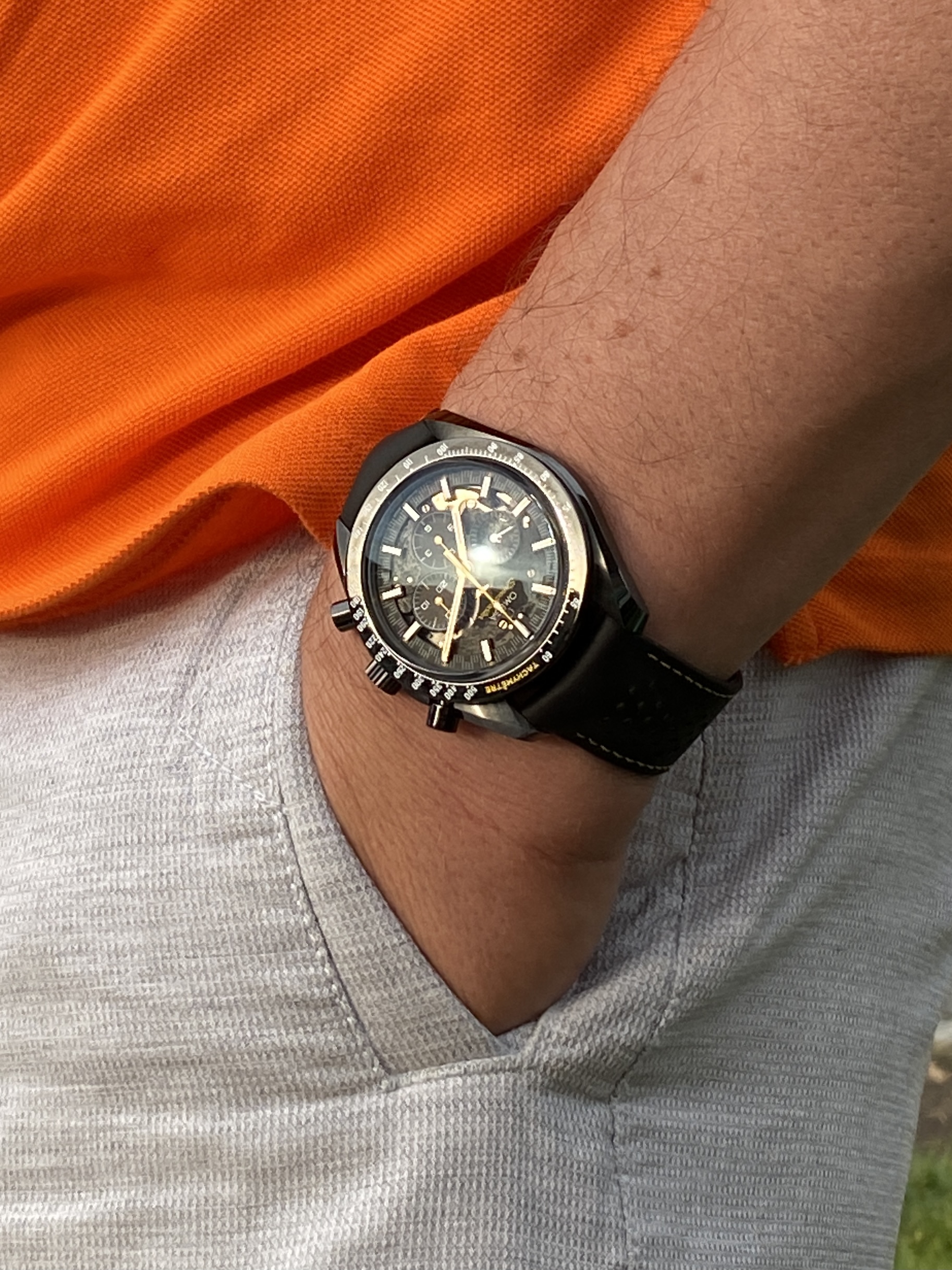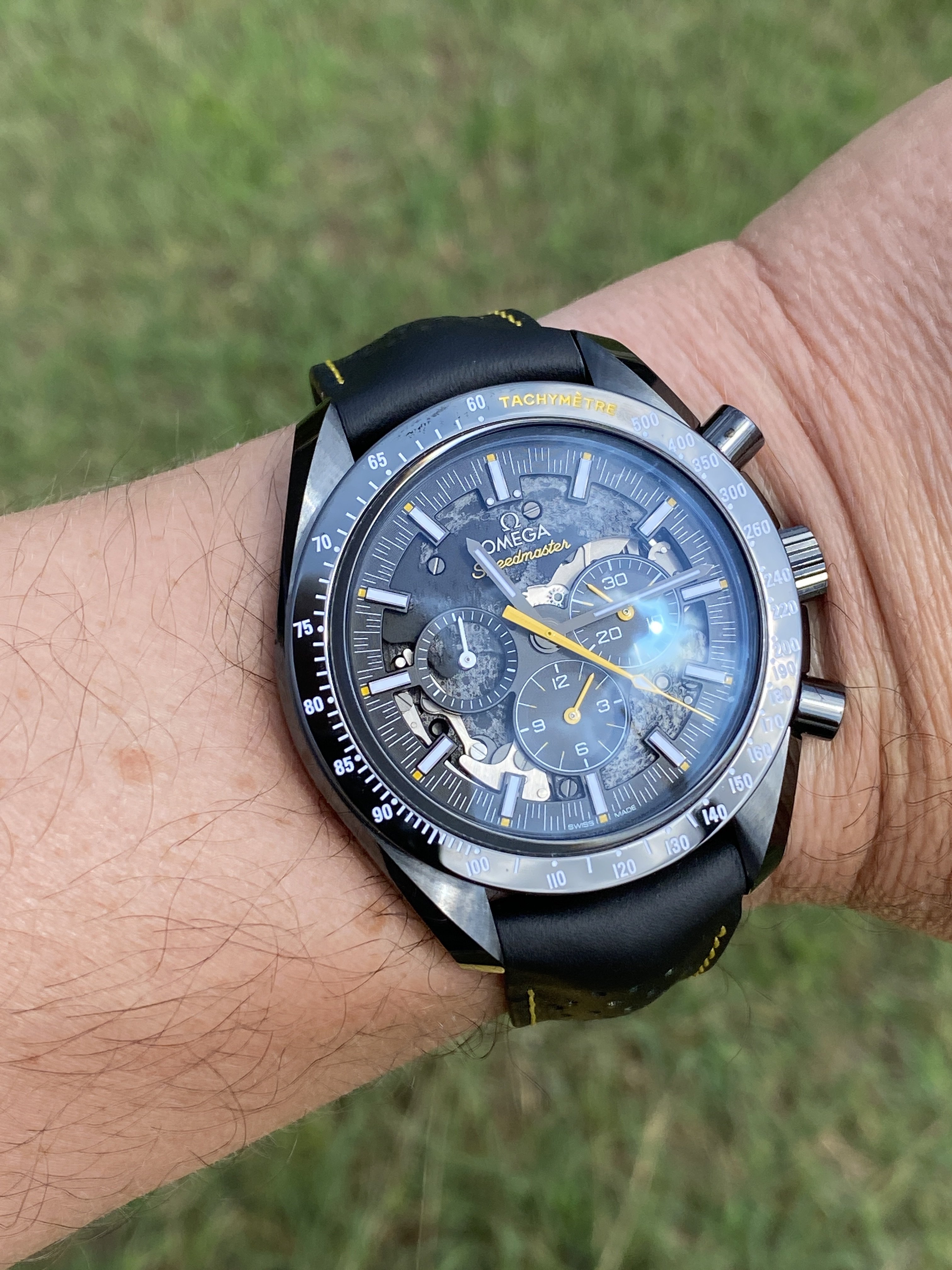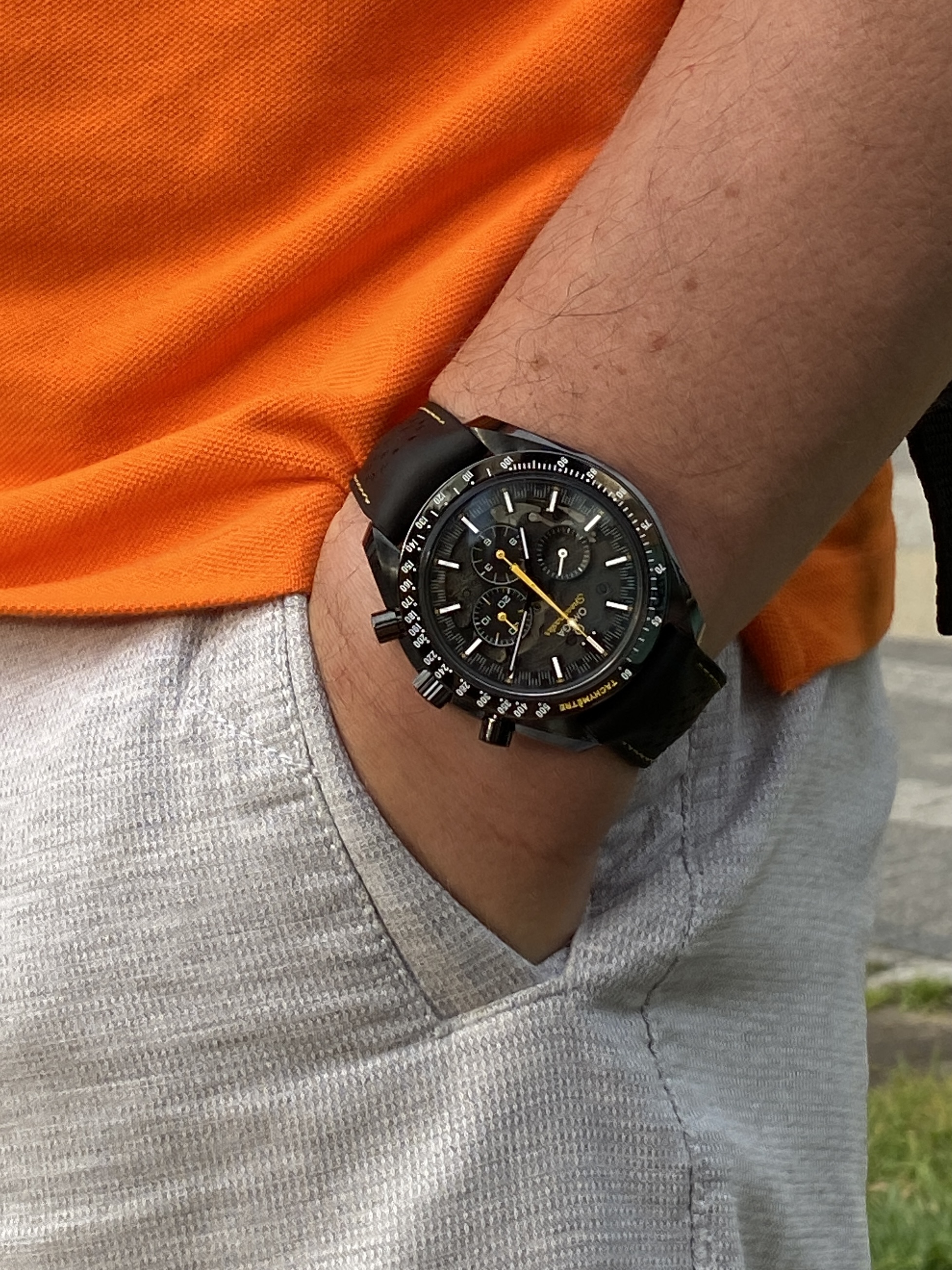 As standard it comes on a black racing strap with yellow accents and standard tang-buckle.