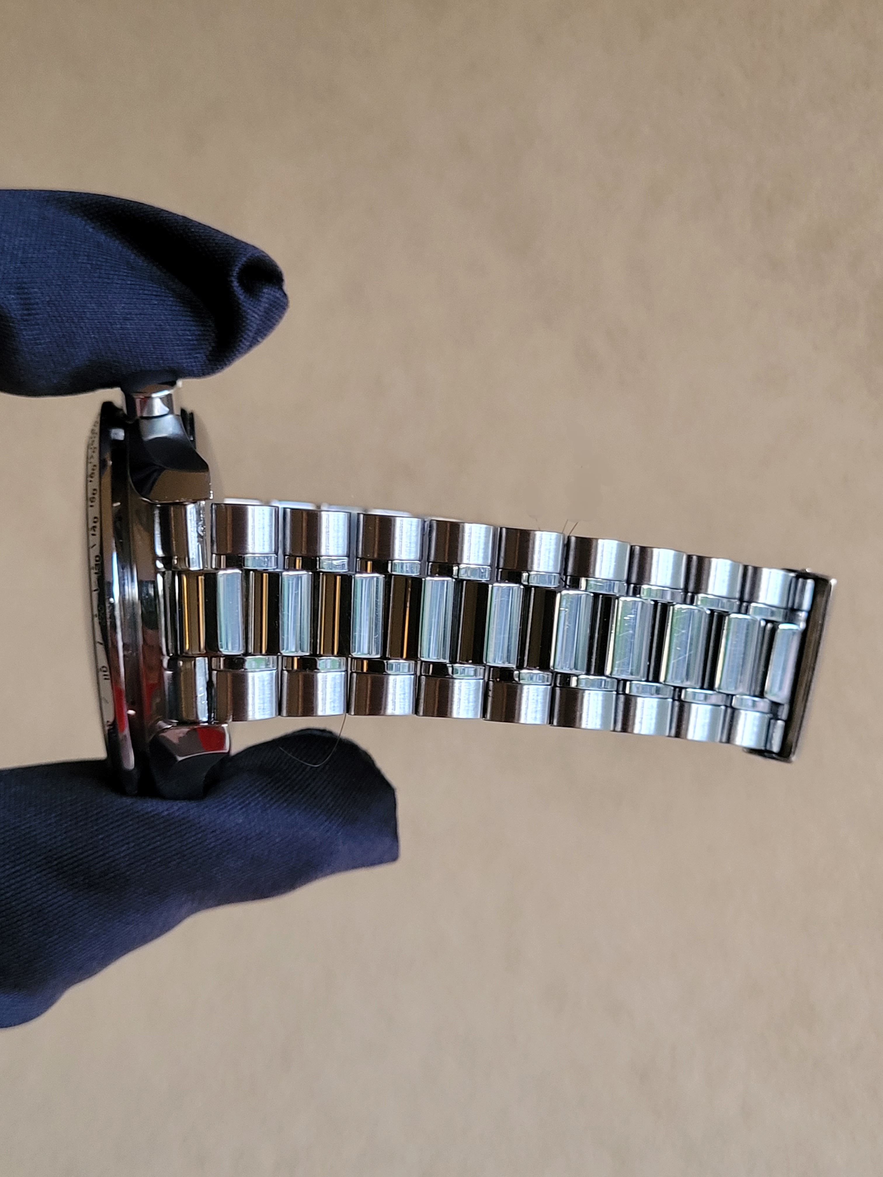 Aesthetic Condition: No major scratches or gouges to note. The hour markers on the dial have developed a beautiful patina. The tritium in the hands and on the dial, illuminates the same under UV light. The case is in very nice condition for it’s age with very sharp lines as the surface transitions from brushed to high polished finish. No significant dings or dents in the case, just some faint hairlines on the high polished surfaces (consistent with a 25+ year old watch). The bracelet is in very nice condition as well, no major scratches on the links or clasp; very little sag when held horizontally.