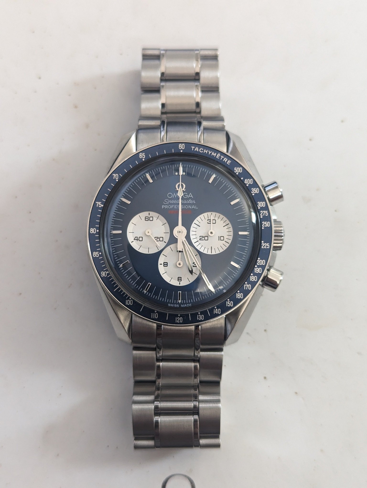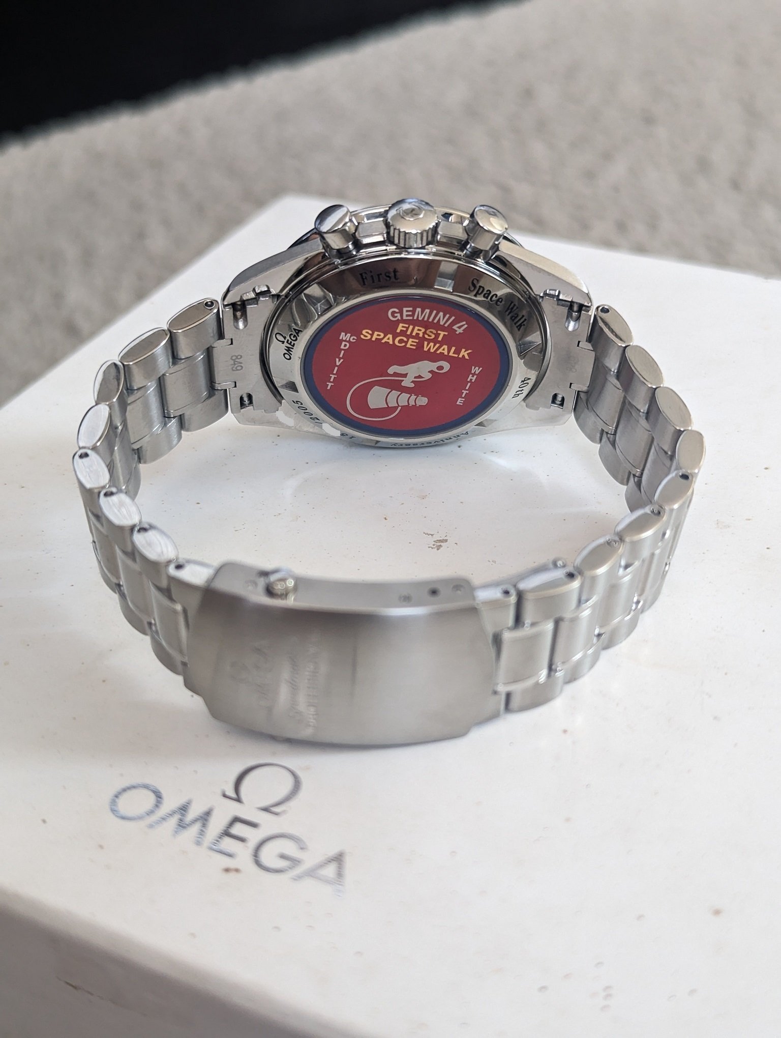 ·Beautiful blue dial with white subdial Gemini IV 40th Anniversary Speedmaster watch. This model commemorates the 40th anniversary of astronaut Edward White's successful spacewalk on Gemini 4. Released in 2005, limited to 2005 pieces worldwide.