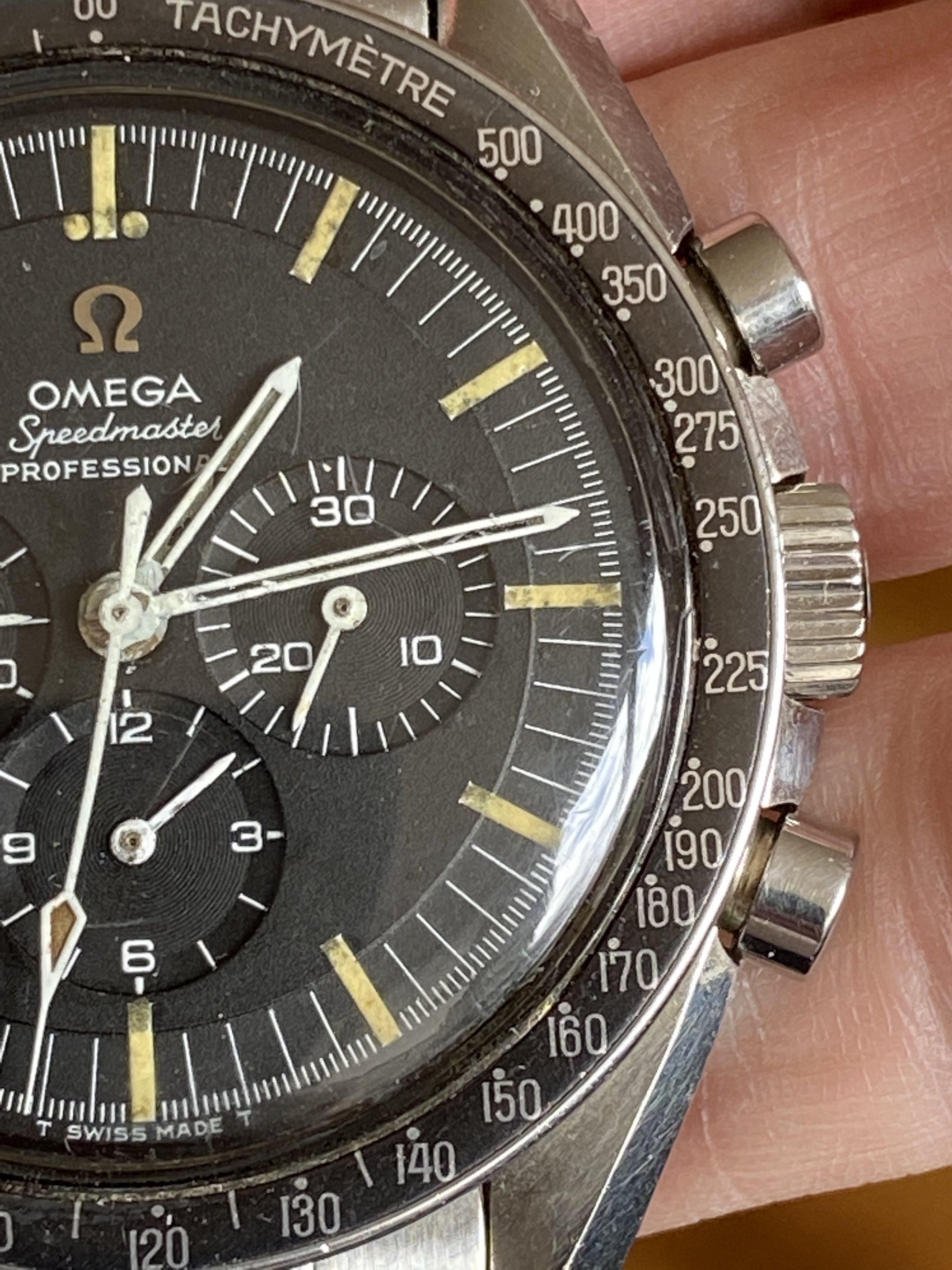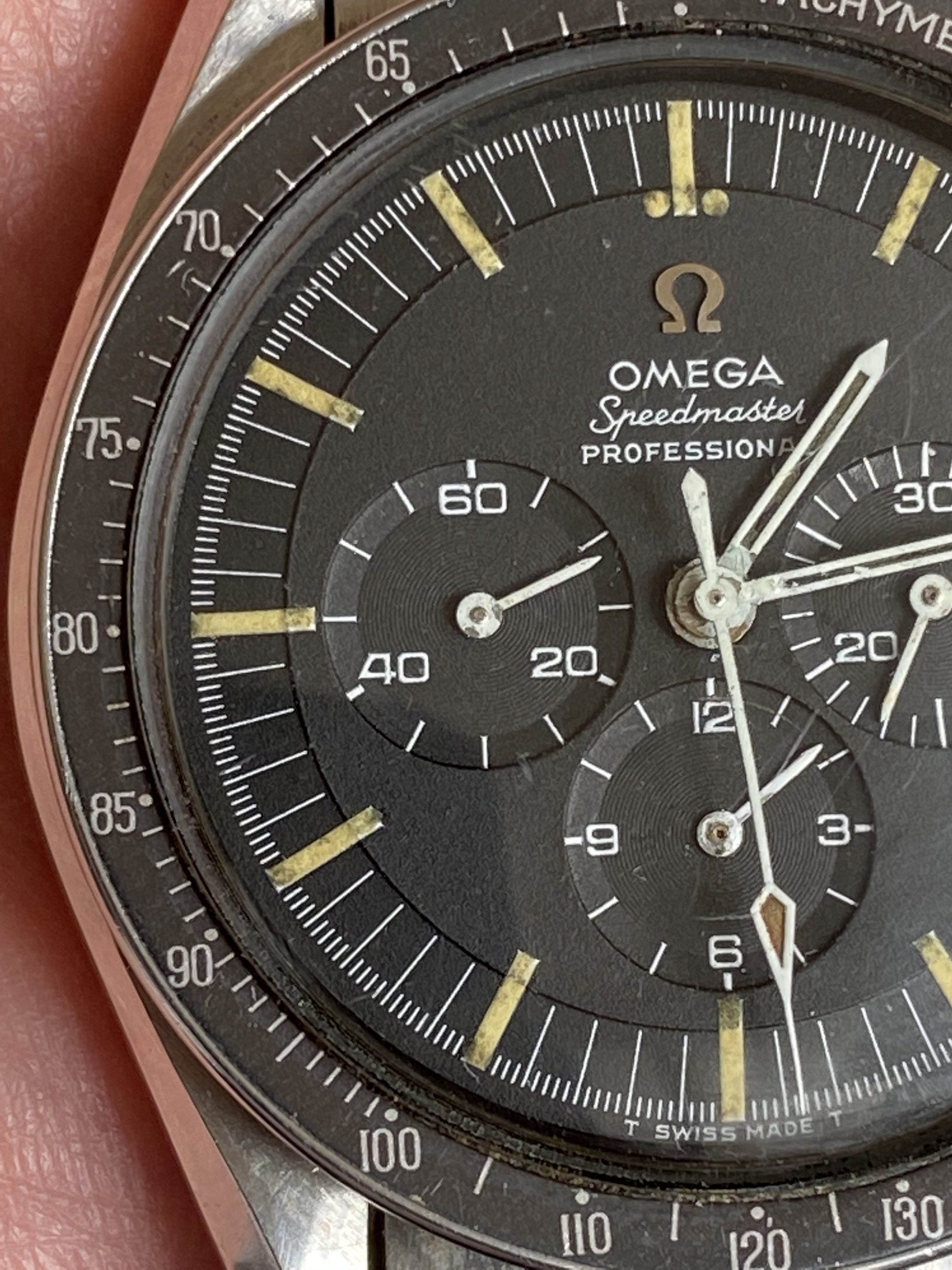 Hands: Correct but battered. Minute hand has lost most of its lume, hour hand some. What’s left matches the chrono second hand.
