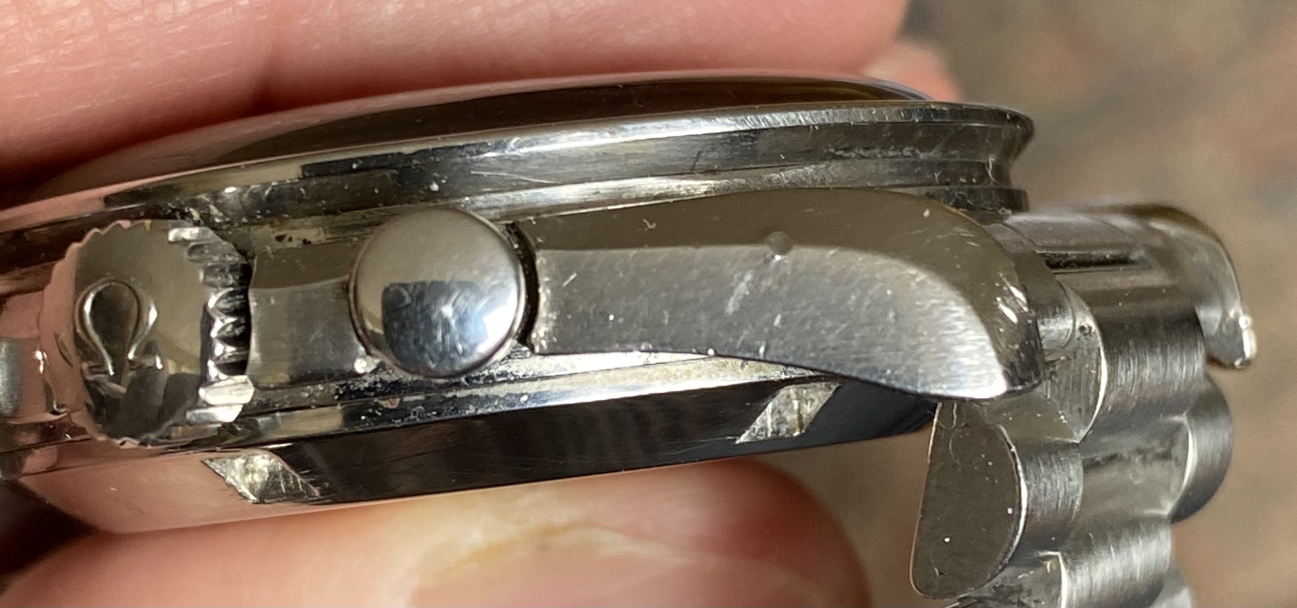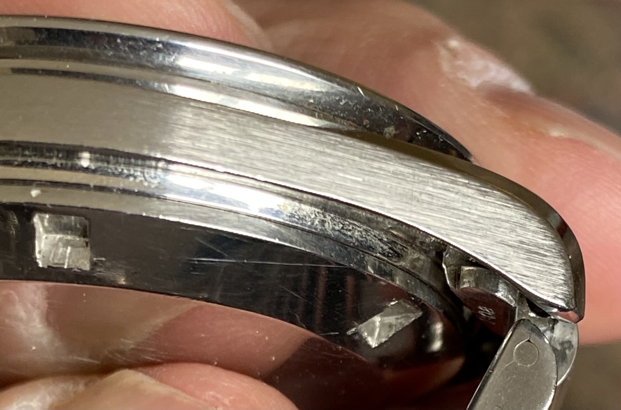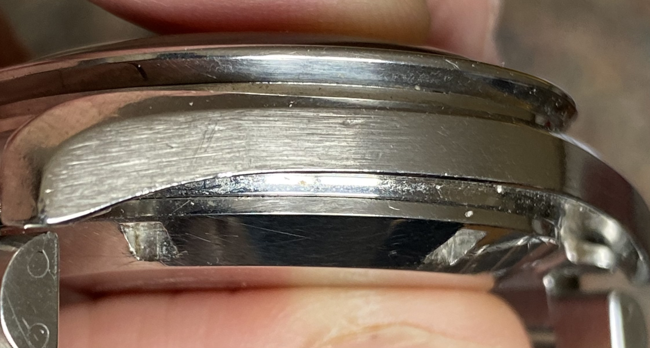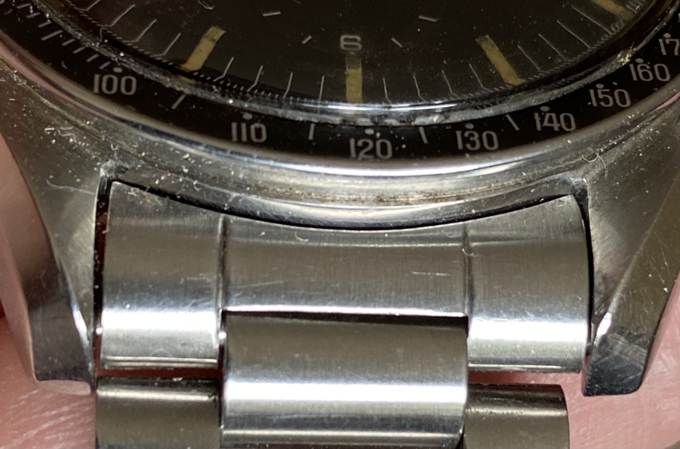 Case: Polished somewhat and worn, but still pretty decent. (To me, that doesn’t look like factory brushing on the sides.) Hippocampus clear, with traces of the factory swirl. One ding, on the edge of the two o’clock lug. Correct pushers and crown.