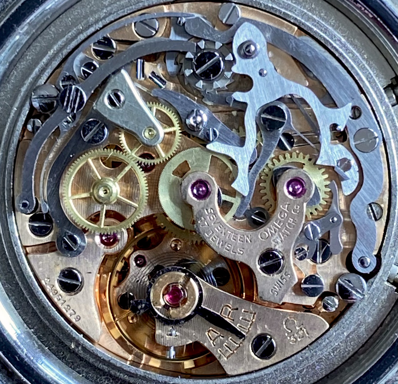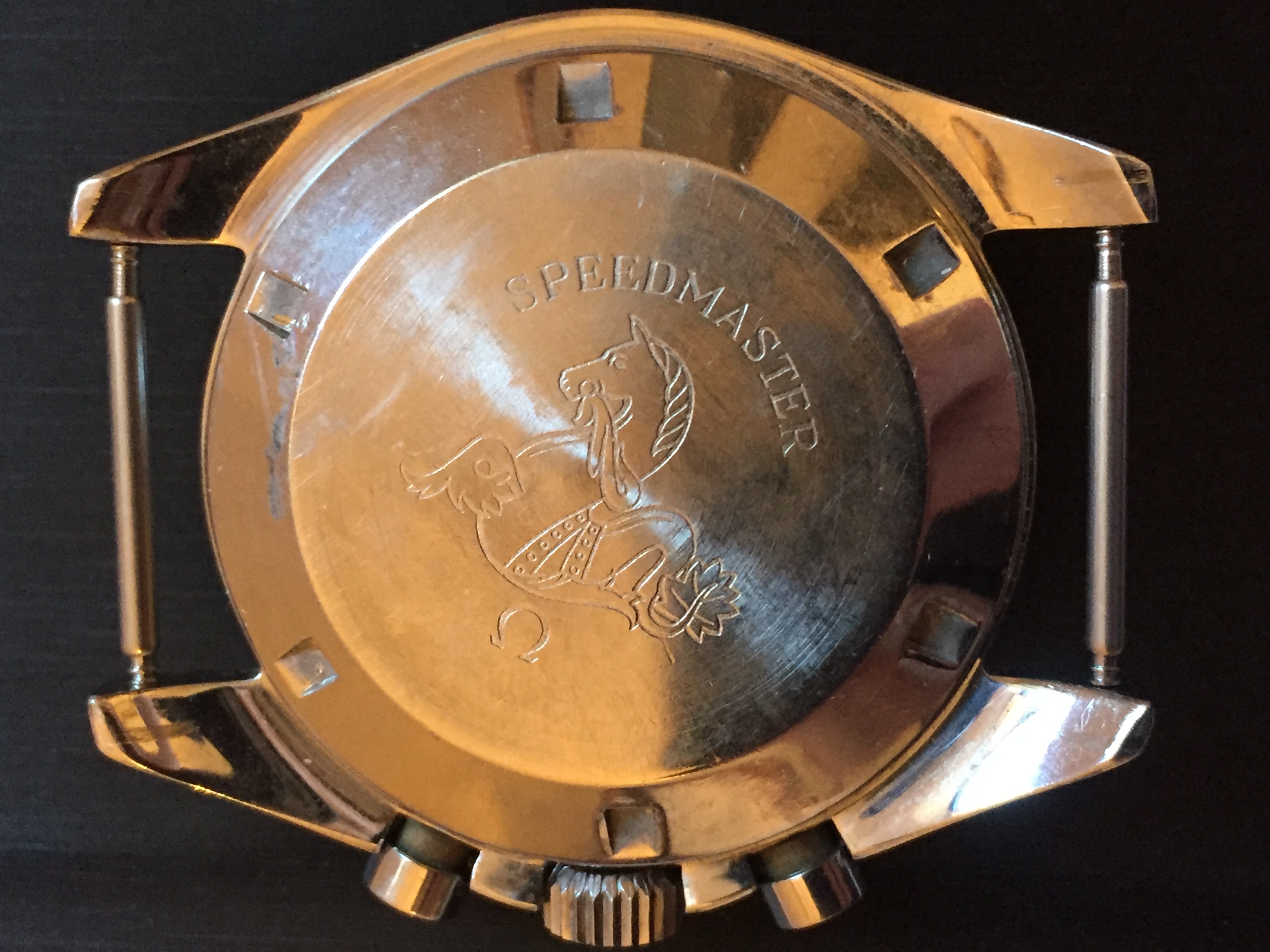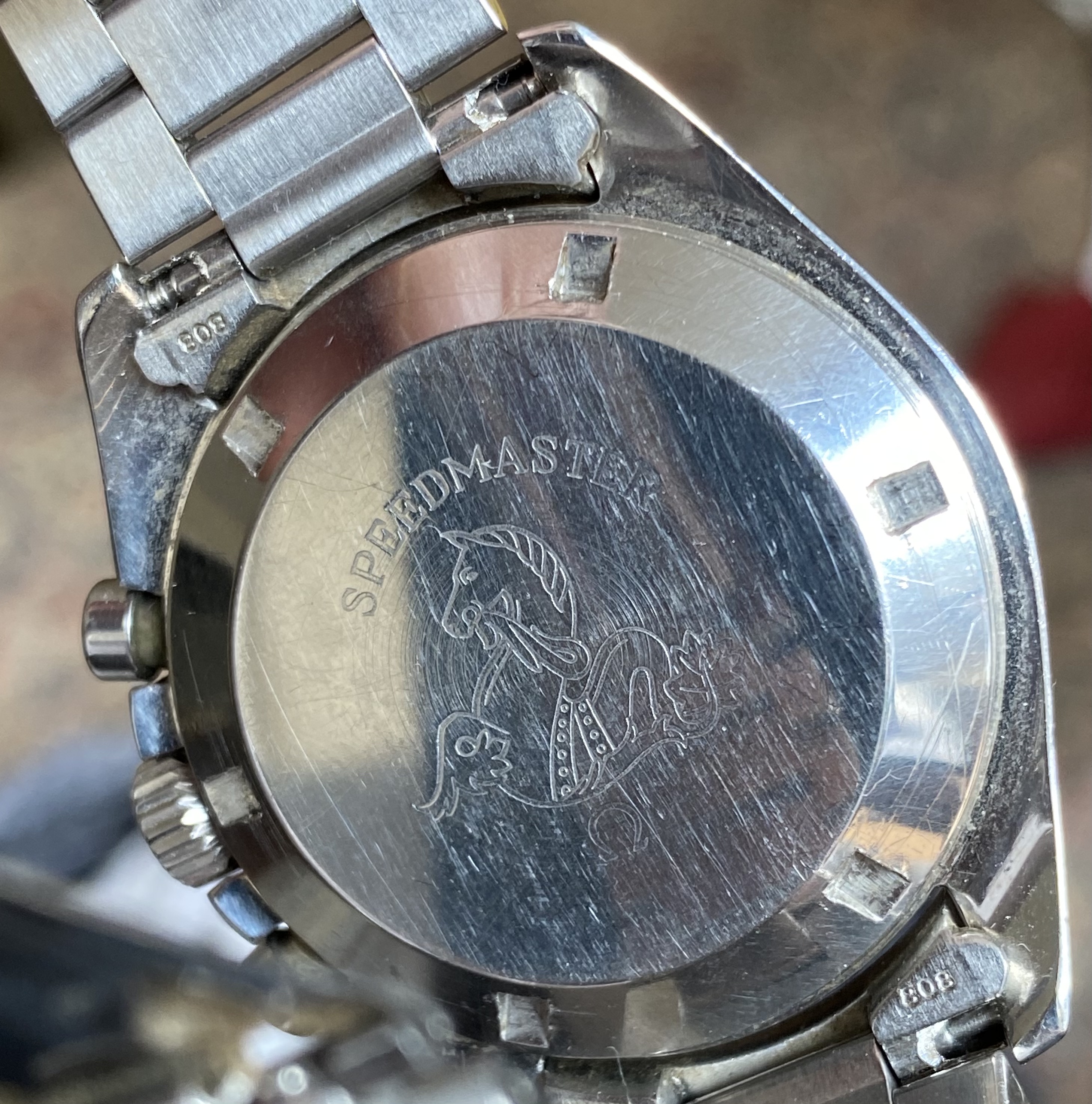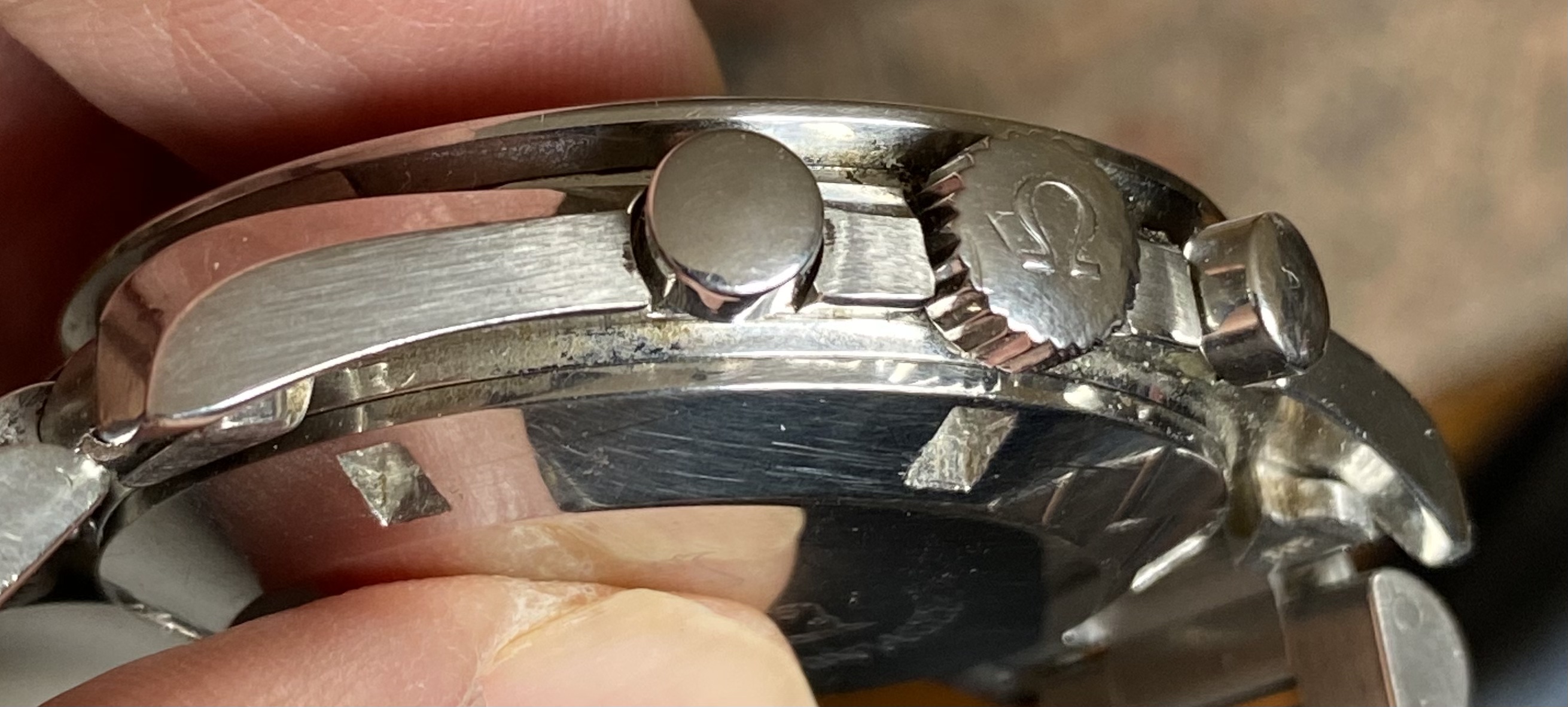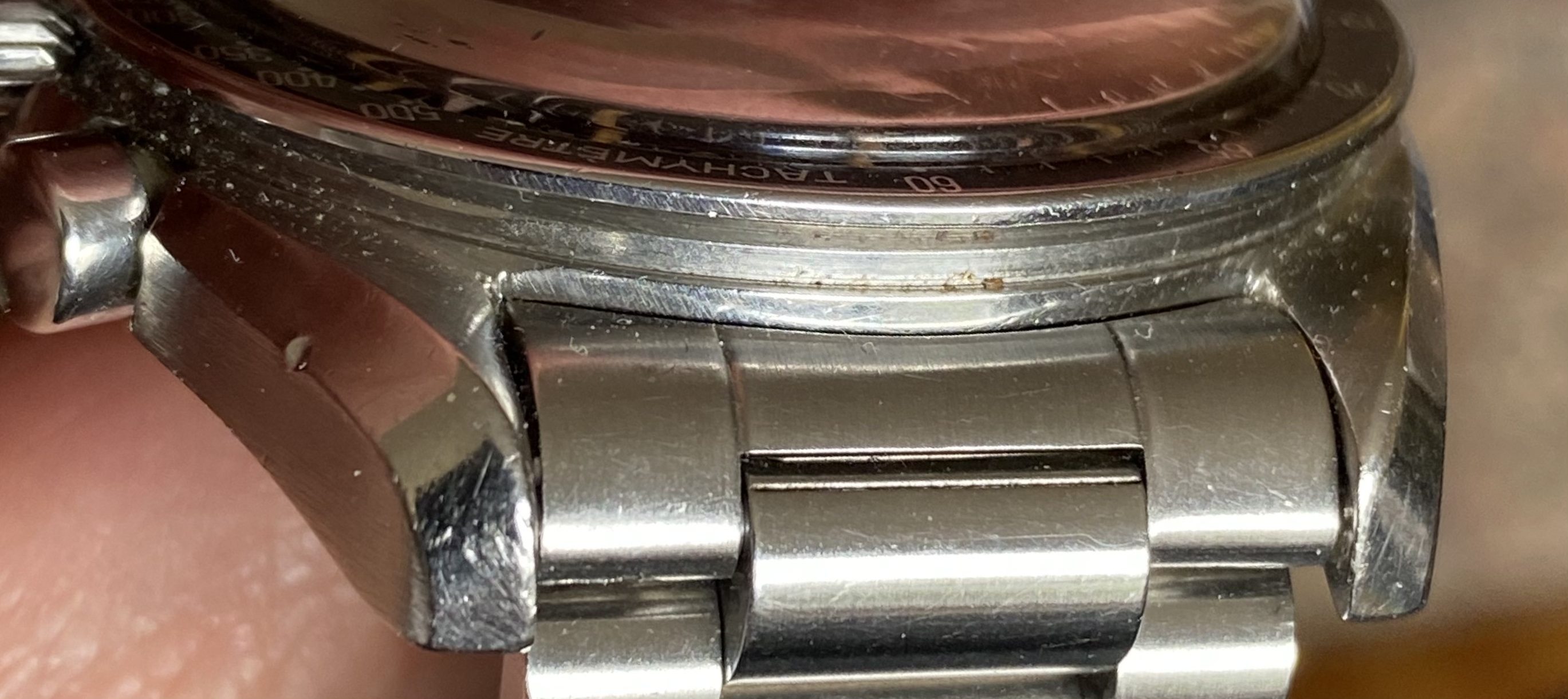 Case: Polished somewhat and worn, but still pretty decent. (To me, that doesn’t look like factory brushing on the sides.) Hippocampus clear, with traces of the factory swirl. One ding, on the edge of the two o’clock lug. Correct pushers and crown.