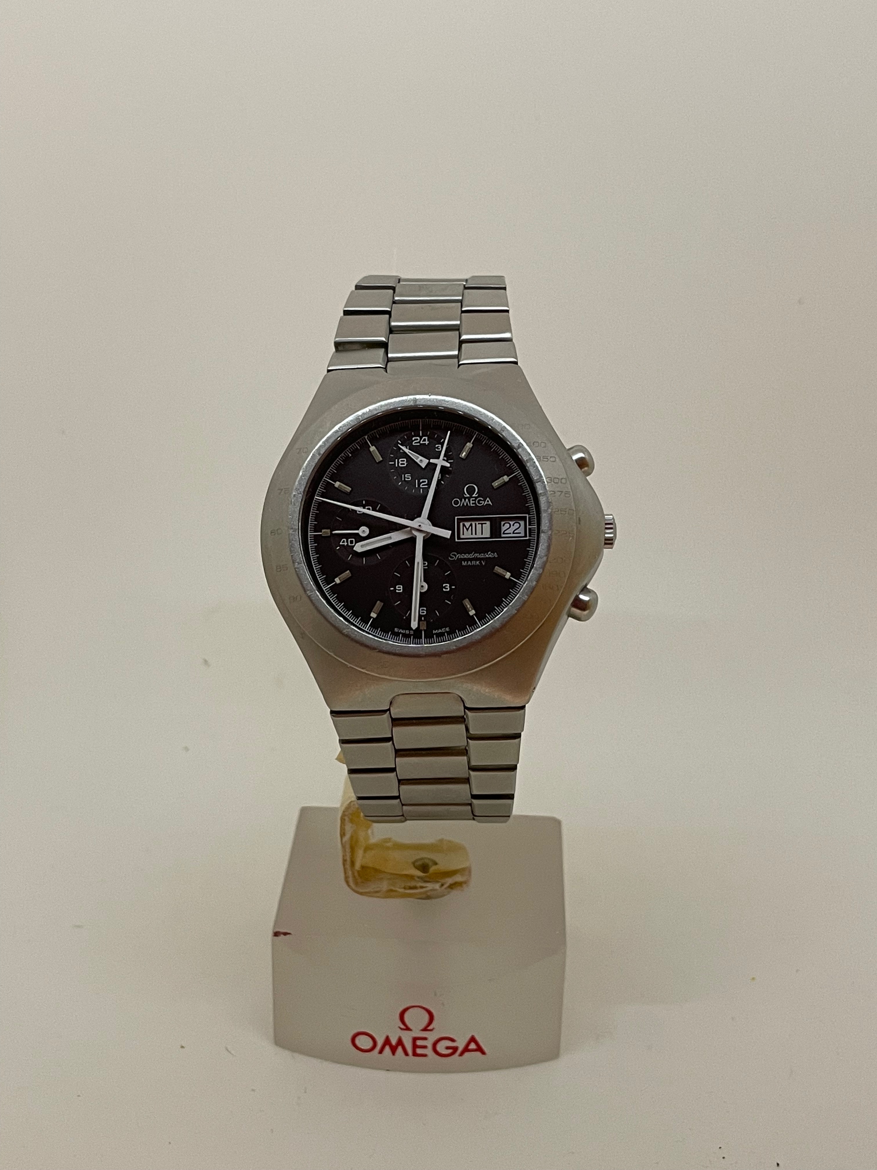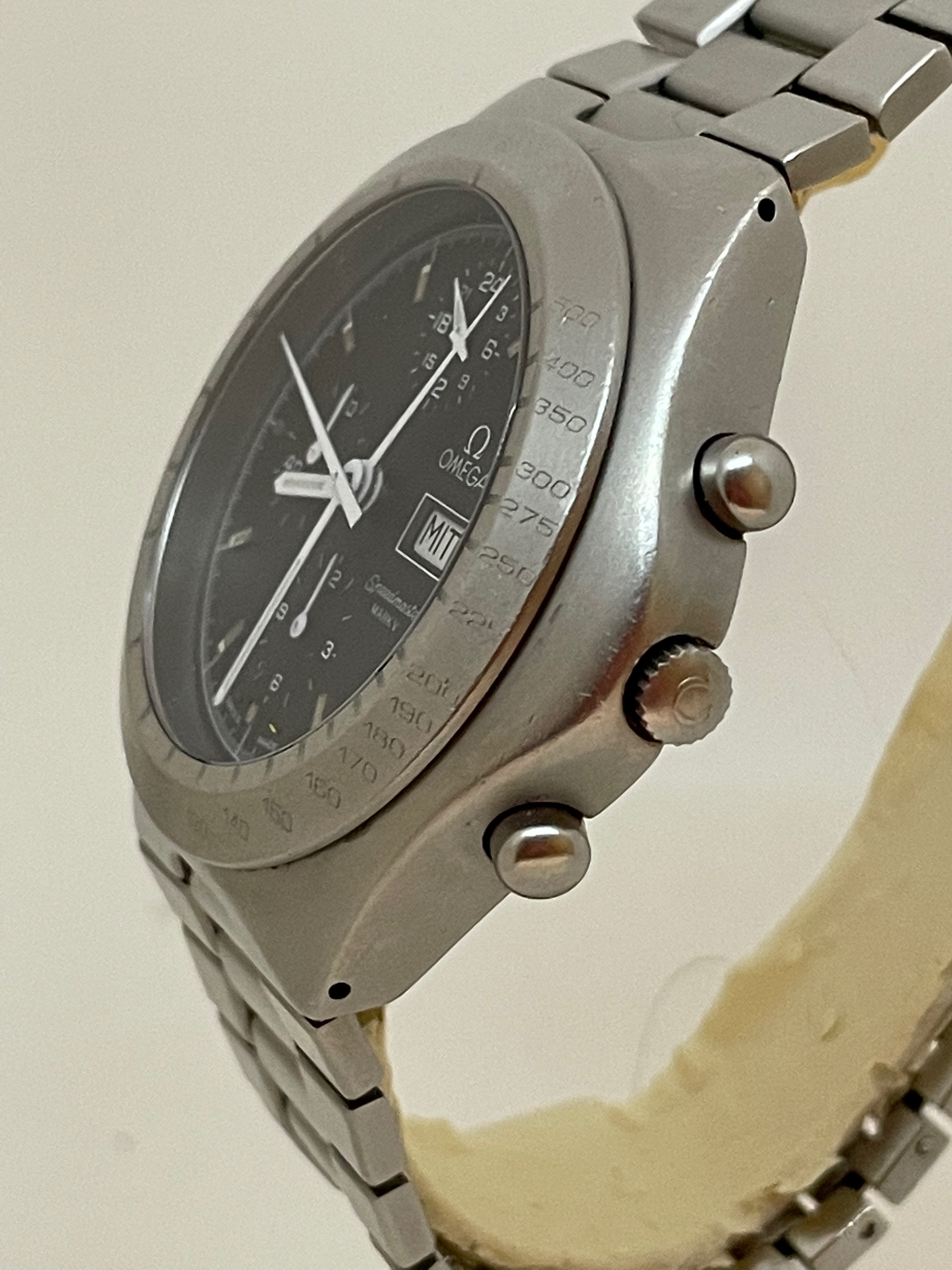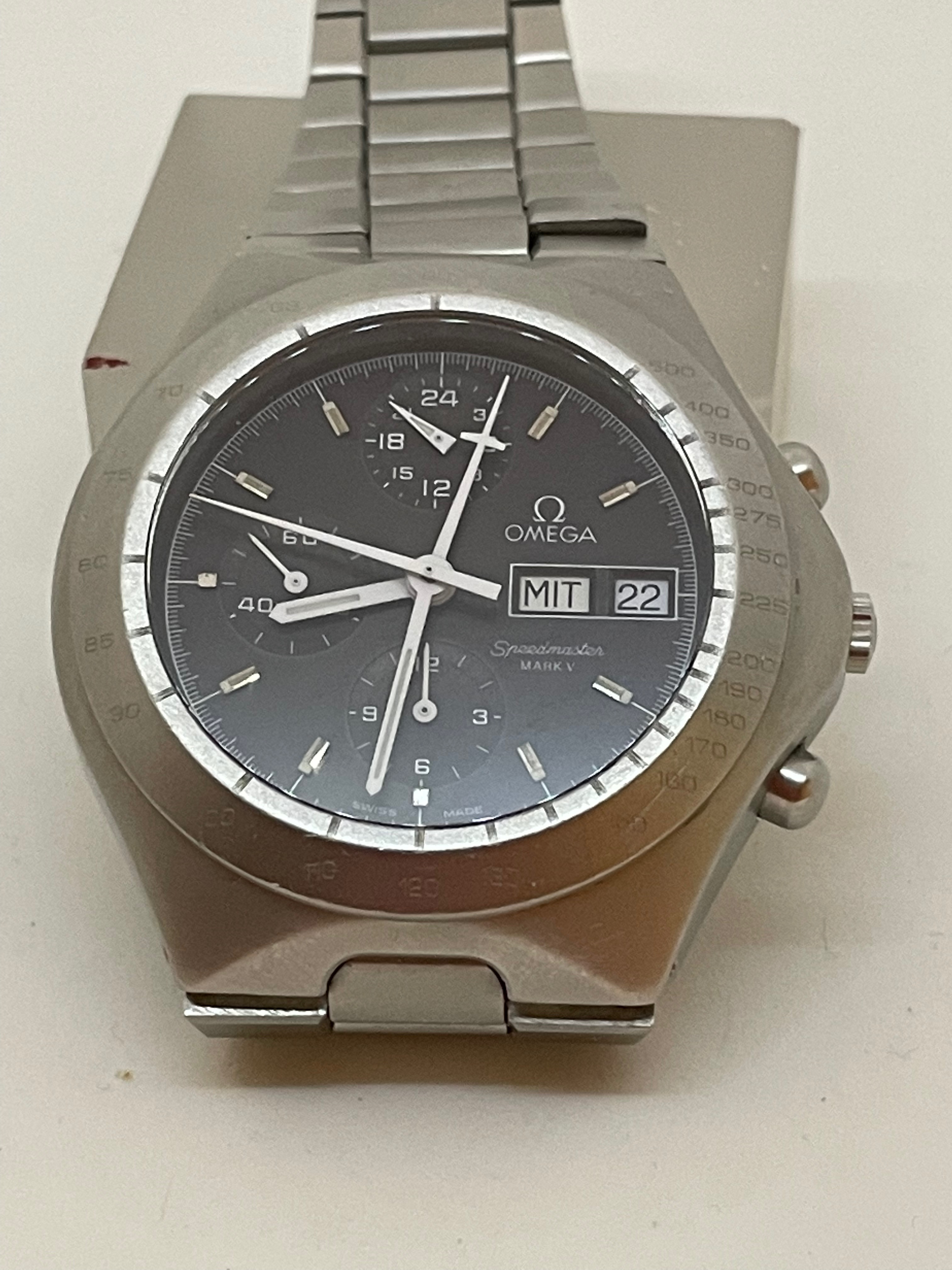 Omega Speedmaster Mark V, 376.0806. Lemania 5100 based Omega 1045 movement, stamped on caseback. Centre seconds and minute chronograph movement with external bezel. Measures 44.5 mm without crown but feels to me much like a moonwatch, at 14.2 mm thickness and integrated bracelet.