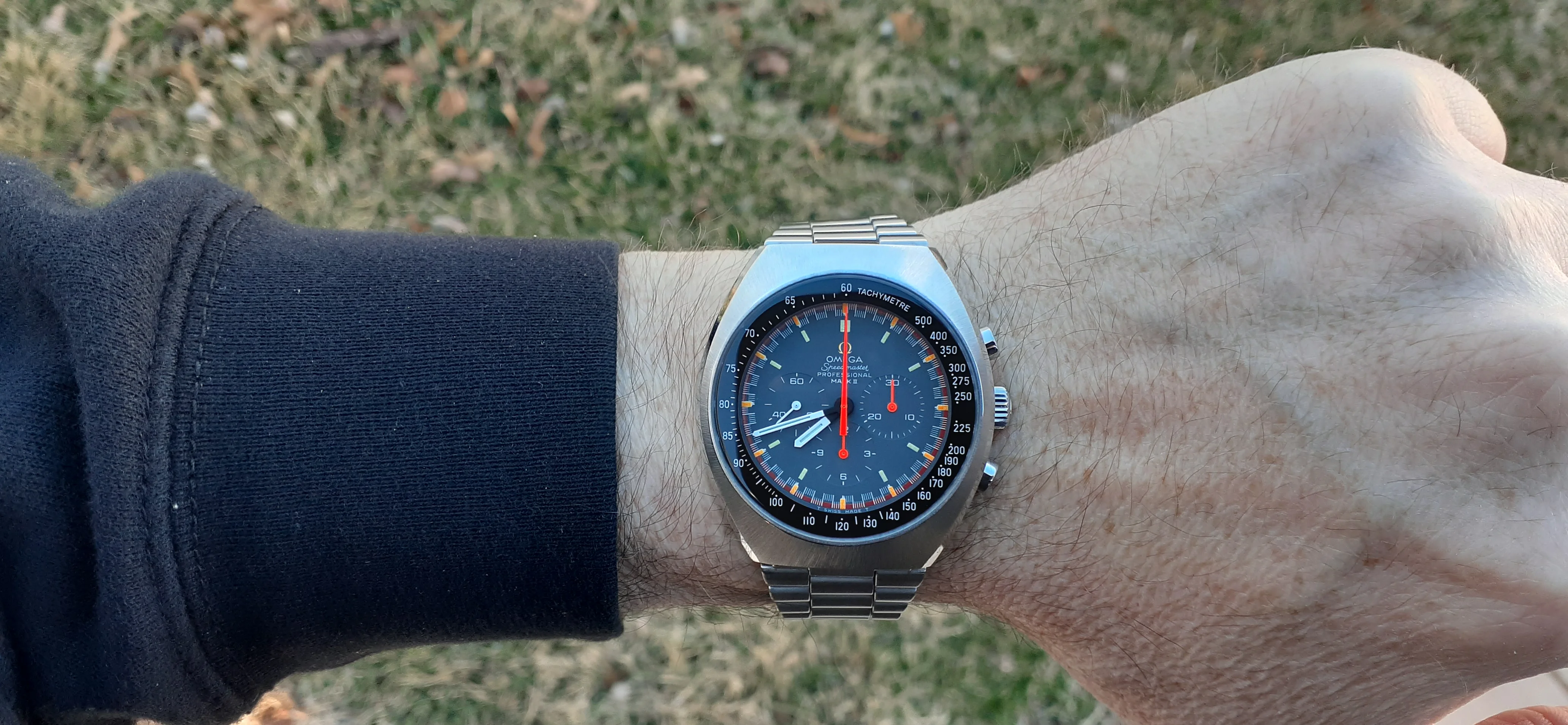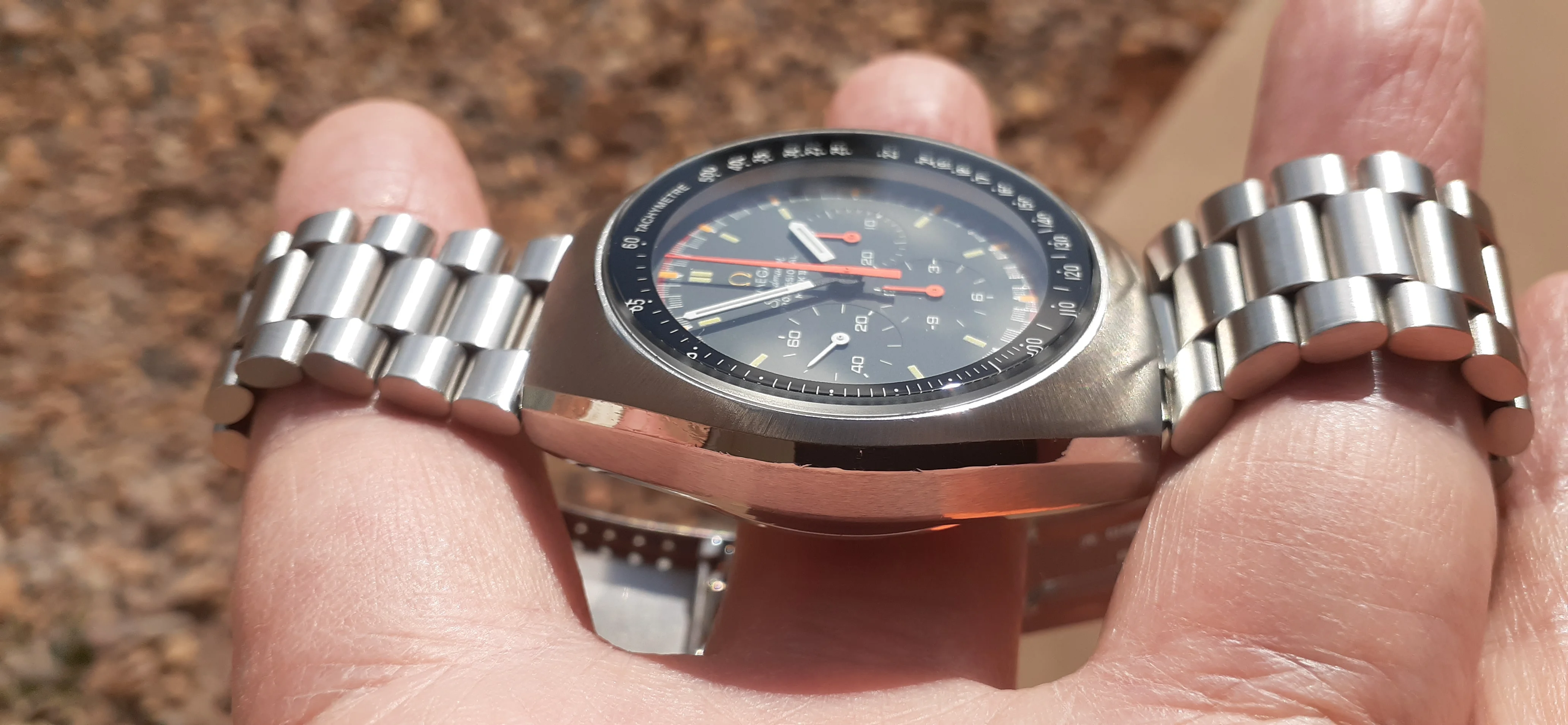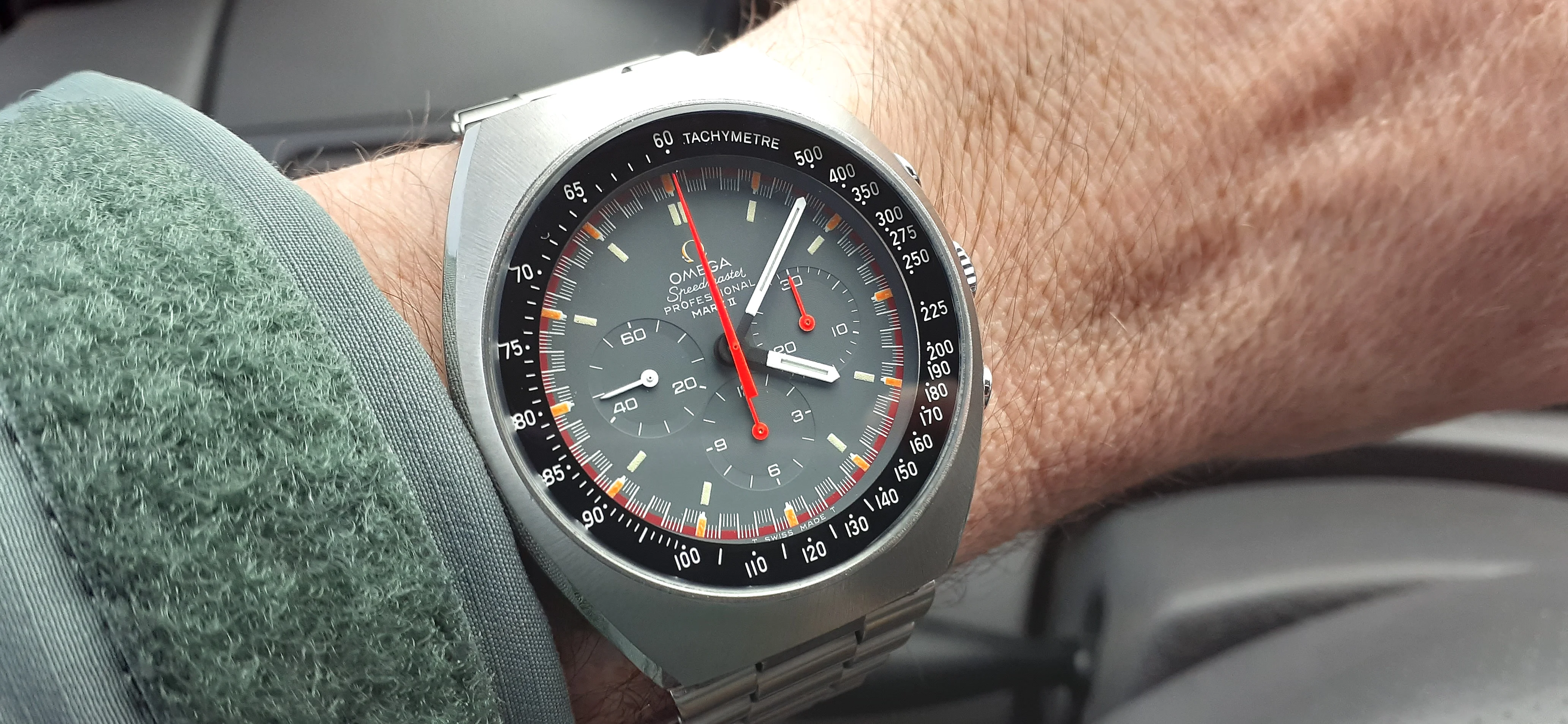 ·I am selling my Speedmaster Mark II "Racing Dial" Please look at the photos for condition. It was serviced by Nesbit's Fine Watch in Seattle in September 2022. I will include all the parts they sent back and the service paperwork proving they serviced and timed the watch. It is a great looking watch but it is vintage, not brand-new. Nesbit's polished the facets on the sides of the case but you can still see where deep dings were before service. The back is polished the most but the Omega hippocampus is still sharp. It has a clear watch crystal protector on it (I don't like scratched mineral crystals) but you can pry it off with a fingernail. It is running fine and the sub-registers reset correctly.