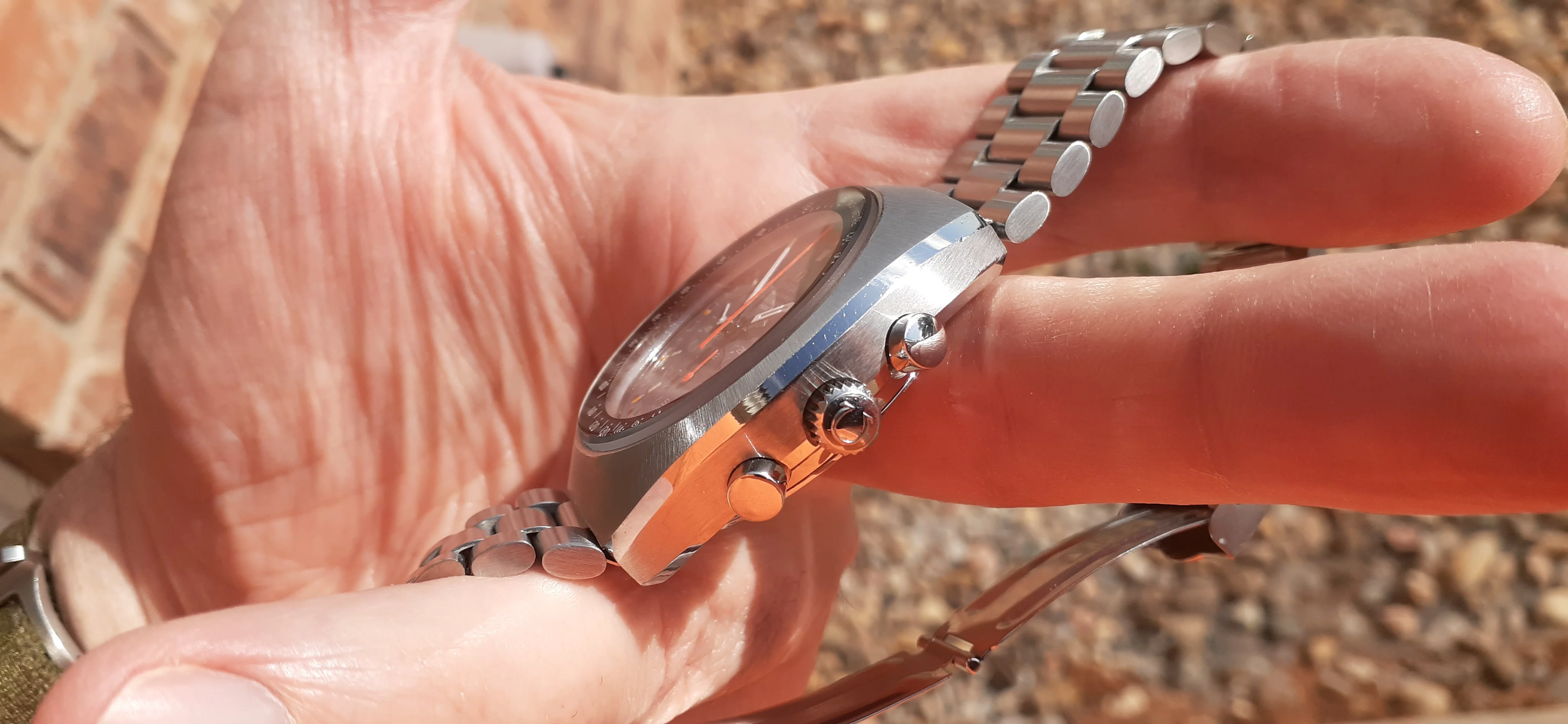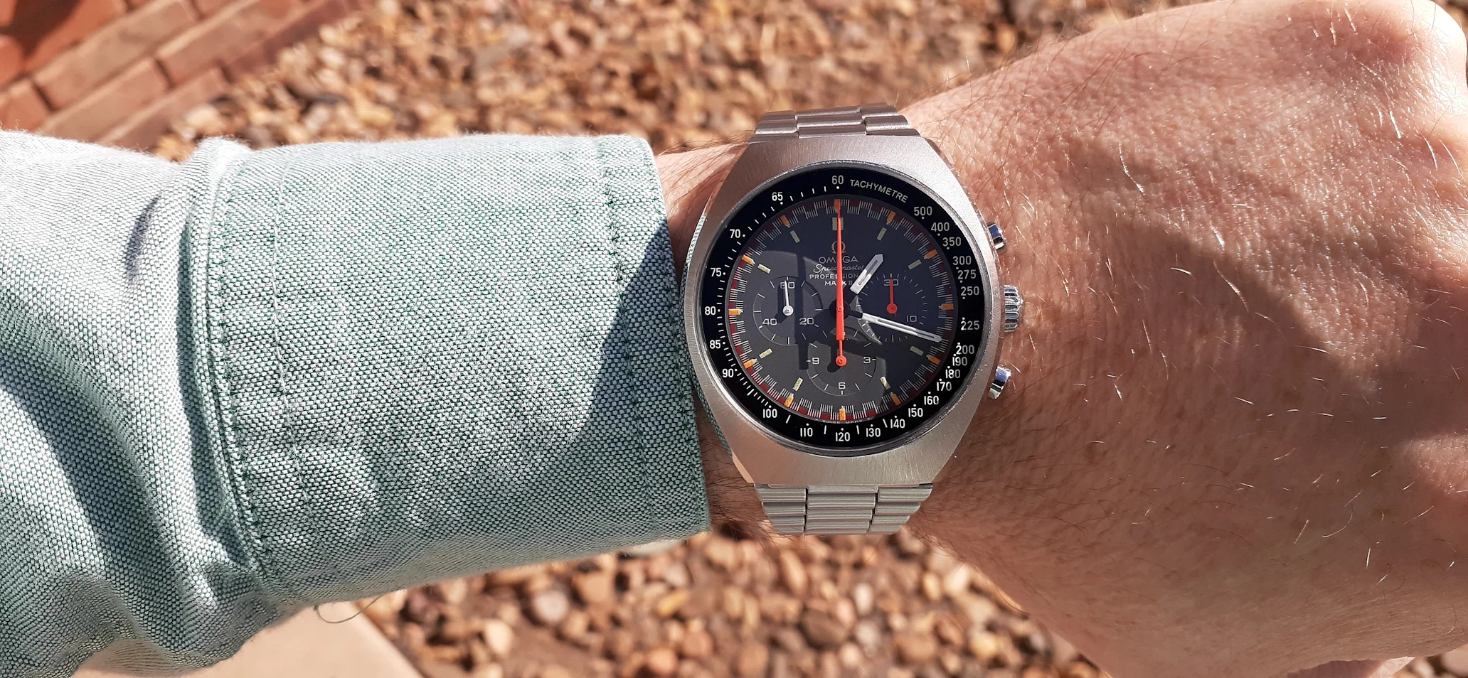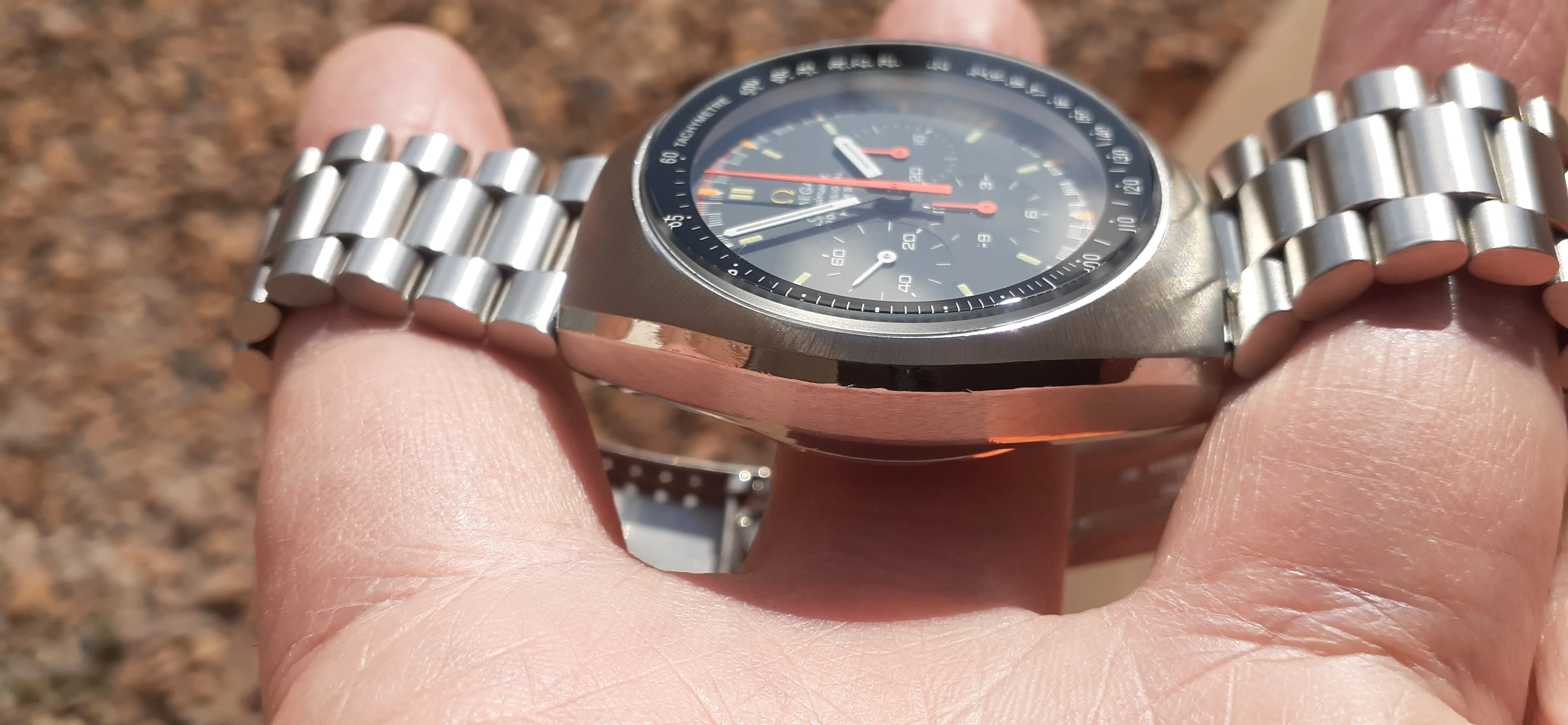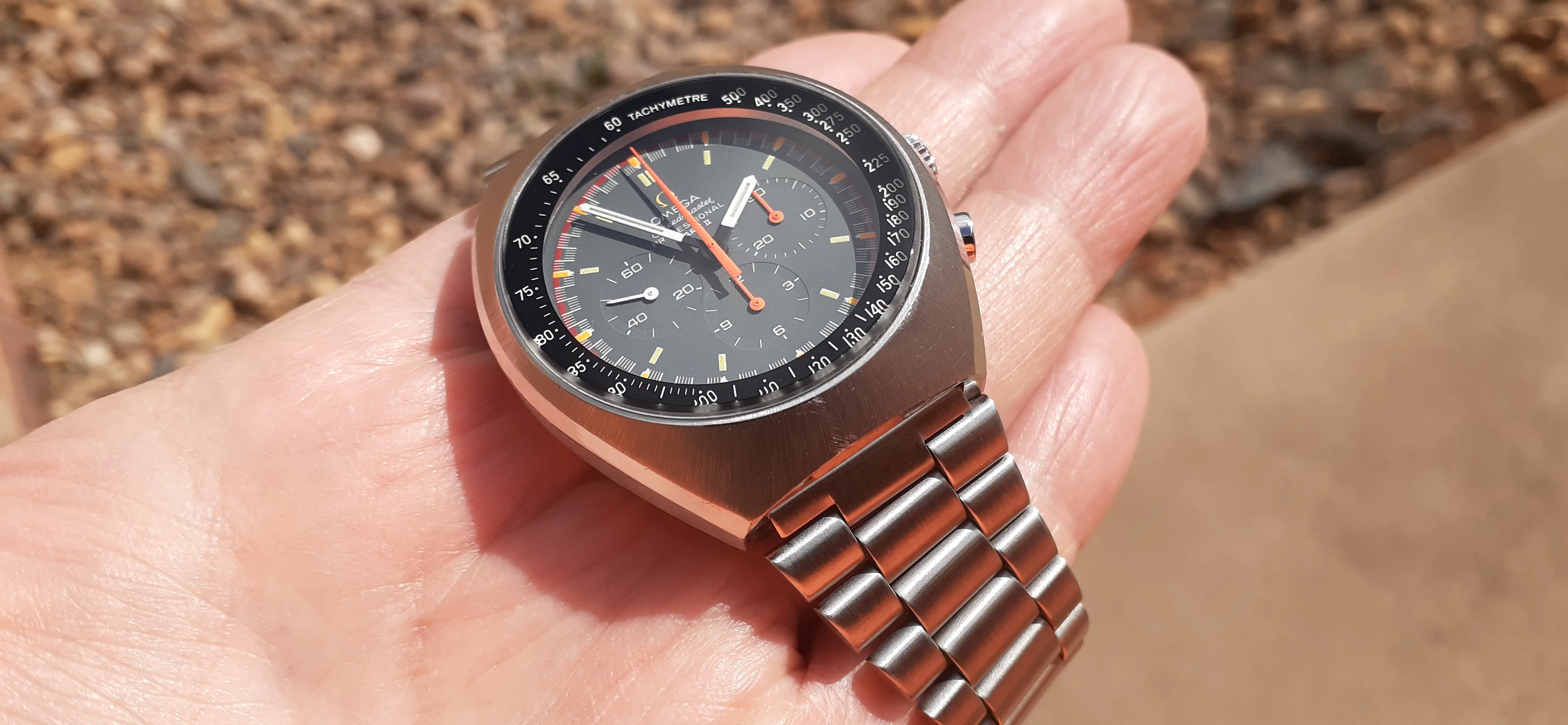 ·I am selling my Speedmaster Mark II "Racing Dial" Please look at the photos for condition. It was serviced by Nesbit's Fine Watch in Seattle in September 2022. I will include all the parts they sent back and the service paperwork proving they serviced and timed the watch. It is a great looking watch but it is vintage, not brand-new. Nesbit's polished the facets on the sides of the case but you can still see where deep dings were before service. The back is polished the most but the Omega hippocampus is still sharp. It has a clear watch crystal protector on it (I don't like scratched mineral crystals) but you can pry it off with a fingernail. It is running fine and the sub-registers reset correctly.